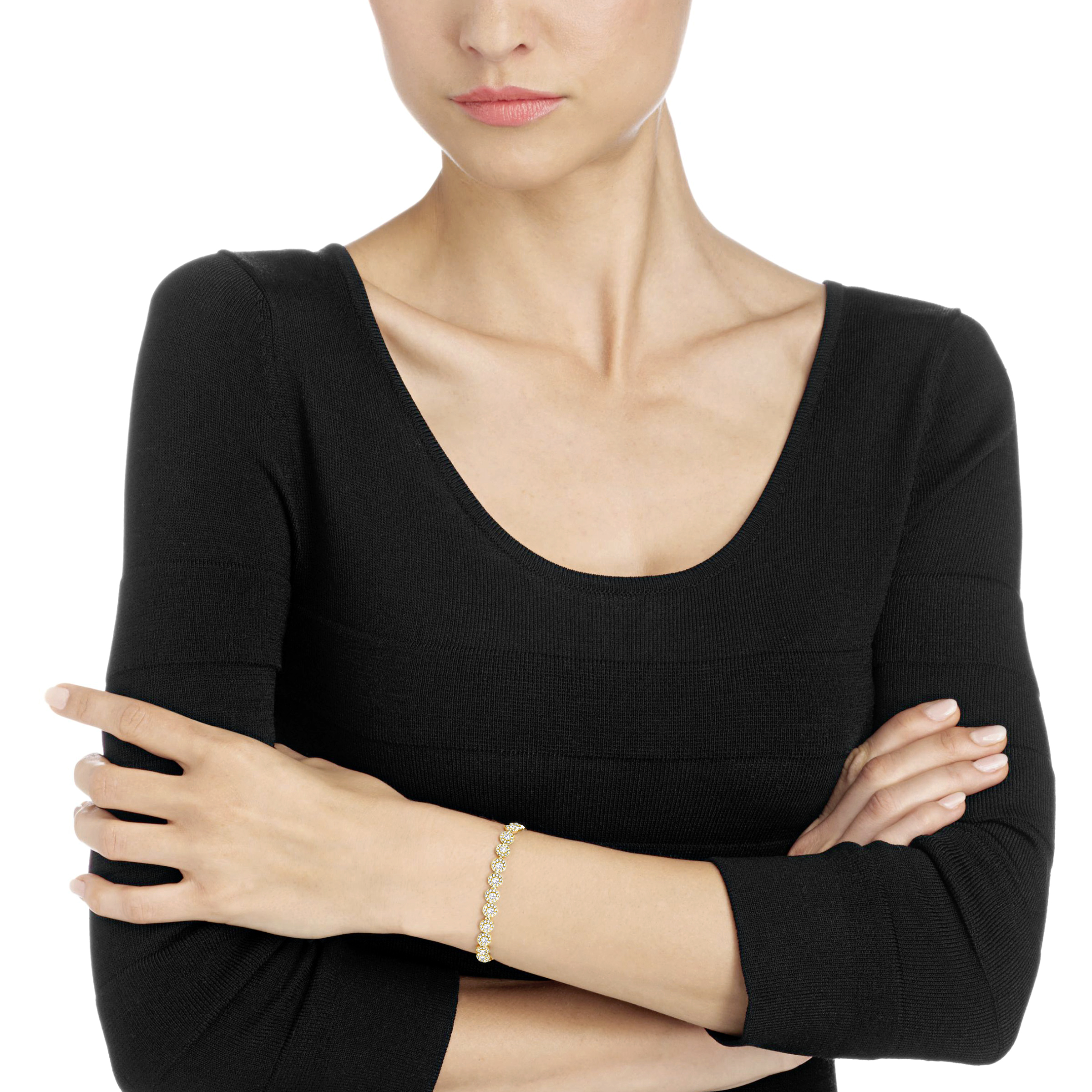 Saf, zamansız bir seçkinlik. Altın rengi kaplama Tennis bileklik üzerinde her biri berrak kristal pavé ile çerçevelenmiş bir dizi yuvarlak berrak kristal görülüyor. Una Angelic ailesinden farklı parçalarla mükemmel bir uyum yakalayan tasarım, muazzam bir hediye olabilir.