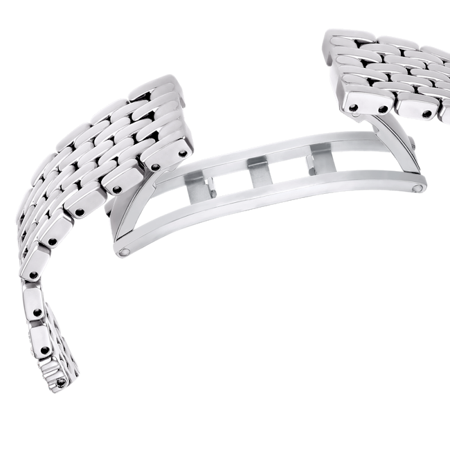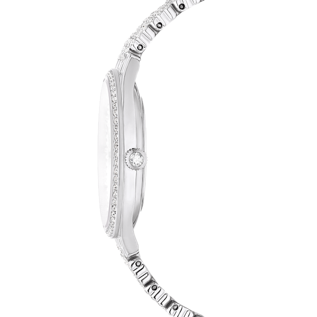 Etkileyici 433 adet kristal kullanılarak üretilmiş bu İsviçre üretimi saat, paslanmaz çeliğin sade güzelliğini gözler önüne seriyor. Saatin şık çerçevesi ve bilekliği tasarıma özgü baş döndürücü pavé berrak kristallerle süslenirken, gümüş rengi guilloche kadran üzerinde kristal gösterge işaretleri yer alıyor. 30 mm’lik saat 50 metreye kadar suya dayanıklıdır ve crown üzerinde yer alan bir tek taşı gözler önüne serer. Saatin genel görünümü, kıyafetlerinizden bağımsız olarak sade fakat çarpıcı bir etki yaratması için tasarlandı.