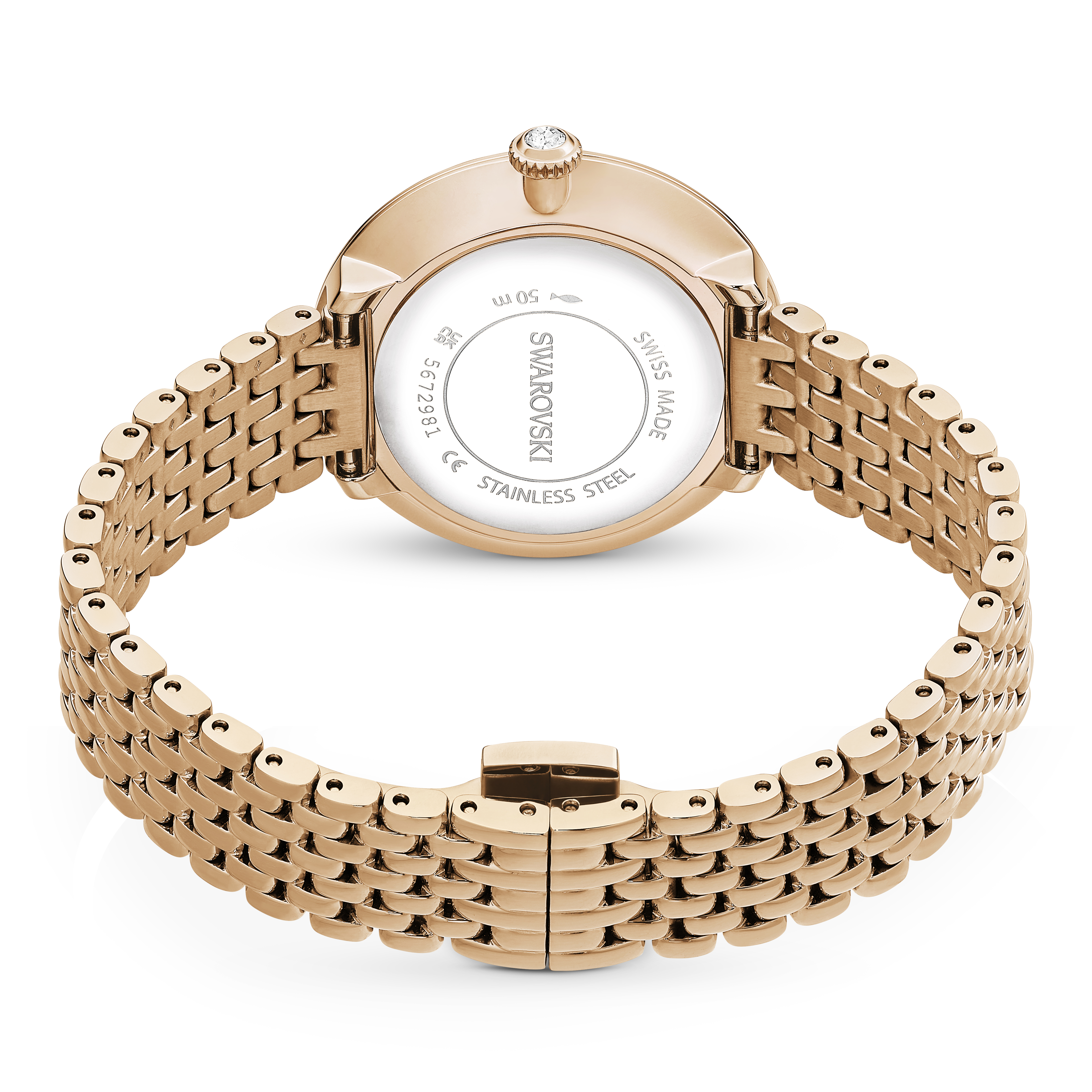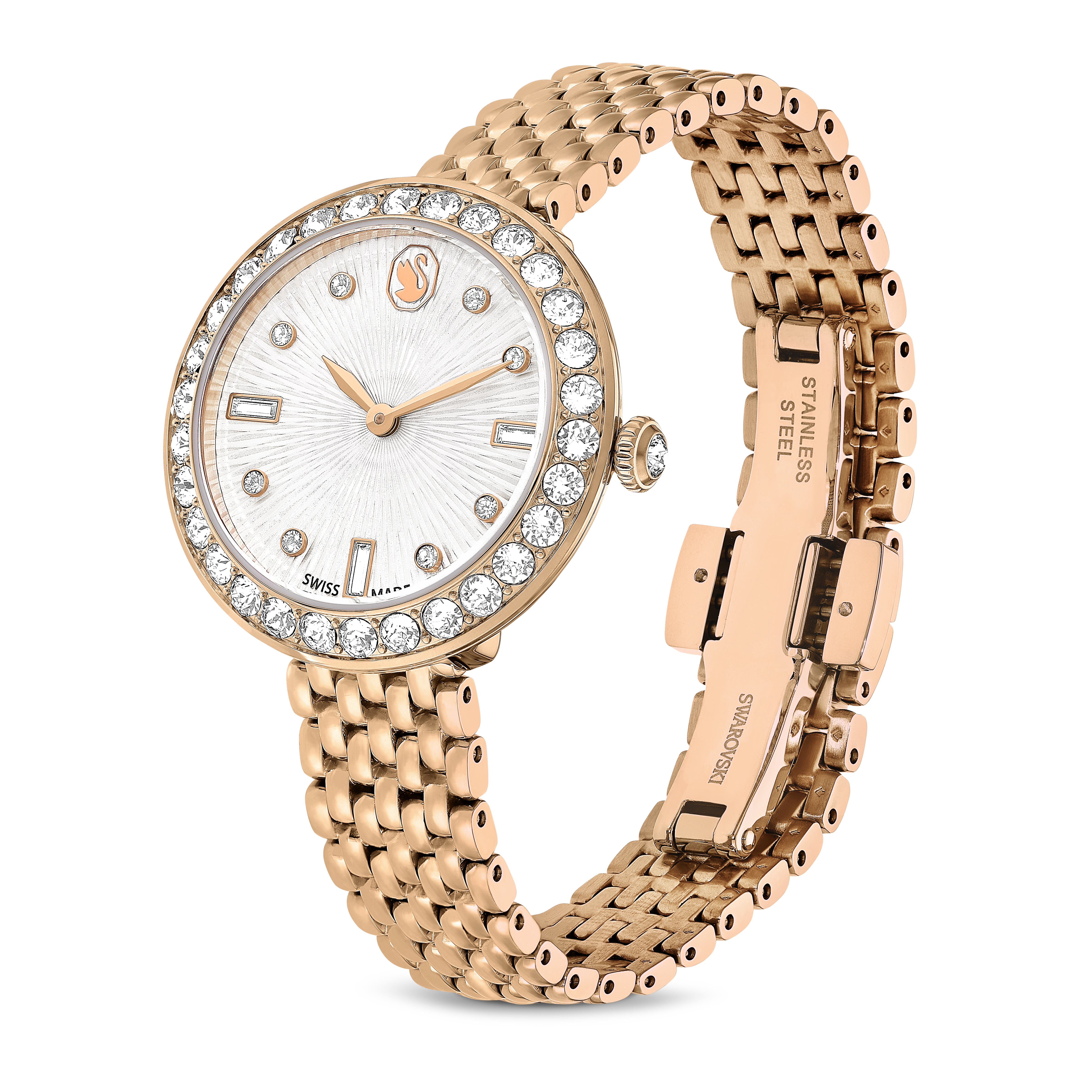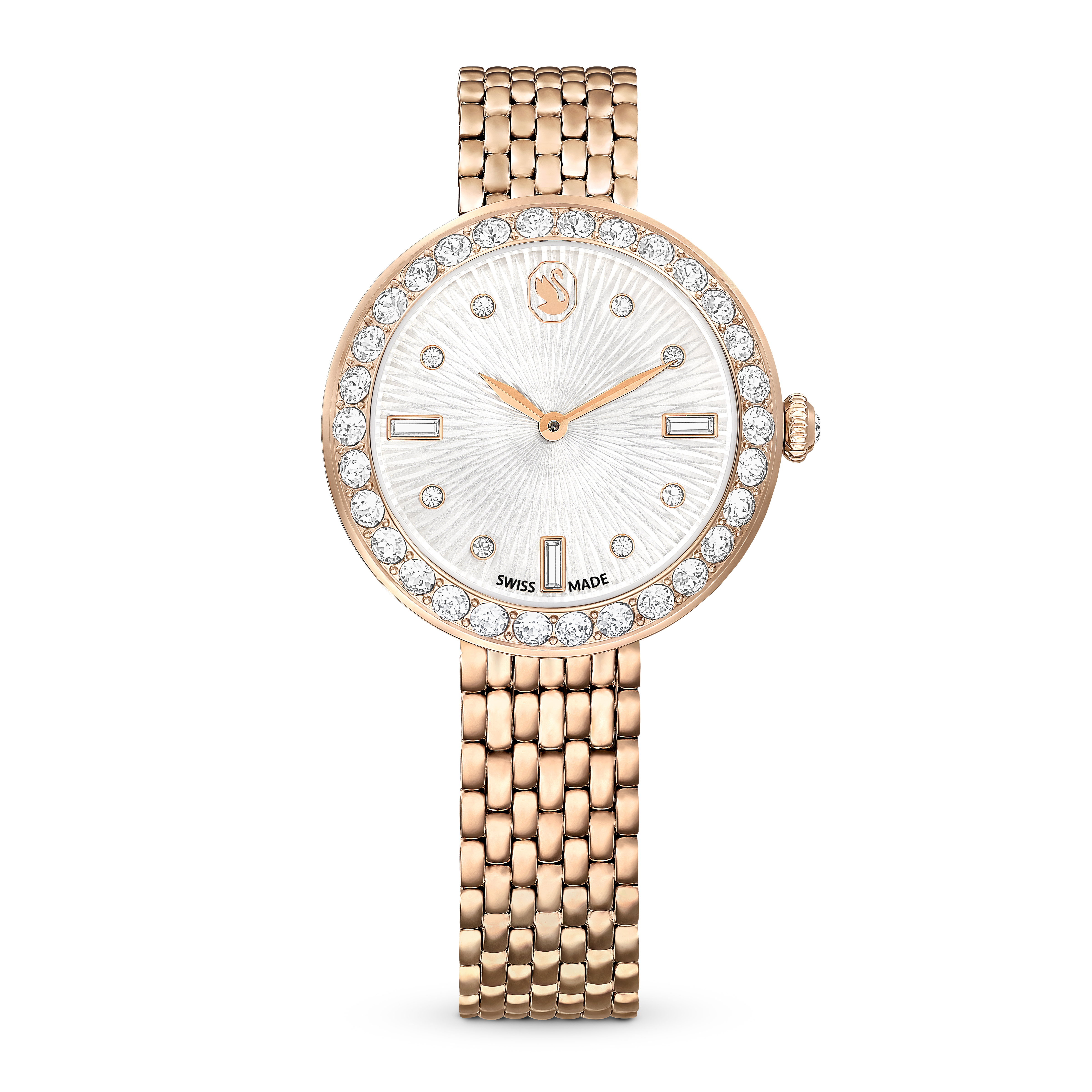 Bu Certa saat, çağdaş styling’i Swarovski’nin benzersiz savoir-faire’iyle zahmetsizce harmanlıyor. Son derece güzel pembe altın rengi bir yüzeyle tasarlanan 30 mm yuvarlak kasa, 30 kristalin pavé tekniğiyle yerleştirildiği bir çerçeve ile tamamlandı. Mineral camın altında, saat 12 yönünde Swarovski kuğu logosuna ve yuvarlak ve baget kristallerle tasarlanan gösterge işaretlerine yer veren baş döndürücü guilloché bir kadran öne çıkıyor. Ayrıca saatin kurma koluna da tek bir kristal yerleştirildi. Saat; bileğinizin çevresini güzel bir tarzla saracak şekilde yedi bağlantı halkasına sahip altın rengi yüzeyli bir bileklik üzerinde sunuluyor. 50 m’ye kadar suya dayanıklı olan bu İsviçre yapımı saat, sizi günlük etkinliklerinize üstün seçkinlikten ödün vermeden tam zamanında yetiştirecek şekilde tasarlandı.
