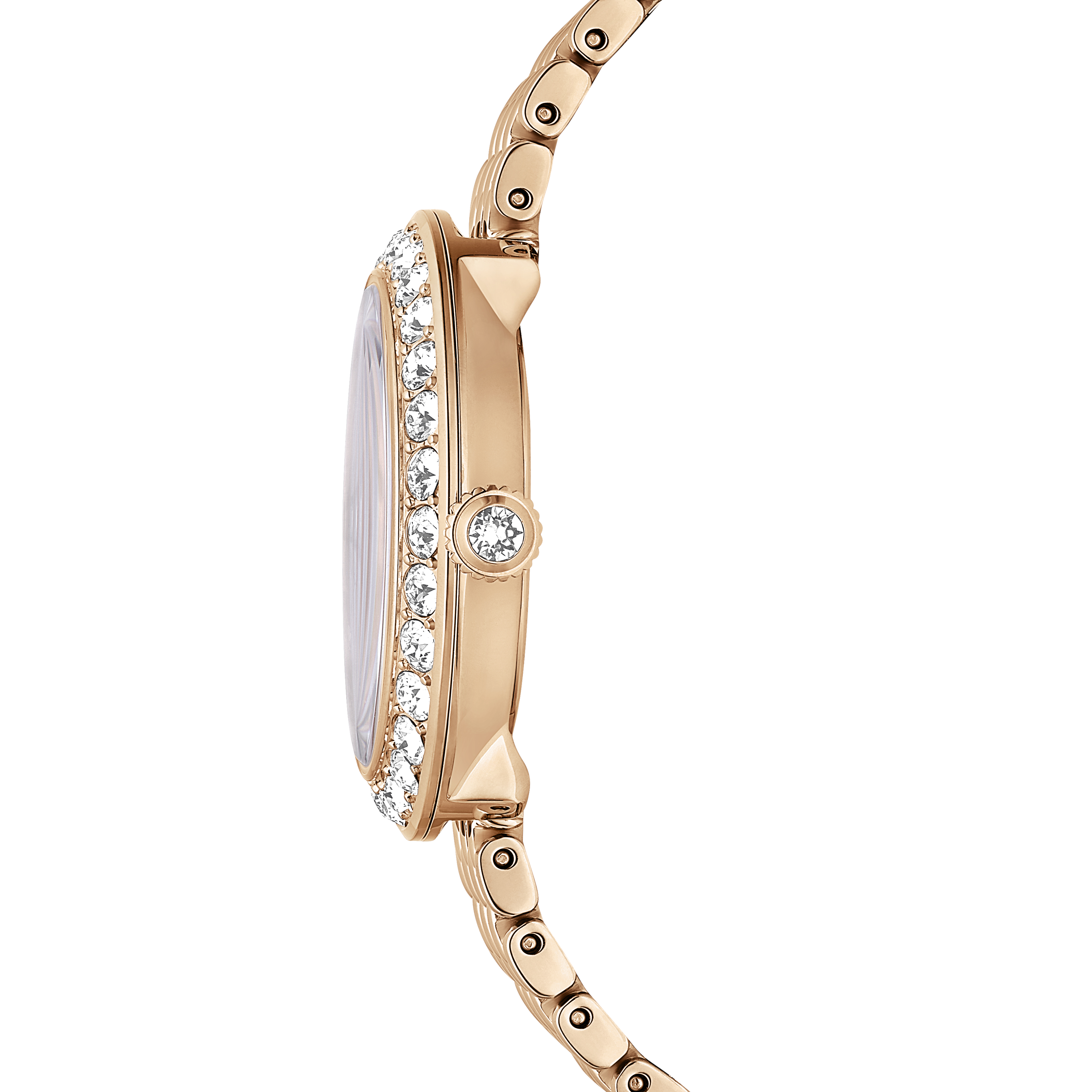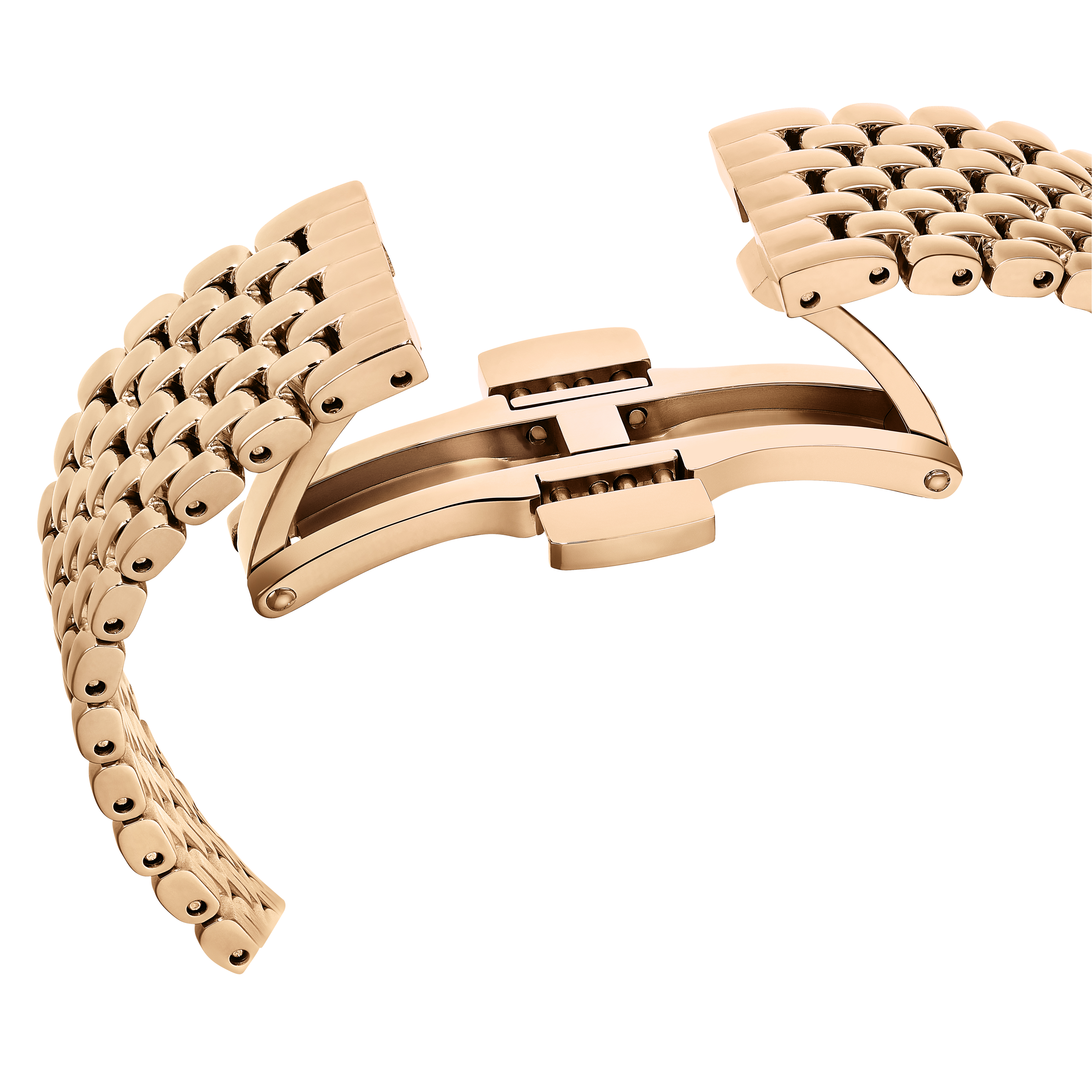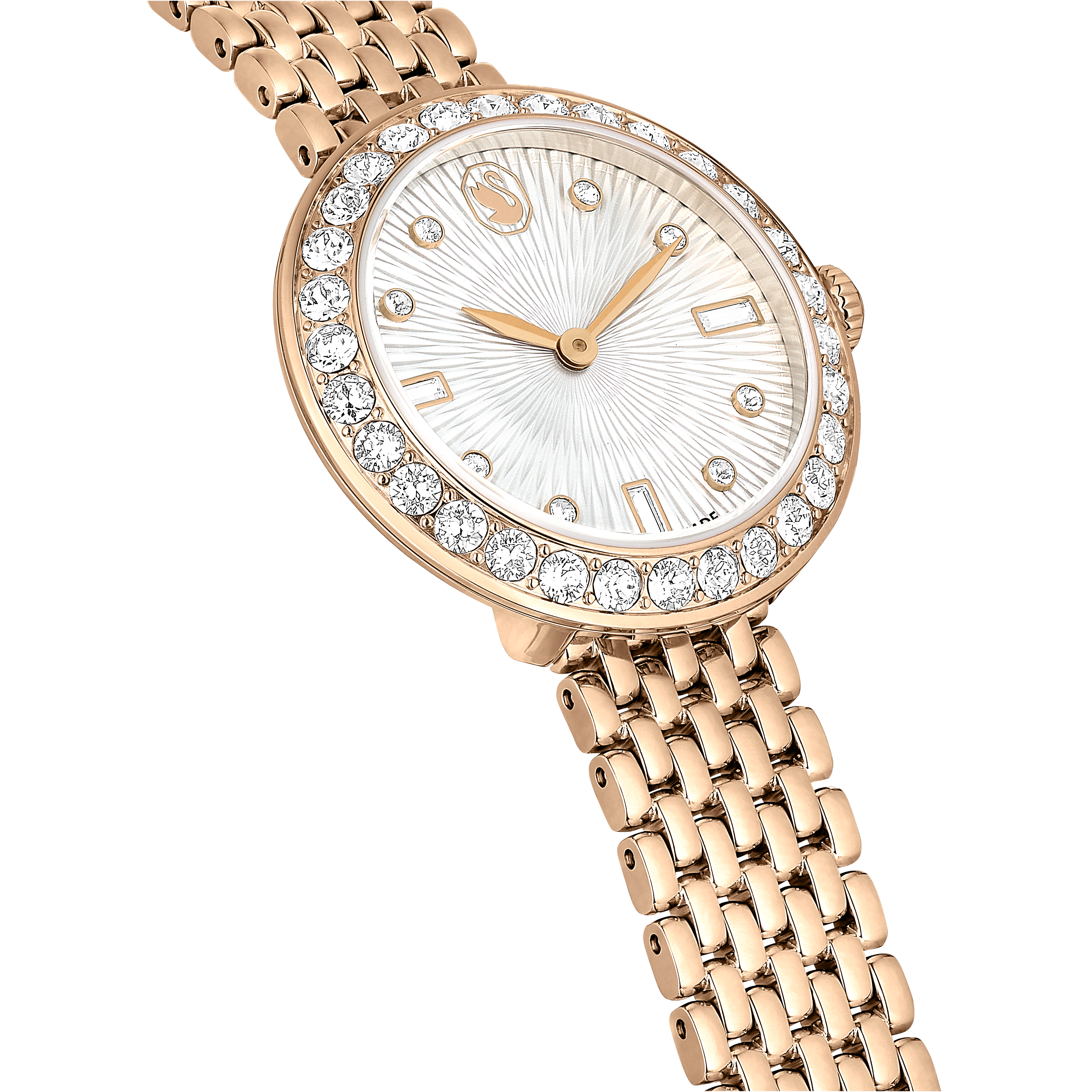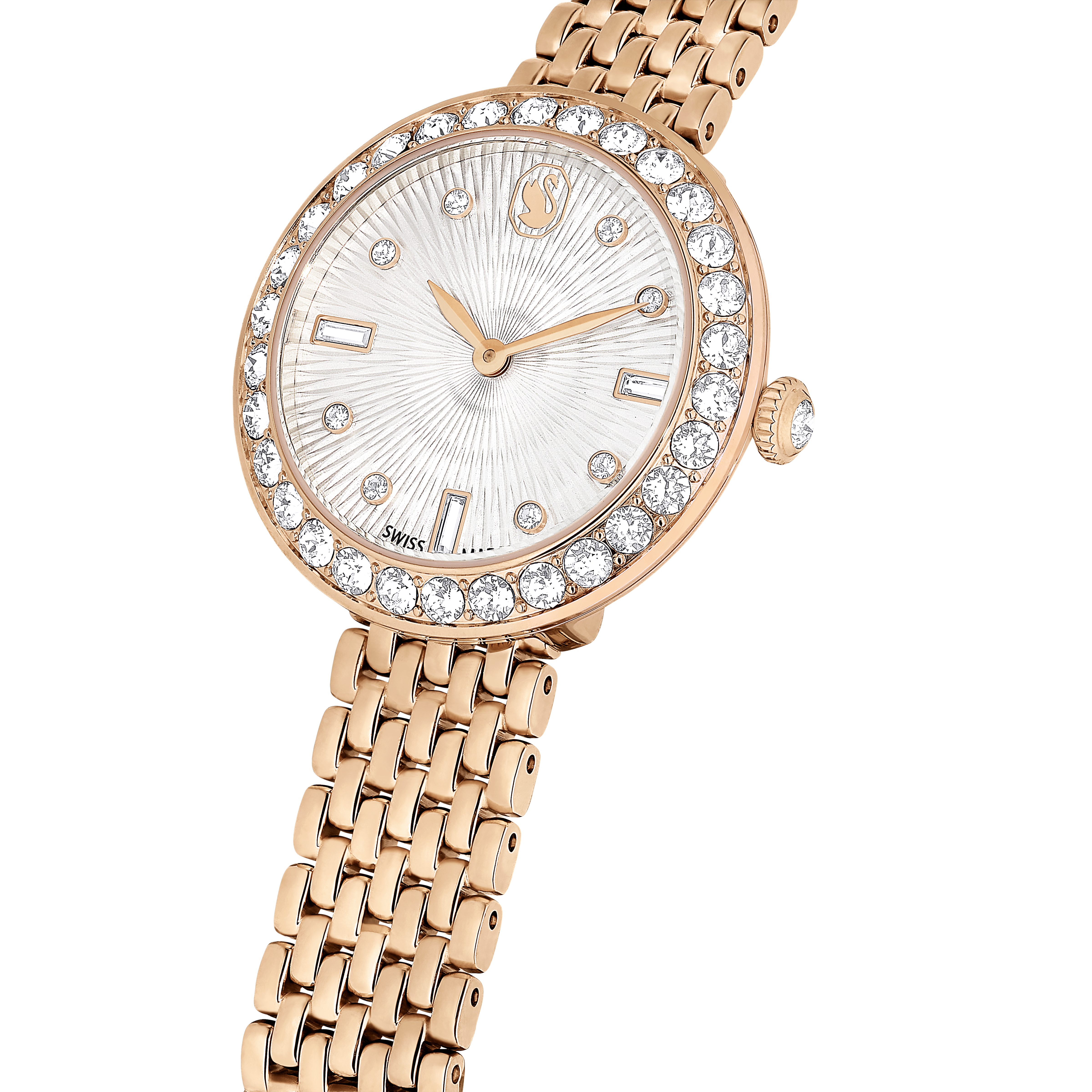 Bu Certa saat, çağdaş styling’i Swarovski’nin benzersiz savoir-faire’iyle zahmetsizce harmanlıyor. Son derece güzel pembe altın rengi bir yüzeyle tasarlanan 30 mm yuvarlak kasa, 30 kristalin pavé tekniğiyle yerleştirildiği bir çerçeve ile tamamlandı. Mineral camın altında, saat 12 yönünde Swarovski kuğu logosuna ve yuvarlak ve baget kristallerle tasarlanan gösterge işaretlerine yer veren baş döndürücü guilloché bir kadran öne çıkıyor. Ayrıca saatin kurma koluna da tek bir kristal yerleştirildi. Saat; bileğinizin çevresini güzel bir tarzla saracak şekilde yedi bağlantı halkasına sahip altın rengi yüzeyli bir bileklik üzerinde sunuluyor. 50 m’ye kadar suya dayanıklı olan bu İsviçre yapımı saat, sizi günlük etkinliklerinize üstün seçkinlikten ödün vermeden tam zamanında yetiştirecek şekilde tasarlandı.