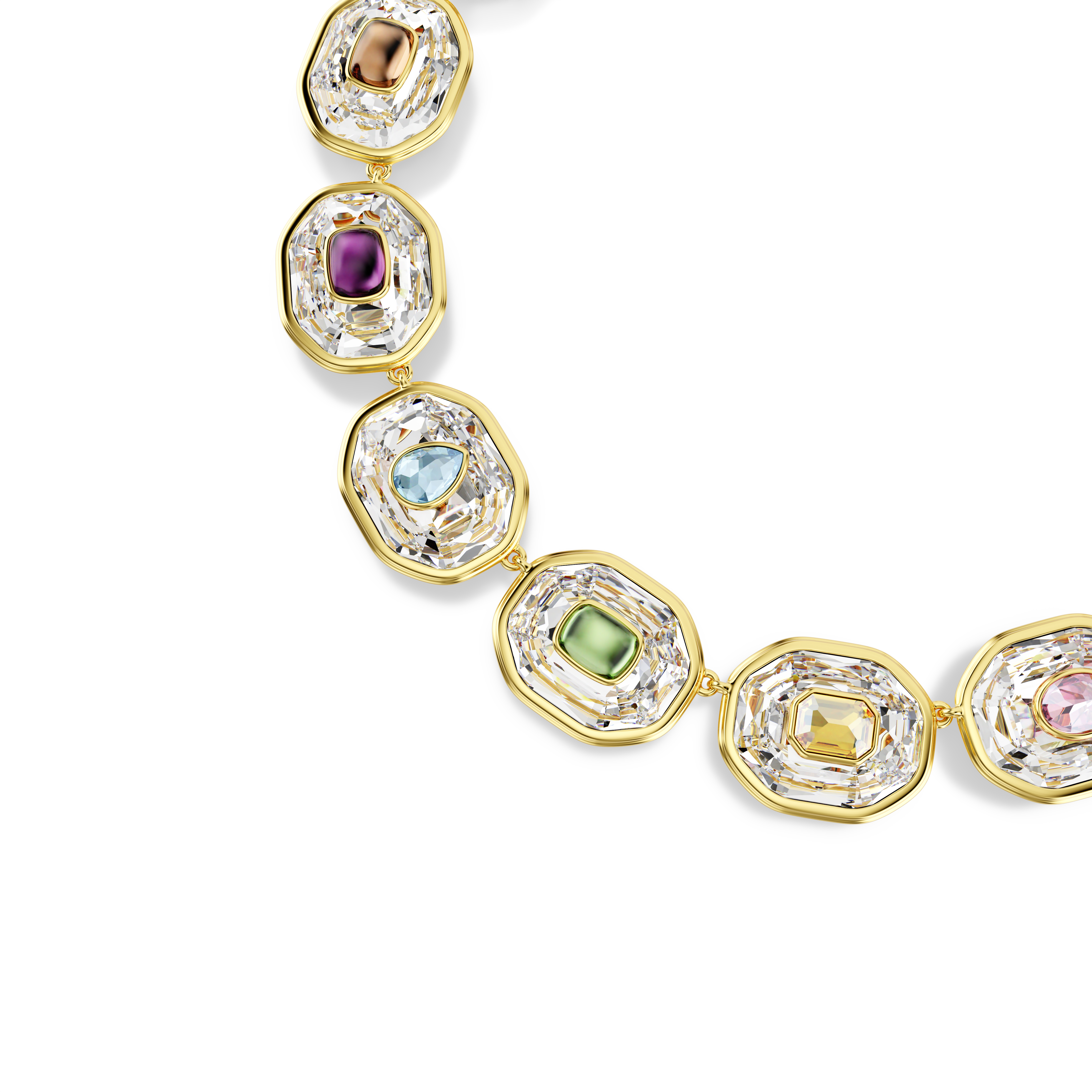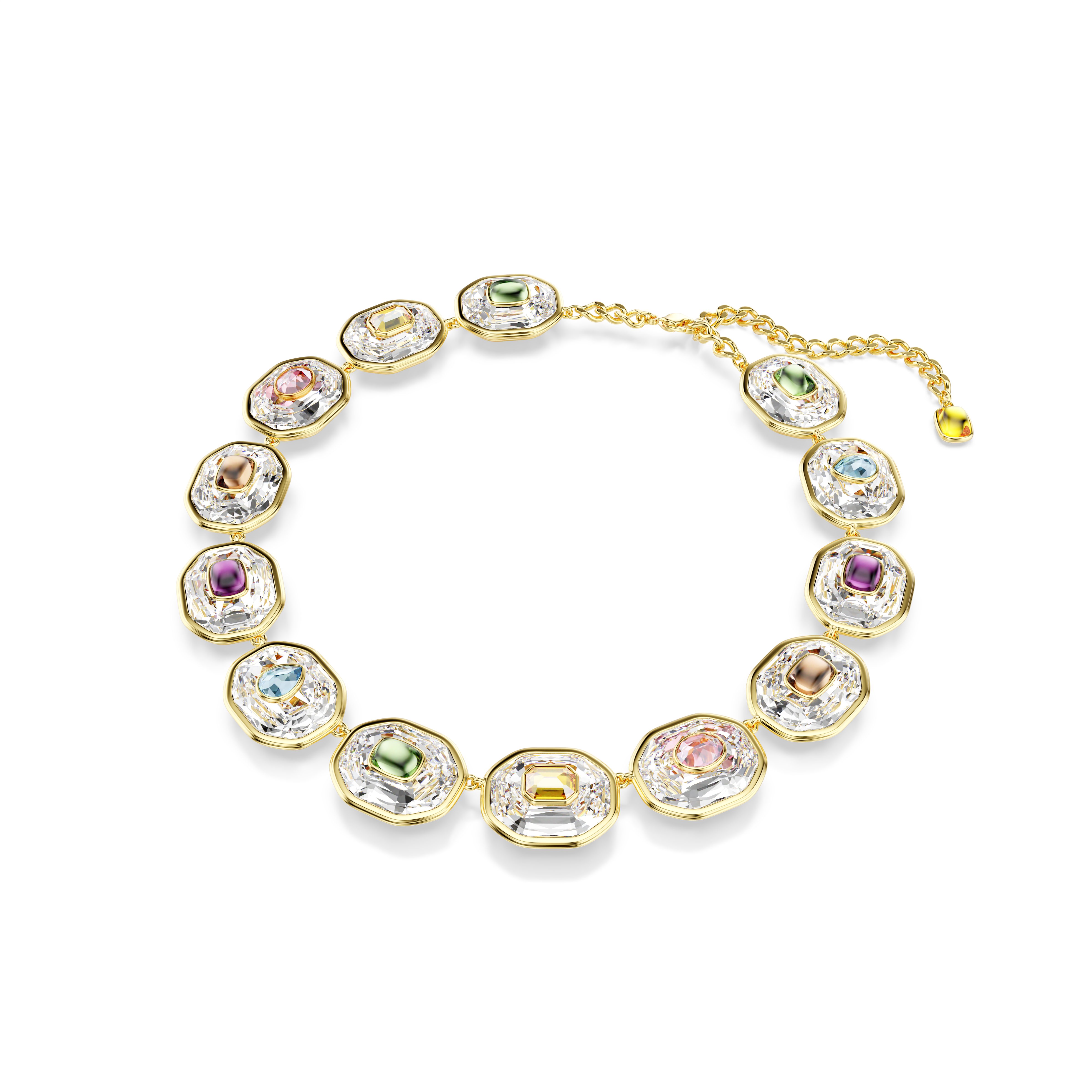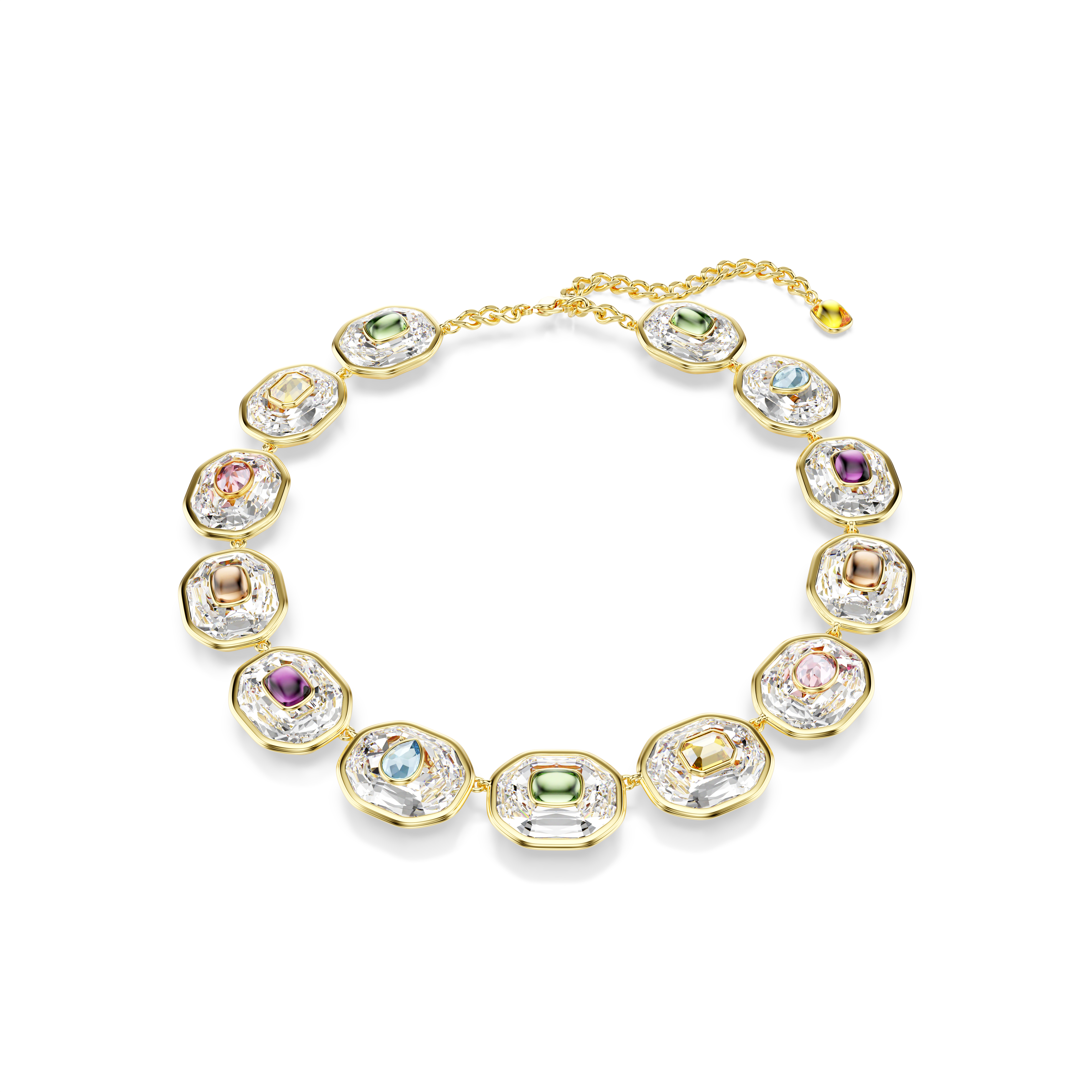 Bu yaratıcı tam tur kolyeyle Chroma ailesinin renklerinin tarzınızı sarmalamasına izin verin. Zarif bir zincir üzerinde yer alan ıstakoz kapamayla tamamlanan altın rengi kaplama tasarım, daha büyük boyuttaki berrak sekizgen kesimli kristallerin üzerine yerleştirilmiş çeşitli şekillerdeki çok renkli kristallerle tamamlanıyor. Ruh halinizi her zaman yükseltecek neşe dolu ve çarpıcı bir ifade.