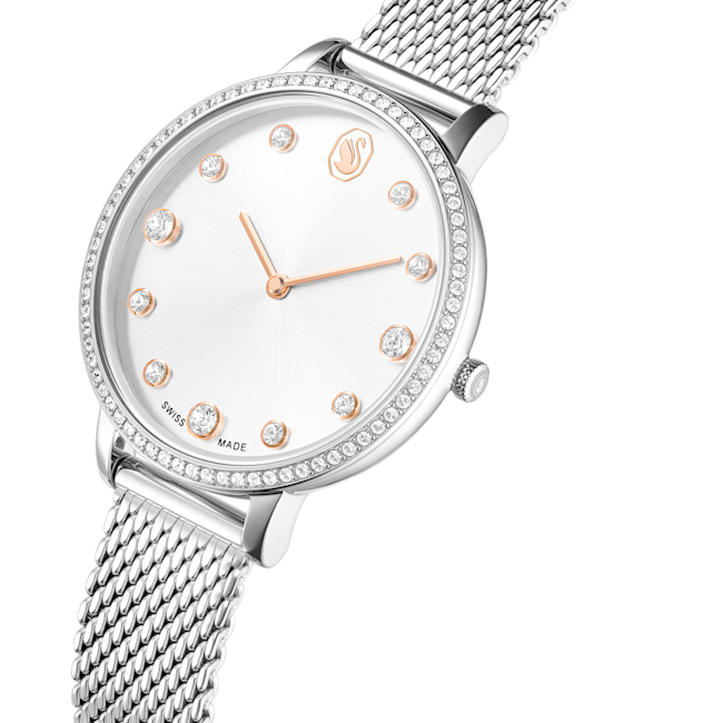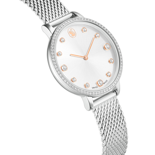 Bu zarif Clarica saat, bileği saran çarpıcı bir mesh tarzı sunan benzersiz Milanese bilekliğiyle öne çıkıyor. 35 mm’lik tasarım paslanmaz çelikten üretildi ve 73 adet berrak kristalle süslenmiş mükemmel dairesel bir çerçeveye sahip. Güneş ışını kadranında, saat 11 adet kristal indeks, saat 12 konumunda bir kuğu amblemi ve pembe altın rengi ibreler görülüyor. Bu İsviçre Yapımı saat 50 metreye kadar suya dayanıklı olup, günlük lüks için klasik bir seçim sunuyor.
