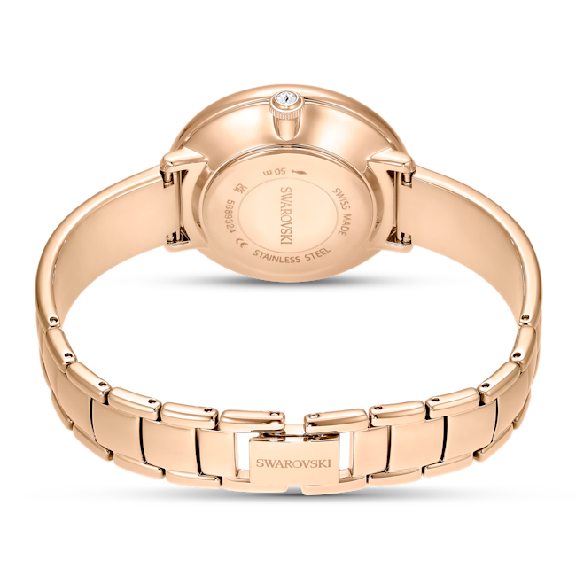Yarı takı, yarı saat bir tasarıma sahip olan bu Crystalline Bangle saat, ışıltılı bir günlük aksesuardır. 32 mm paslanmaz çelik tasarım, pembe altın rengi kaplamayla tamamlanırken bileğe takılan ayarlanabilir halka bileklik ise yeşil mineyle süslenmiş zarif bir orta bölüme sahiptir. Swarovski’nin Crystalline tekniğinin mükemmel bir örneği olan kadran, ince saat işaretleri ve saat 12 yönündeki Kuğu logosu dahil olmak üzere yaklaşık 1016 adet ışıltılı kristalle süslenmiştir. Kurma kolunda da ek bir kristal yer almaktadır. Bu İsviçre yapımı saat, 50 metreye kadar suya dayanıklıdır ve günün her saatinde parıltılar saçan bir tarz sunar.