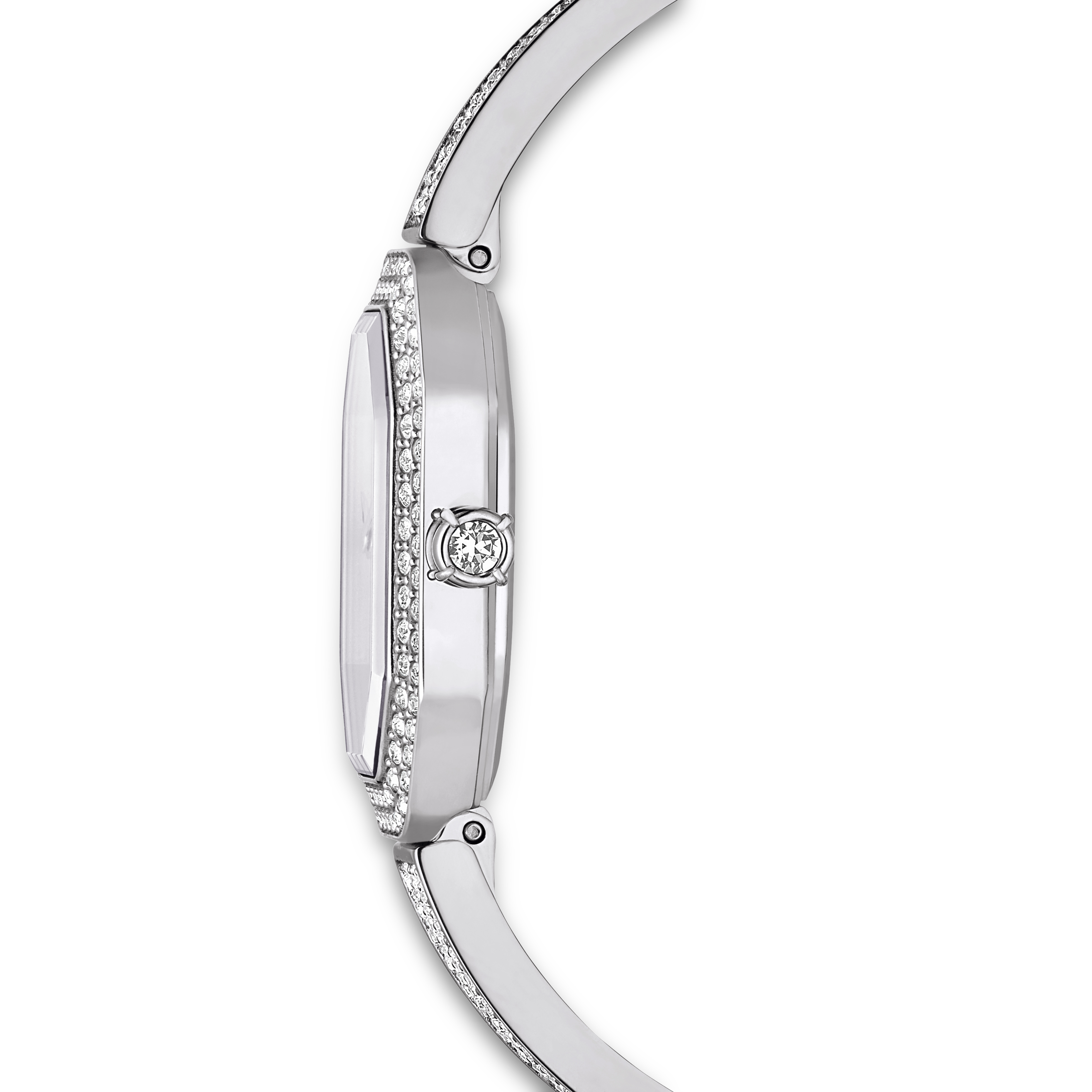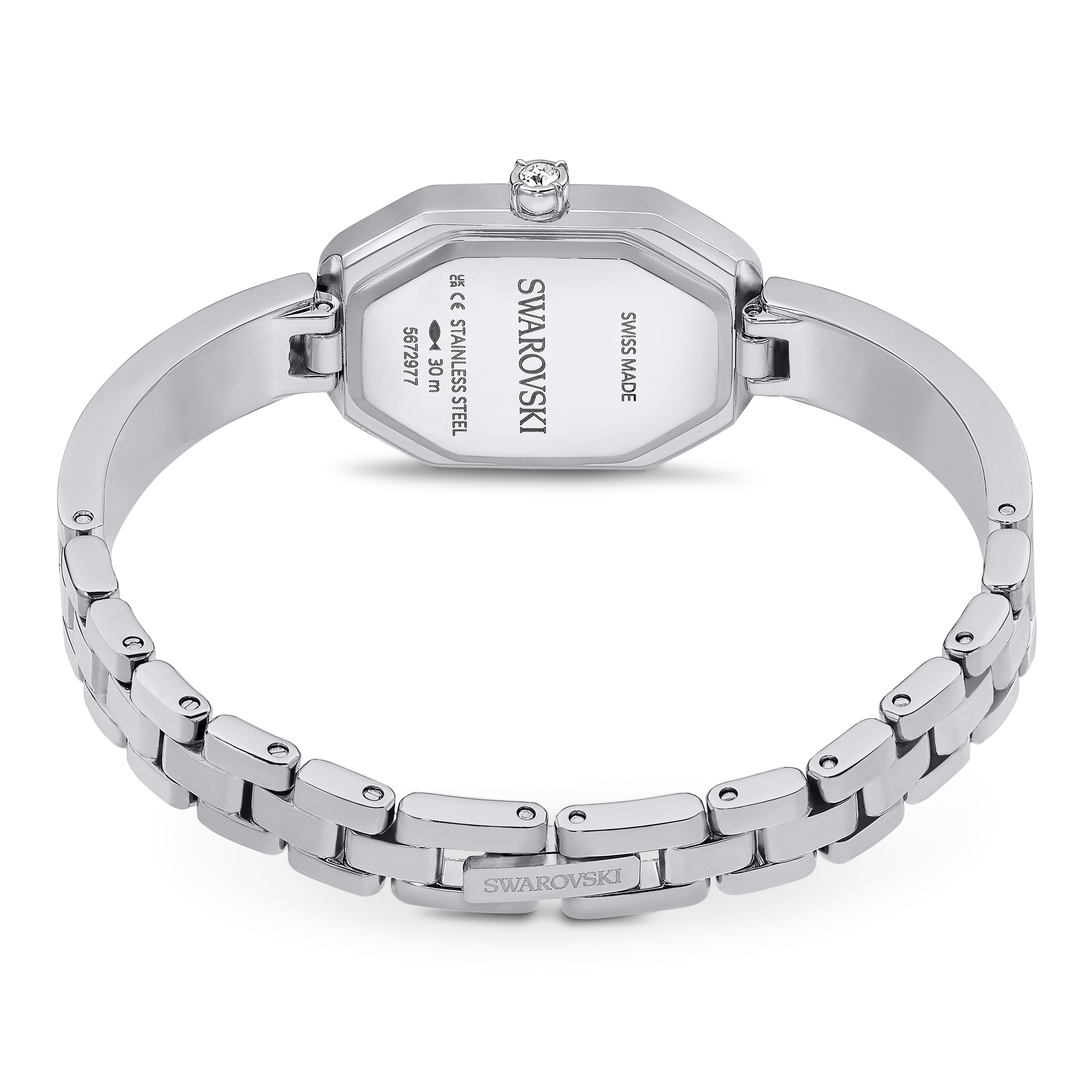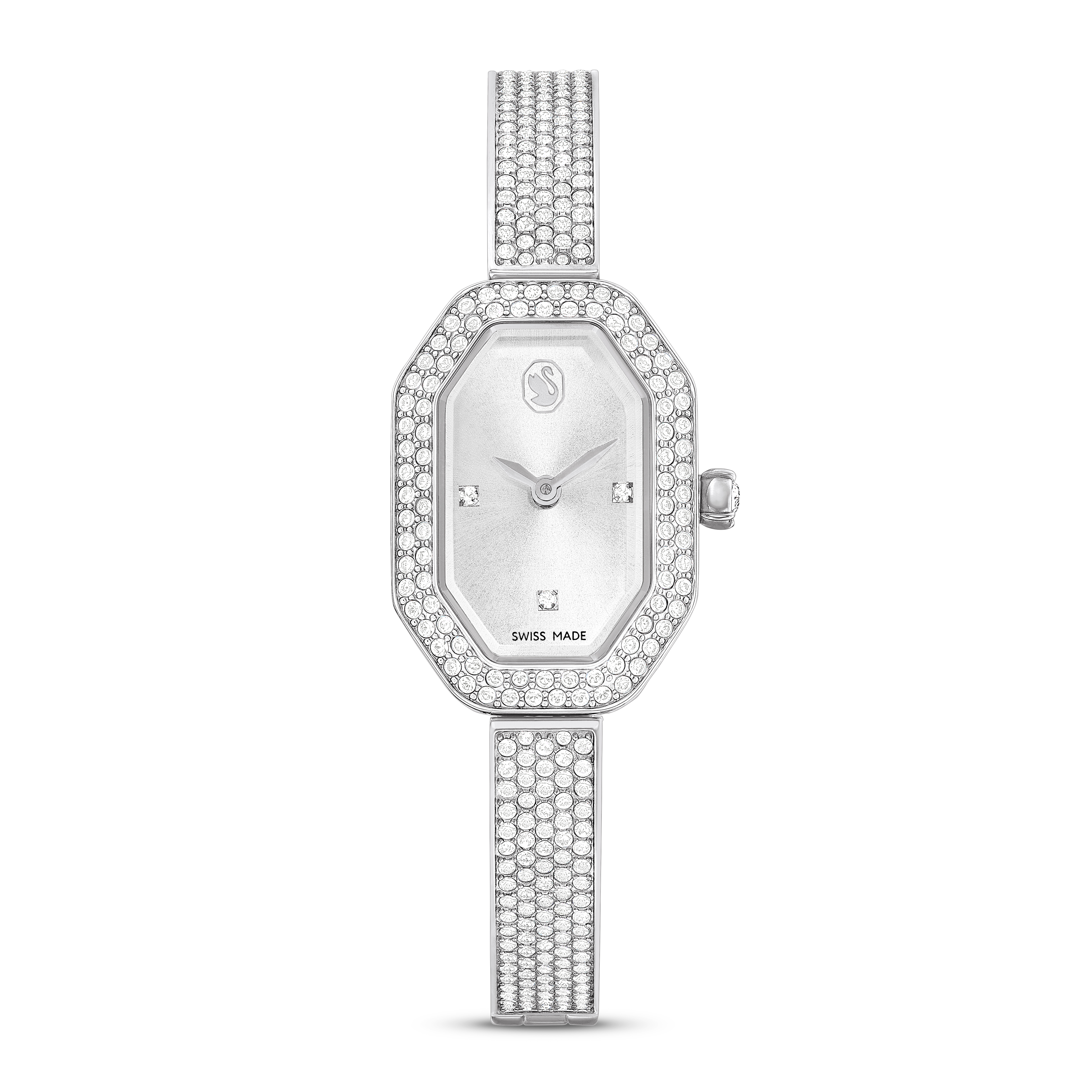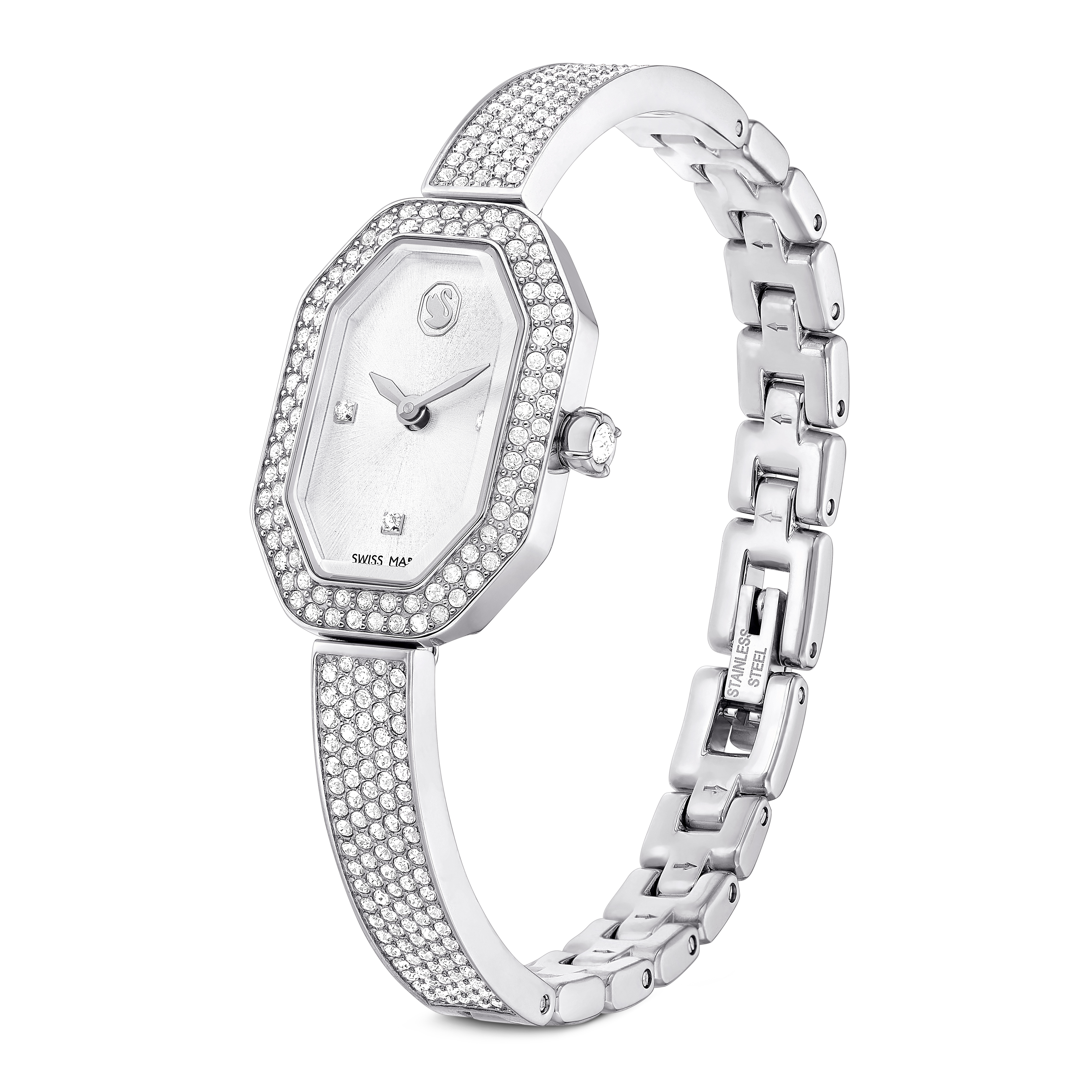 Swarovski’nin efsanevi sekizgen şekli verilerek üretilen bu benzersiz Dextera halka bileklik saat, maksimum ihtişam yayacak şekilde tasarlandı. 20 mm x 30,5 mm boyutlarındaki paslanmaz çelik kasa, çerçeve üzerinde 92 adet kristalden oluşan bir pavé ile süslendi. Bu süsleme, saat 12 yönünde bir kuğu logosuna ve üç adet kristalize gösterge işaretine yer veren güneş ışını kadran için mükemmel bir çerçeve oluşturuyor. Kurma koluna göz kamaştırıcı tek bir kristal yerleştirilmiş olan saat, ayarlanabilir bileklik boyunca yerleştirilen 194 adet kristalle hayat bularak her saat başı benzersiz bir güzellik sunuyor. 30 m’ye kadar suya dayanıklı olan bu İsviçre yapımı saat, neşeli görkemi benzersiz Swarovski savoir-faire’i ile birleştiriyor.