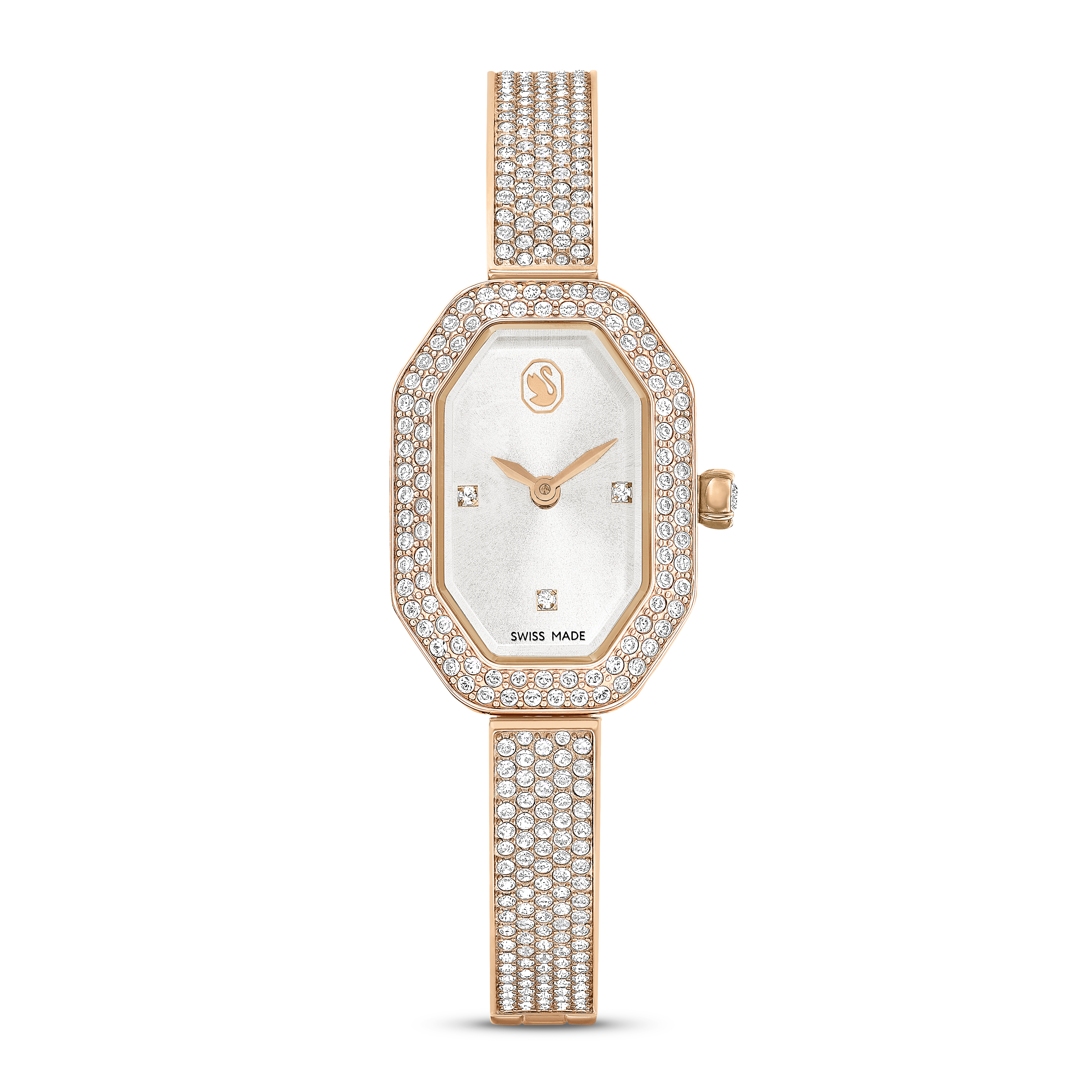 Işığı zarifçe yakalayan bu Dextera halka bileklik saat, Swarovski’nin meşhur efsanevi sekizgen şekli verilerek tasarlandı. Pembe altın rengi bir yüzeyle tamamlanan 20 mm x 30,5 mm boyutlarındaki kasa, çerçeve üzerinde 92 adet kristalden oluşan bir pavé ile süslendi. Bu süsleme, saat 12 yönünde bir kuğu logosuna ve üç adet kristalize gösterge işaretine yer veren güneş ışını kadran için mükemmel bir çerçeve oluşturuyor. Kurma koluna göz kamaştırıcı tek bir kristal yerleştirilmiş olan saat, ayarlanabilir bileklik boyunca yerleştirilen 194 adet kristalle hayat bularak her saat başı benzersiz bir güzellik sunuyor. 30 m’ye kadar suya dayanıklı olan bu İsviçre yapımı saat, neşeli görkemi benzersiz Swarovski savoir-faire’i ile birleştiriyor.