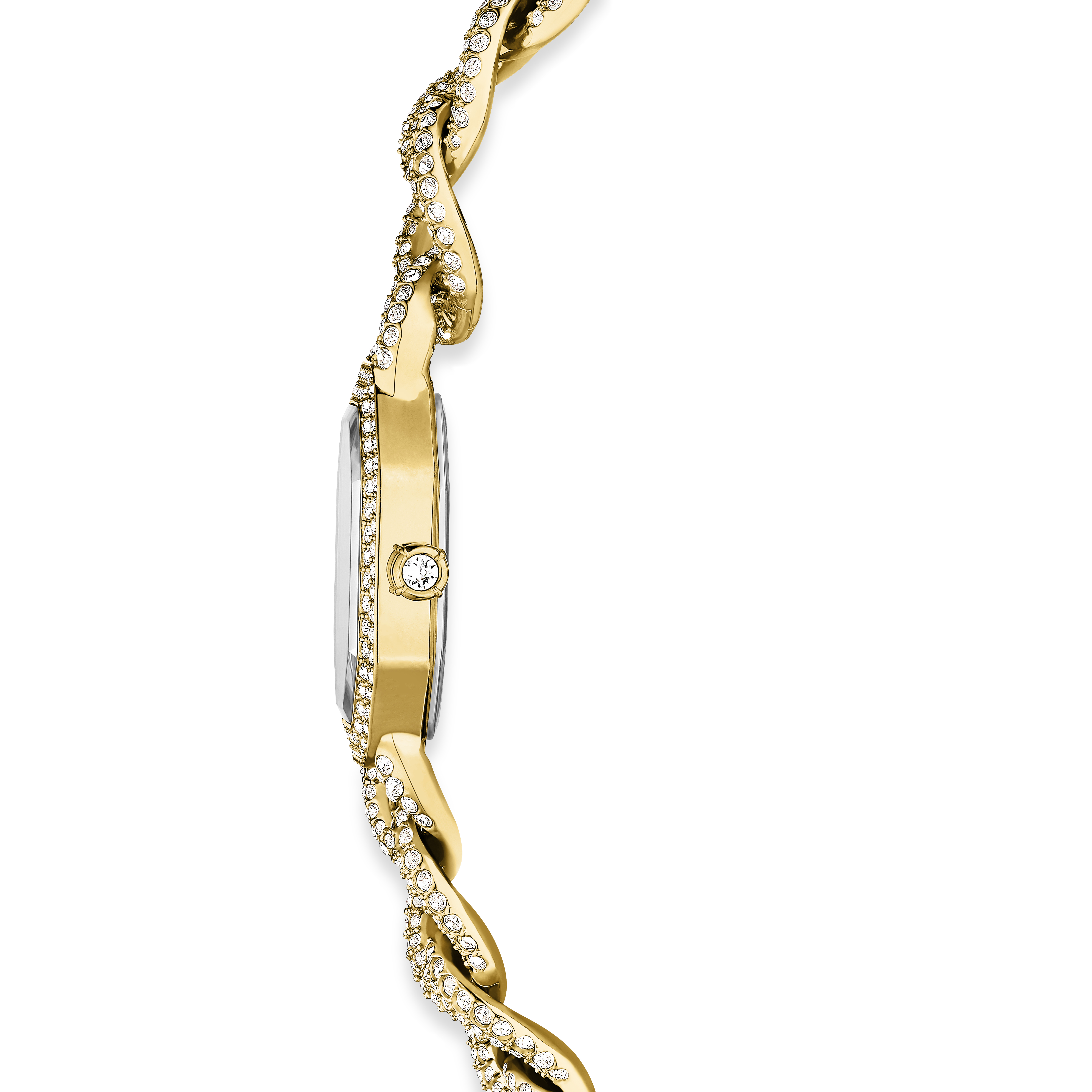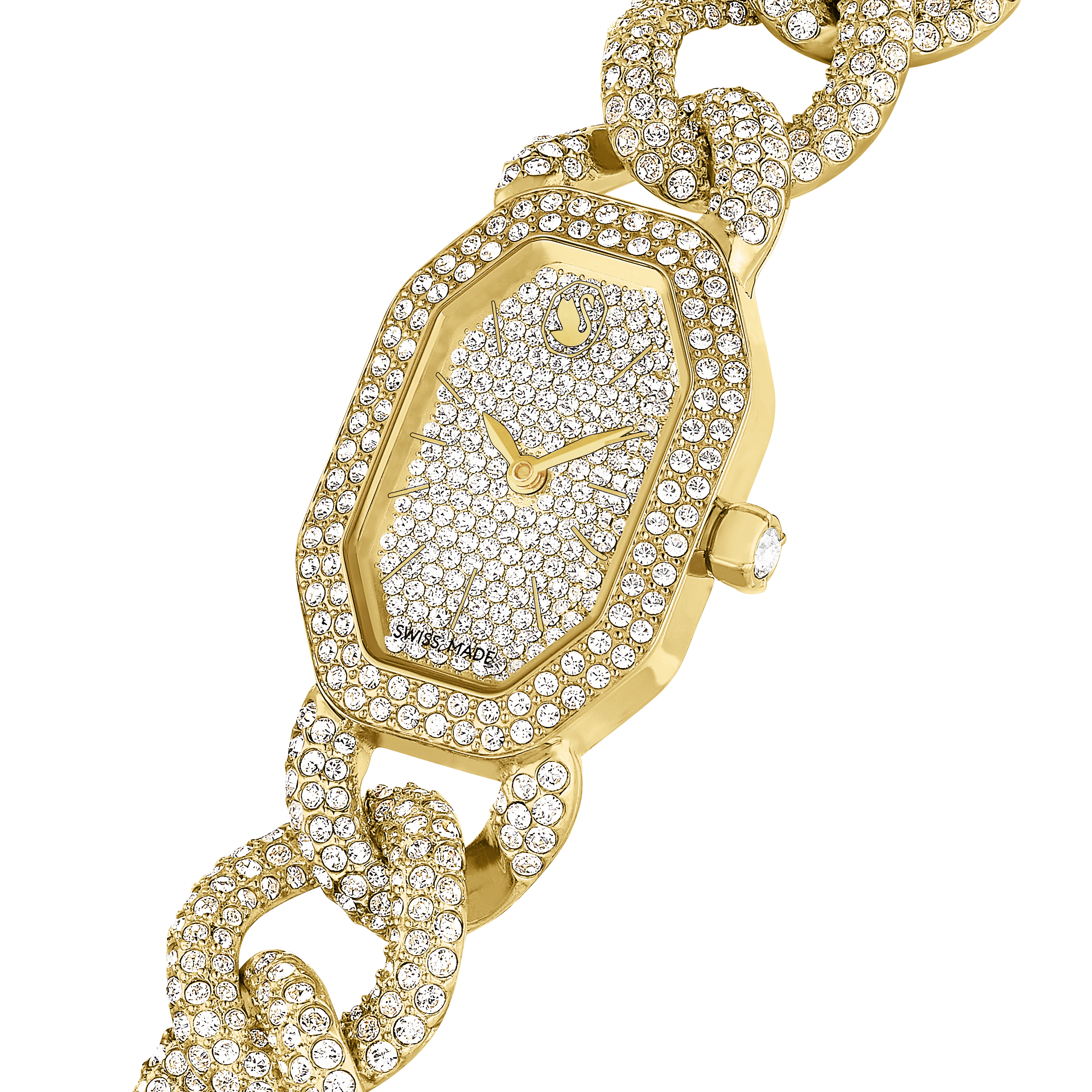 Swarovski’nin efsanevi sekizgen şeklini vurgulayan ve 815 adet kristalle yerleştirilen bu göz kamaştırıcı saat, tıpkı lüks bir takıymışçasına görkemli bir tarz sunar. Uzunluğu 44 mm olan seçkin kasa, yüzeyinde altın rengiyle çerçeve kısmında ise ışıltılı pavé ile tamamlanıyor. Kadranı ise 192 adet yuvarlak kesimli kristaliyle ve saat 12 yönündeki zarif kuğu logosuyla gün boyu ışıltı saçar. Saat, 530 adet kristalle süslenen ayarlanabilir gurme bir zincirle bileğinizi sararken tekli kristal ise kurma koluna yerleştirilmiştir. Bu İsviçre yapımı saat 30 m’ye kadar suya dayanıklıdır ve size hem günlük ihtişamınız hem de görkemli özel günler için eşsiz bir seçenek sunar.