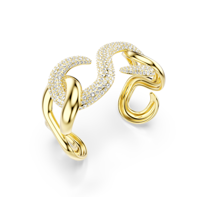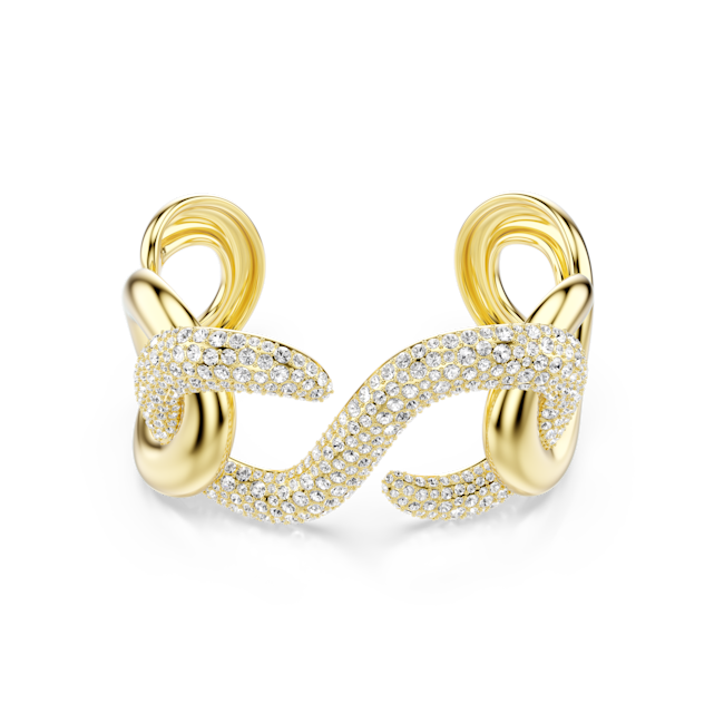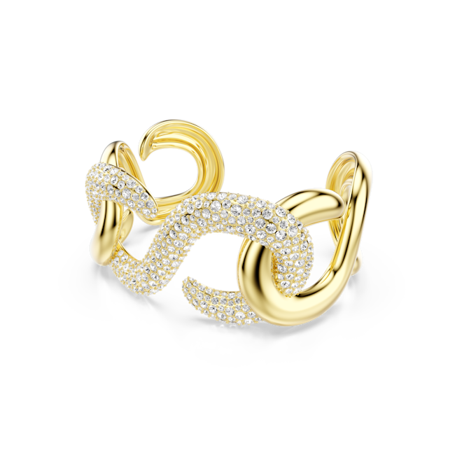 Bilekte cesur ve lüks bir izlenim için tasarlanan bu parlak Dextera kelepçe bileklik, altın rengi kaplama metalden yapılmış kıvrımlı halkalar ve orta kısmına işlenmiş ışıltılı kristallerle mühendislik harikası bir tasarıma sahiptir. Aynı belirgin silüete sahip diğer uyumlu Dextera parçalarıyla birlikte kullanabilirsiniz.