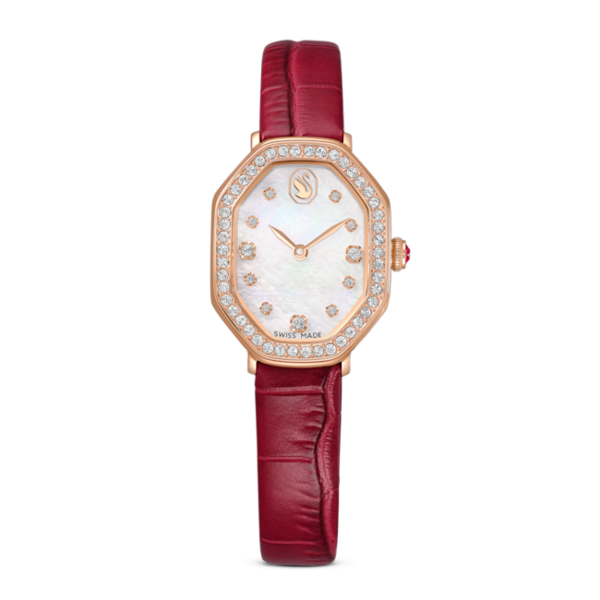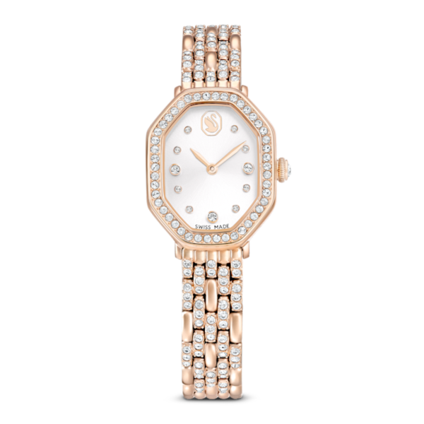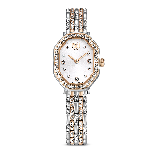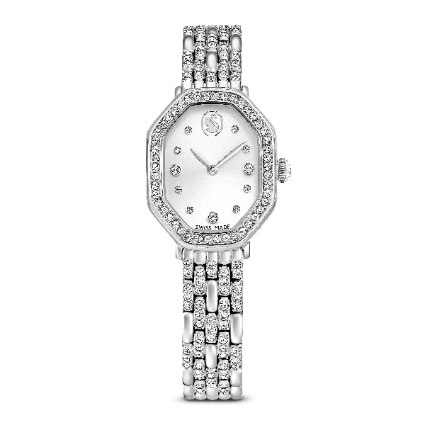 Dextera ailesinin zamansız zarafetinden ilham alan bu 18 x 23 mm boyutundaki saat, Swarovski’nin efsanevi sekizgen formunda eşsiz bir şekilde üretildi. Paslanmaz çelikten üretilen bu tasarımda 46 kristalle pavé çerçeve ve tepeye oturtulmuş tek bir kristal bulunuyor. Güneş ışını desenli kadranda ayrıca ince ibrelerin ve saat 12 konumunda kuğu logosunun yanı sıra zarif kristal indeksler de yer alıyor. Bu ışıltılı tasarımı tamamlayan beş bağlantılı bileklik, her saat başında sonsuz bir ışıltı sunan 108 adet yuvarlak kesim kristalle süslendi. İsviçre yapımı bu saat, 50 metreye kadar suya dayanıklıdır.