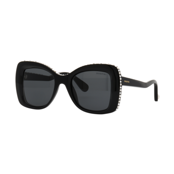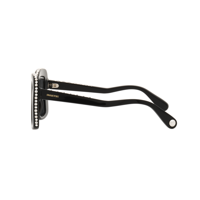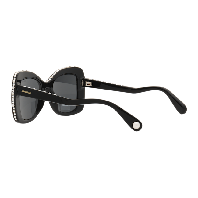 Büyük boyutu ve lüks süslemeleriyle bu Swarovski güneş gözlüğü, Hollywood ihtişamından bir dokunuş sunuyor. Siyah kelebek formundaki çerçeveler, dönüşümlü olarak yerleştirilmiş berrak kristaller ve beyaz Swarovski Kristal İncilerle zenginleştirilmiş olup klasik bir sofistike görünüm için koyu gri camlar yer almaktadır. Cesur bir tarz ifadesi yaratmak için dilediğiniz zaman kullanabilirsiniz.