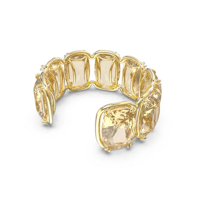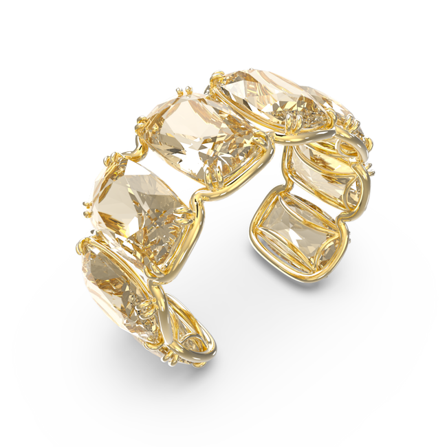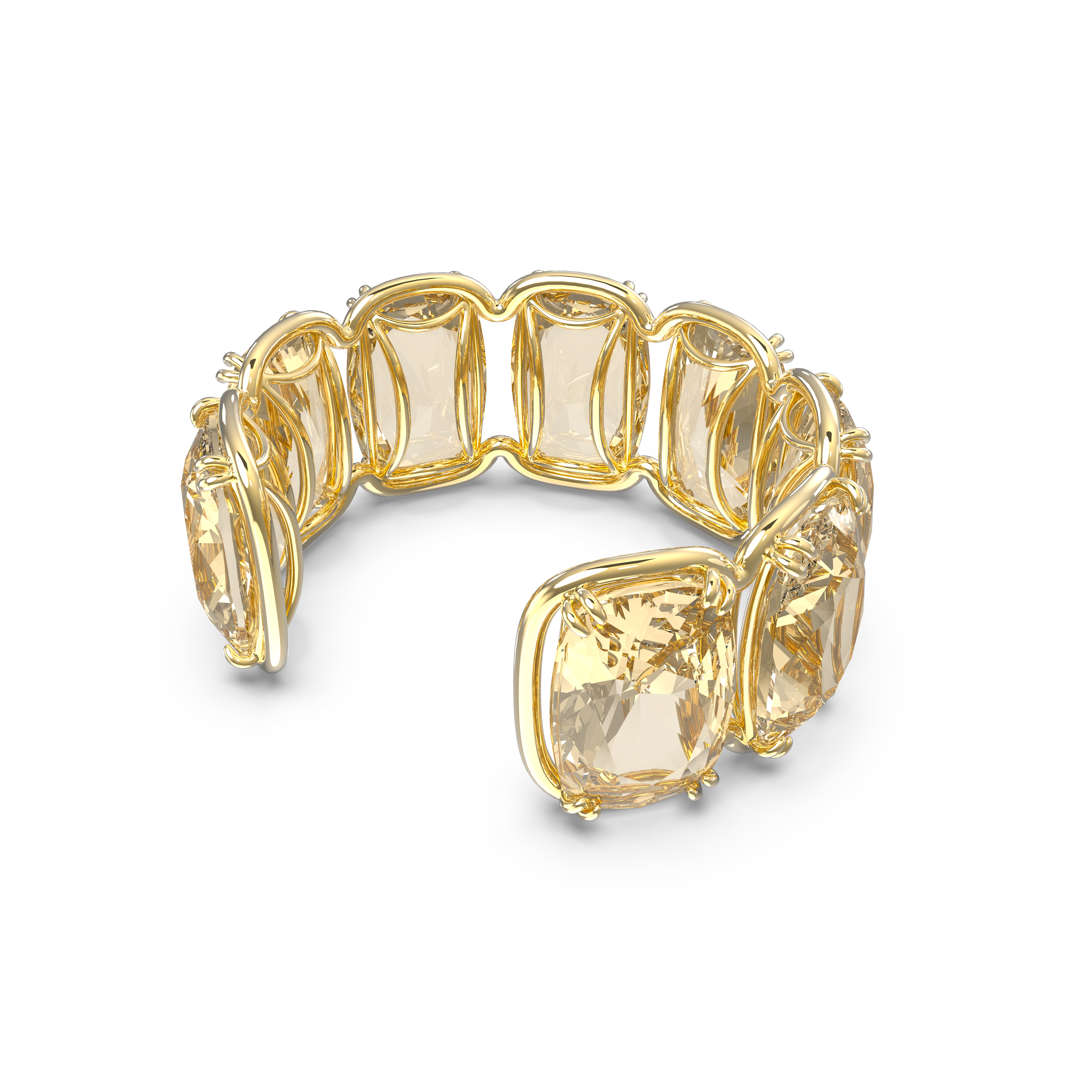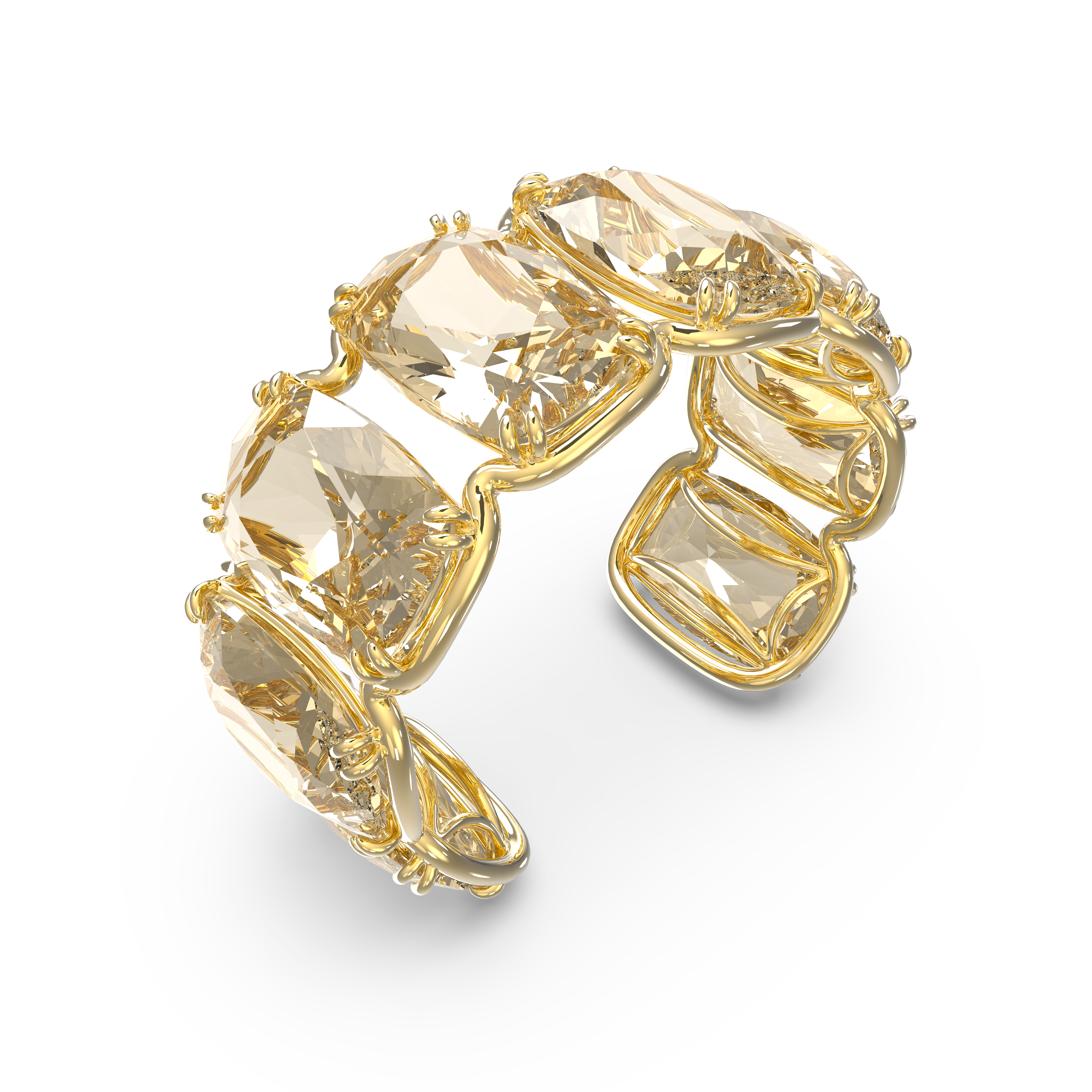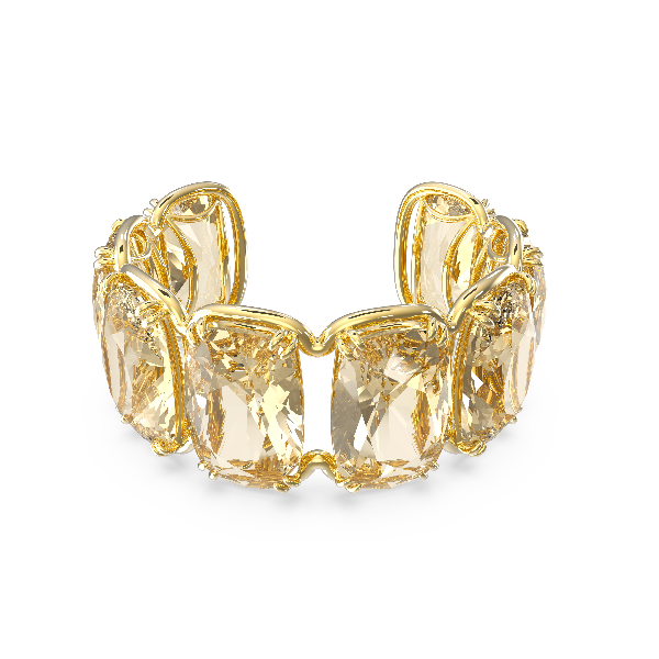 Harmonia ailesine ait bu baş döndürücü, altın rengi kaplama manşet, görünümünüze büyüleyici bir dokunuş katacak. Bir dizi iri, uzatılmış yastık kesim kristalin ustalıkla bir araya getirilmesiyle tasarlanan parça, hareket eden taş illüzyonunu yaratan tırnaklı yerleştirme detayıyla öne çıkıyor. Nefes kesici bir görünüm için çarpıcı bir yüzükle birlikte takın.