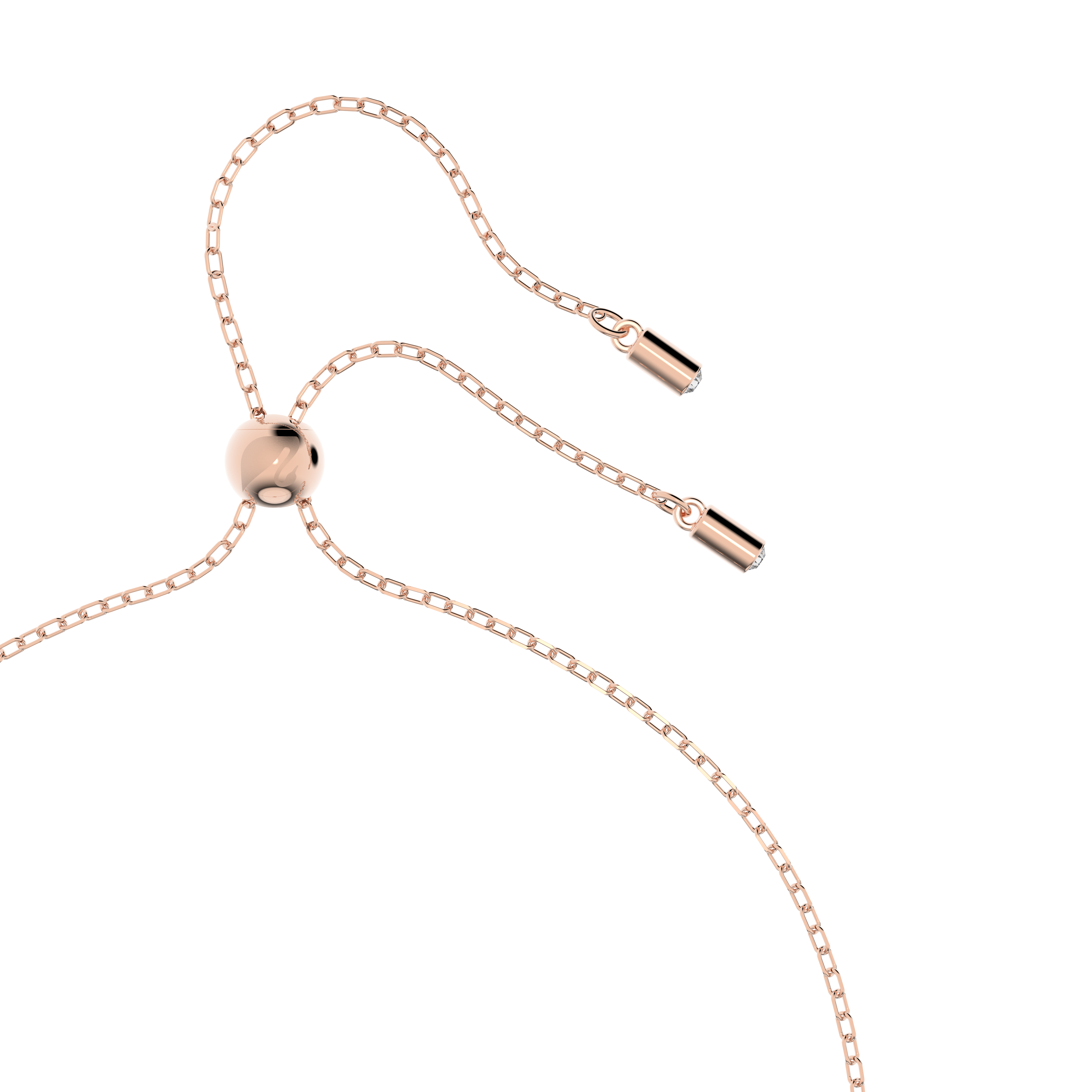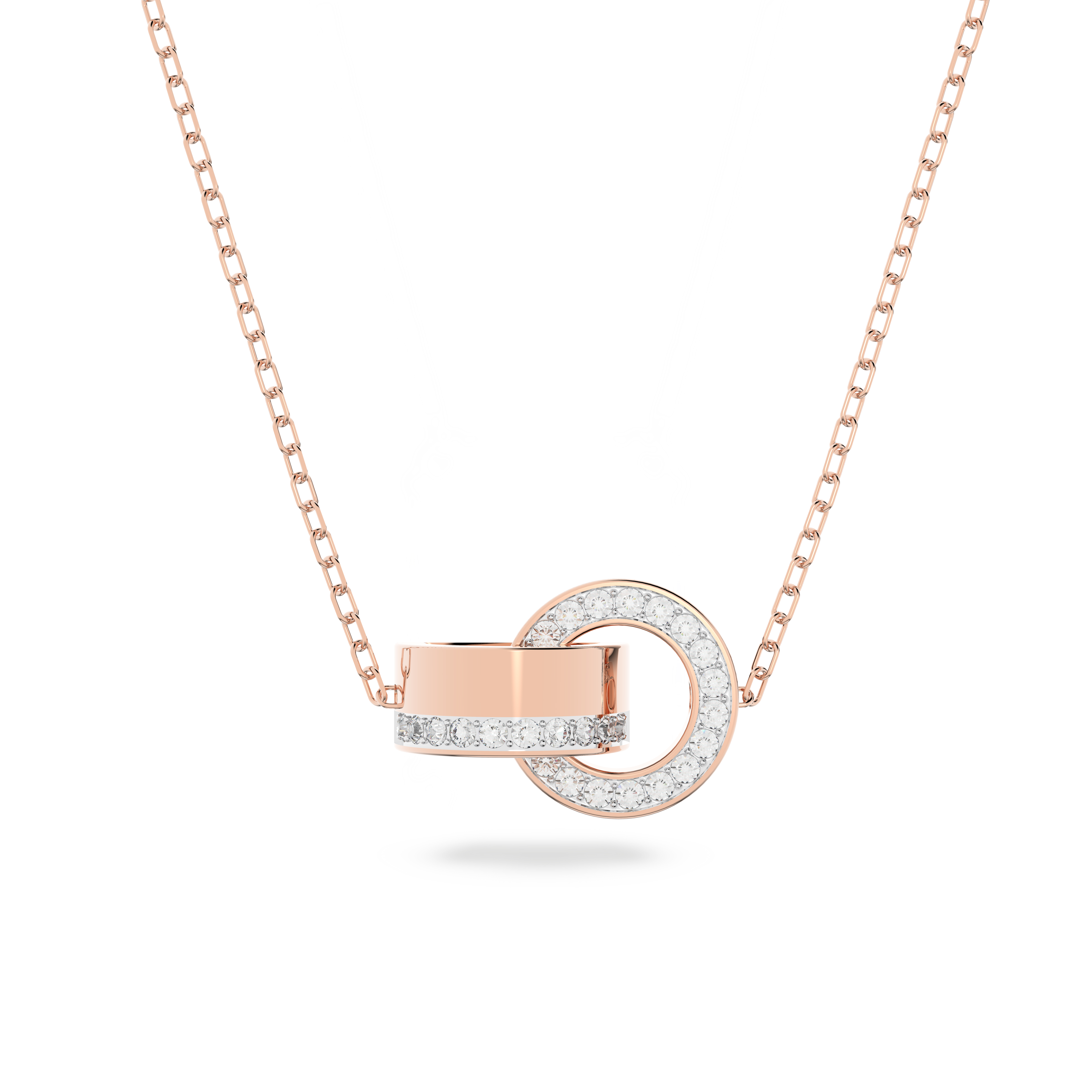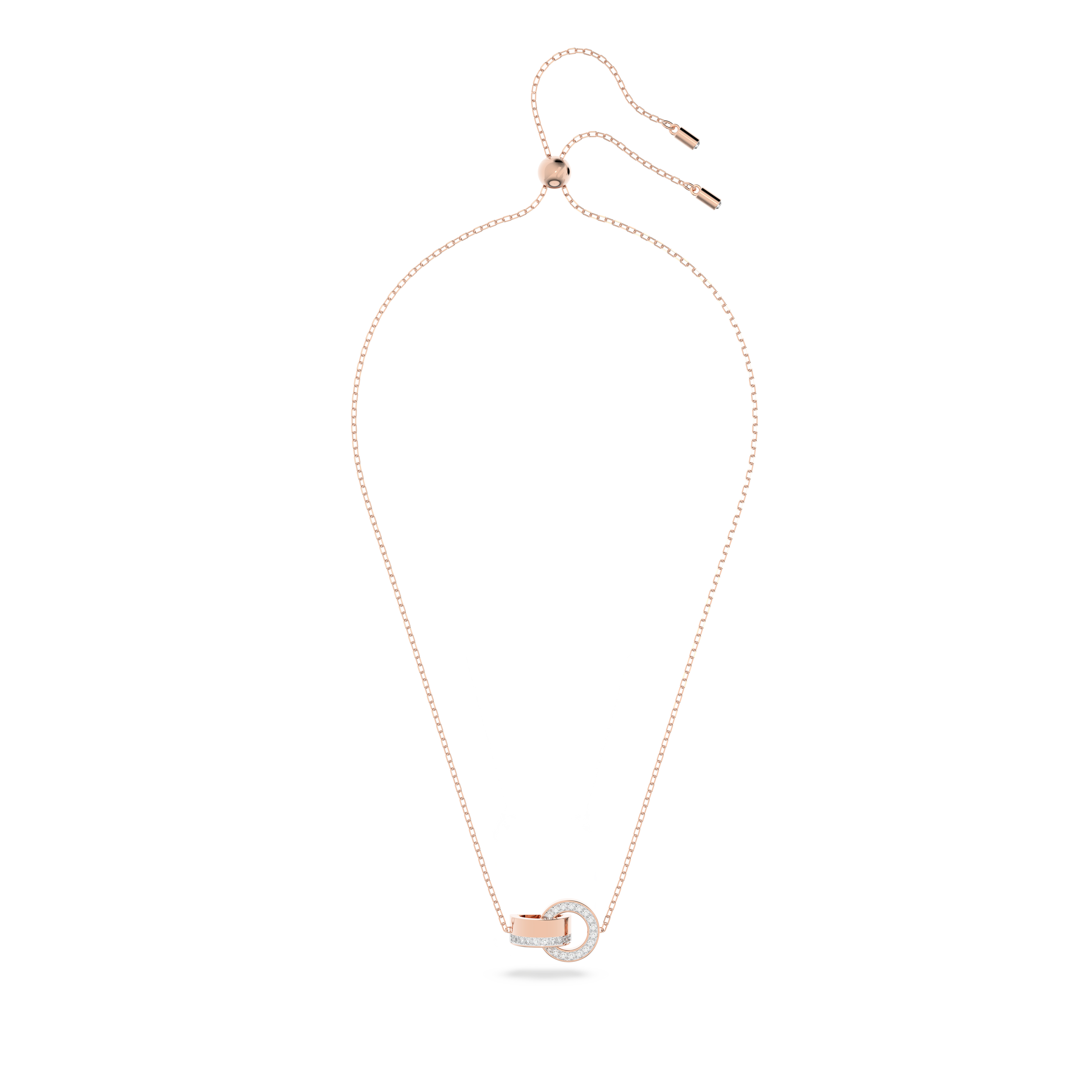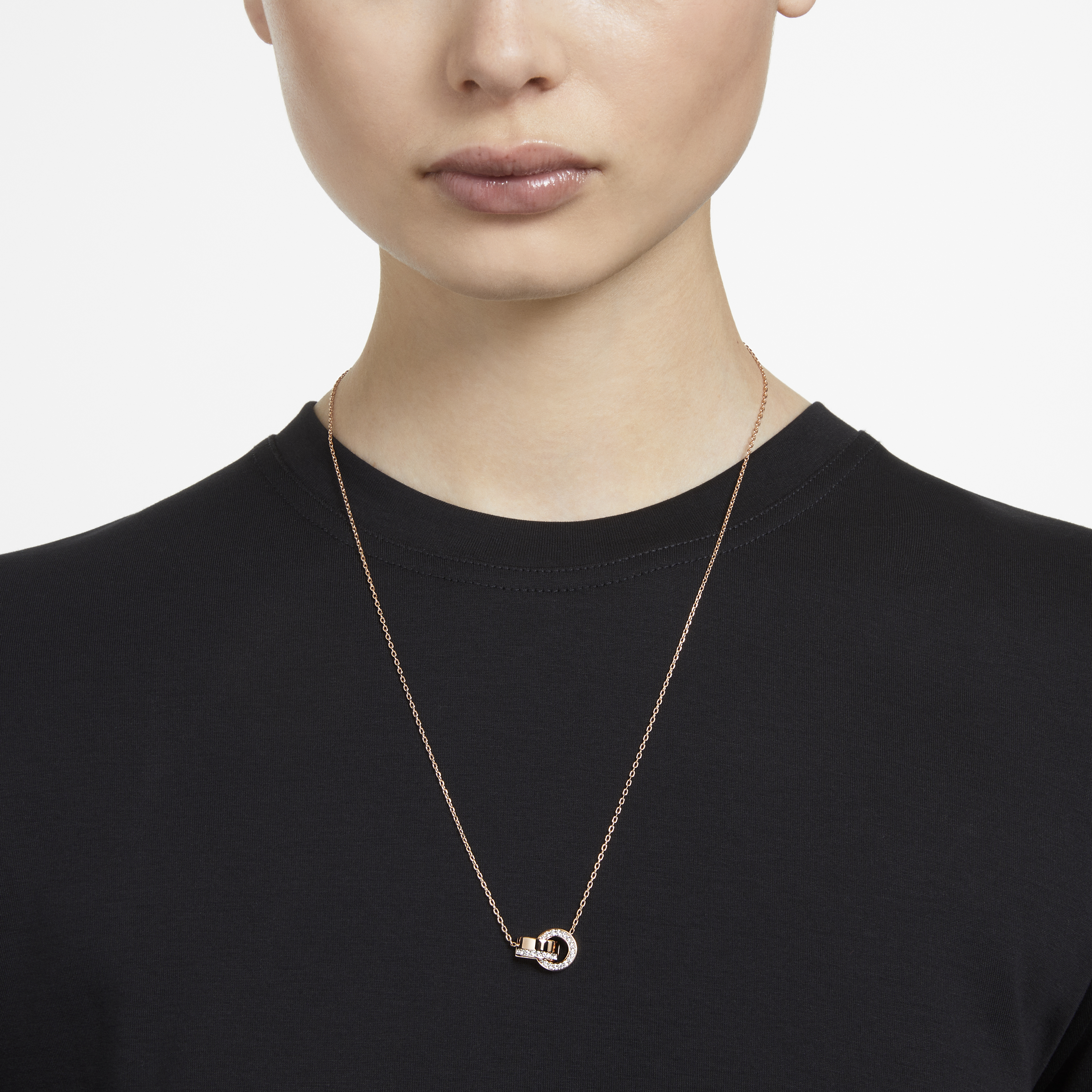 Bu asimetrik kolye ucuyla tarzınızın sınırlarını zorlayın. Berrak kristal pavé ile oluşturulan iç içe geçmiş iki çemberin pembe altın rengi kaplama zincirden sarkıtılması, ışık oyunları ortaya çıkarıyor.