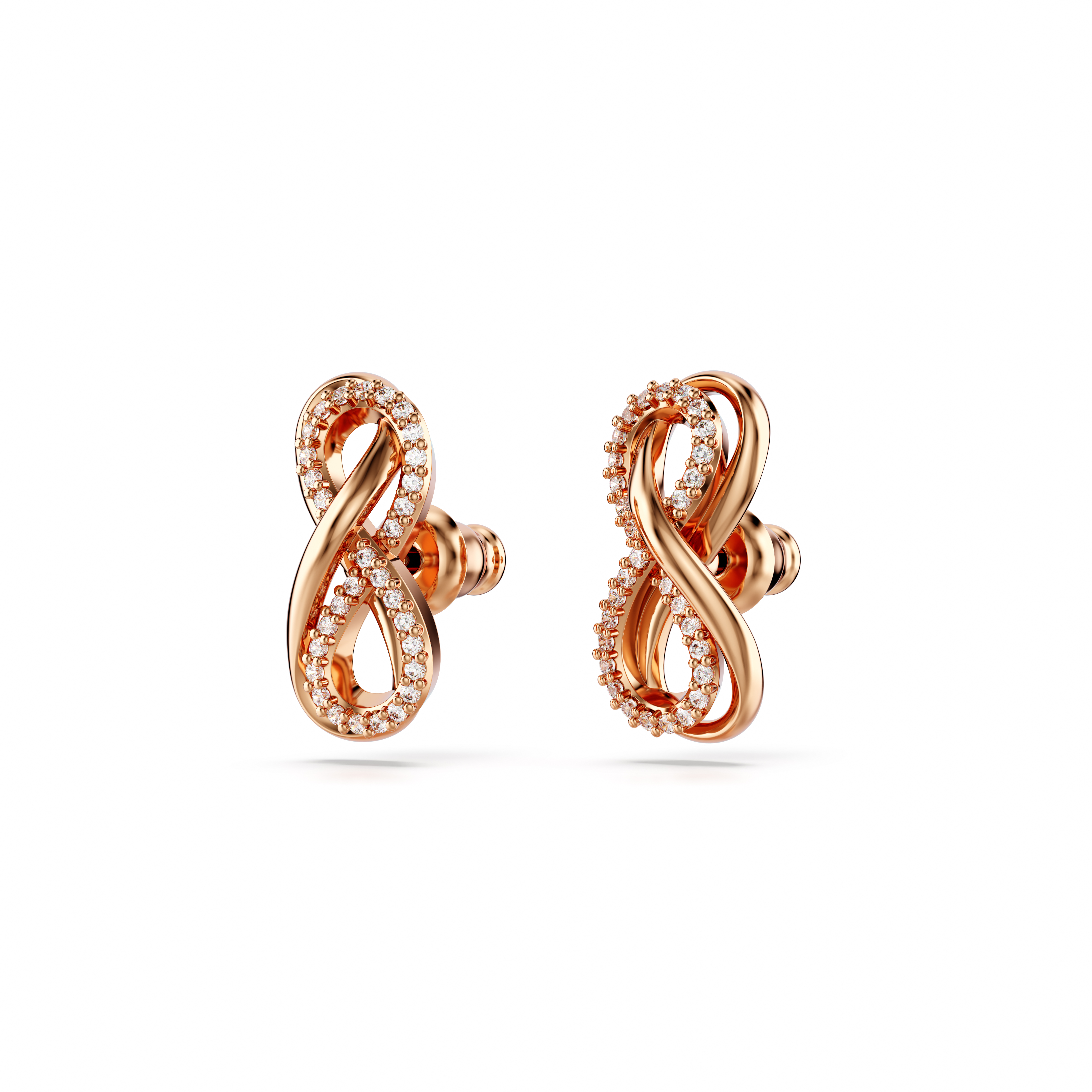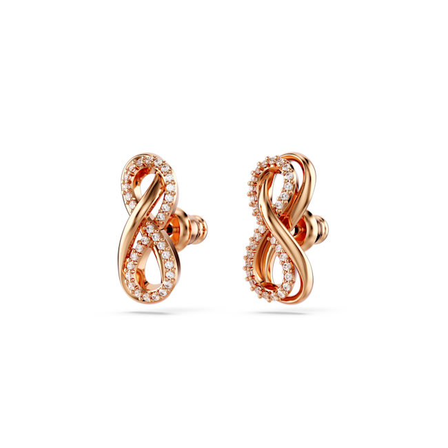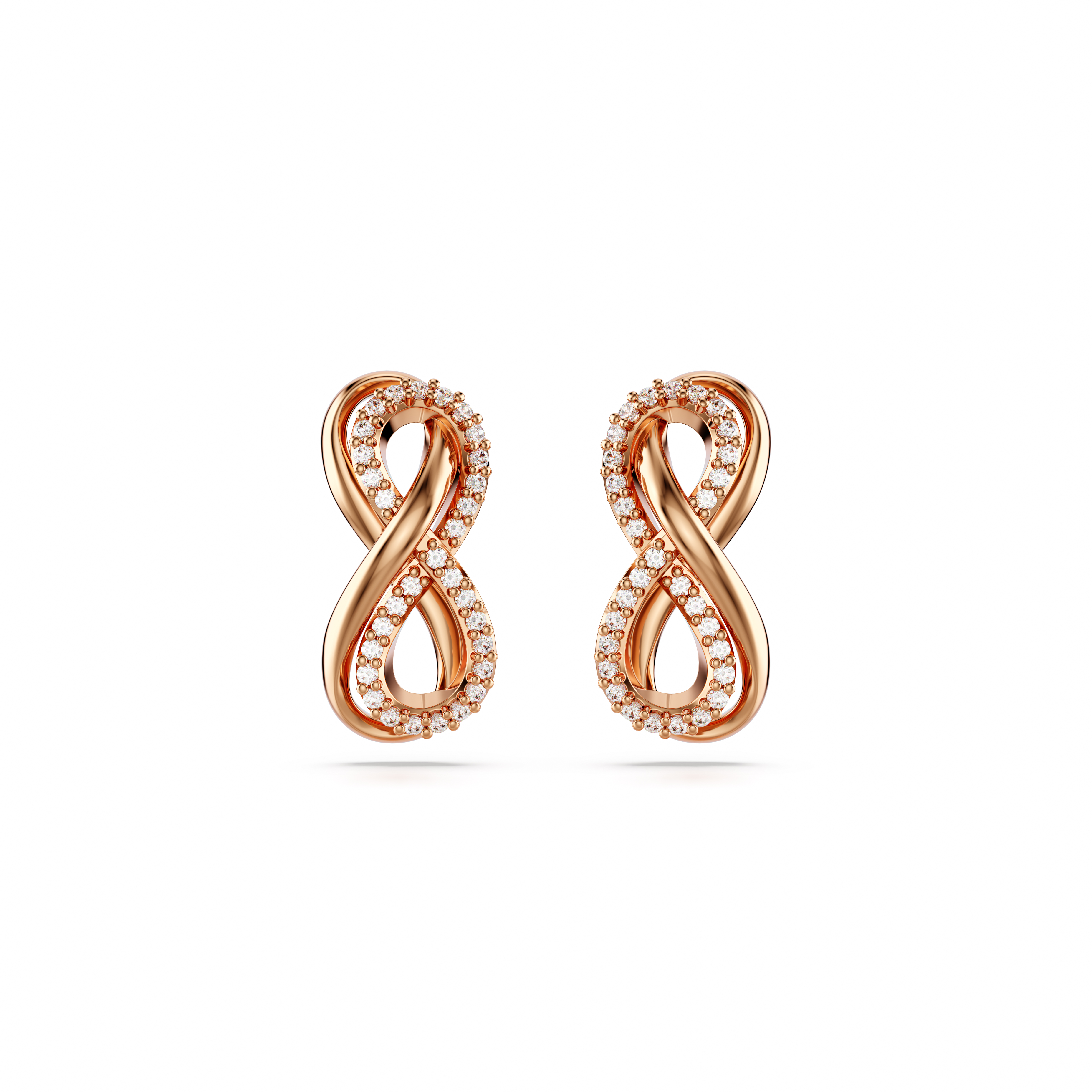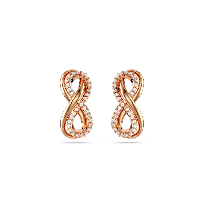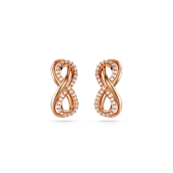 Bu çarpıcı Hyperbola küpe, sonsuza dek kullanabileceğiniz bir tarz sunuyor. Pembe altın rengi kaplama parçaların her biri sonsuzluk motifi şeklinde tasarlandı ve berrak Swarovski Zirkonyalardan oluşan bir cümbüşle süslendi. Zamansız ve zarif olan bu parça, zarif bir lüks için uyumlu bir kolyeyle birlikte veya tek başına kullanılabilir.