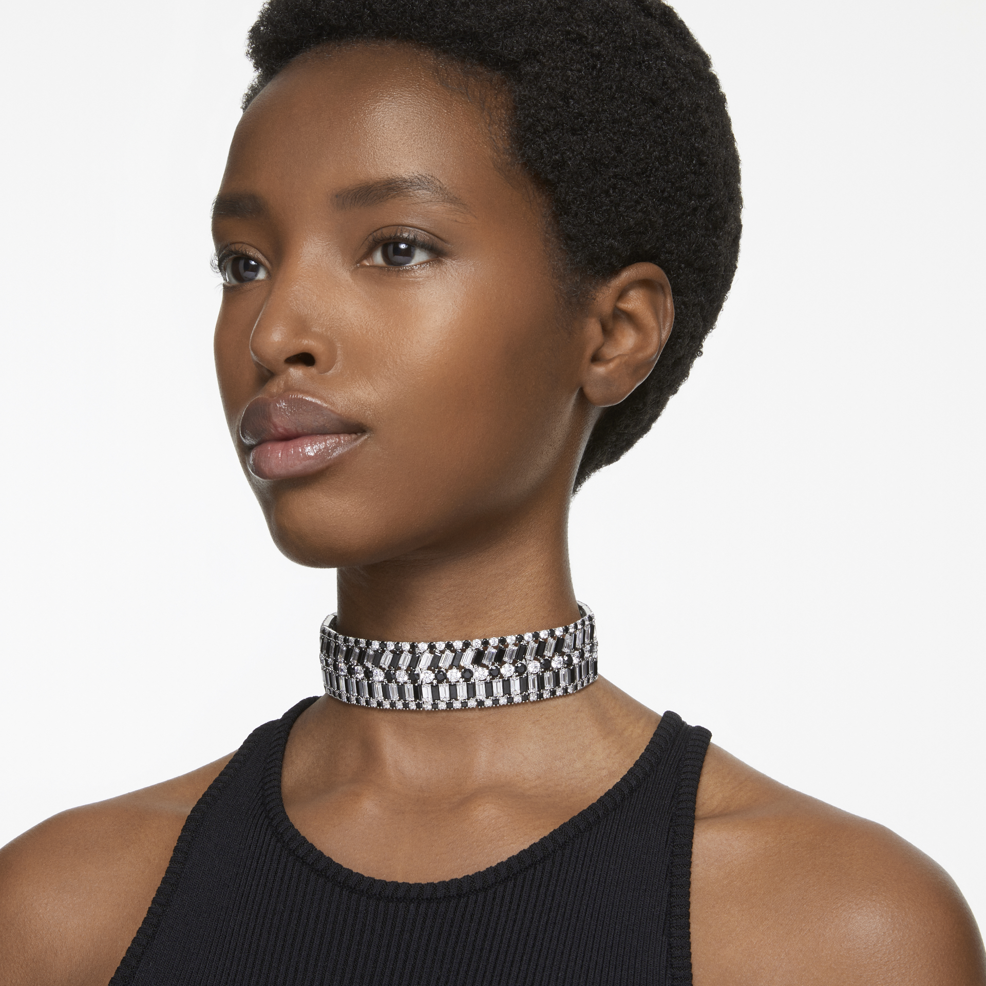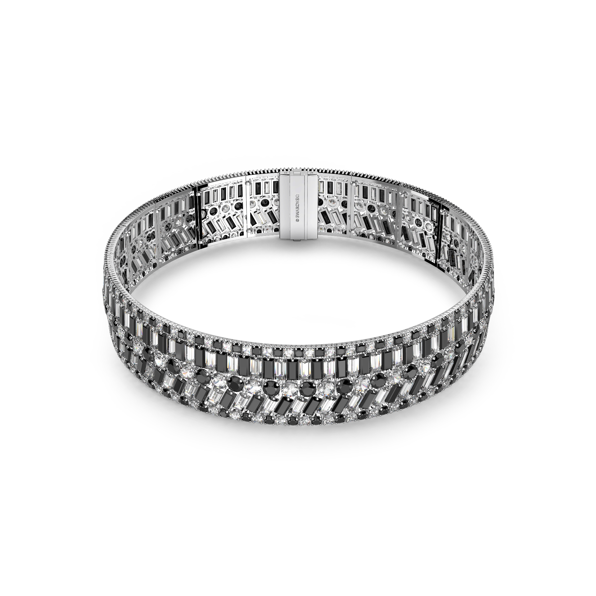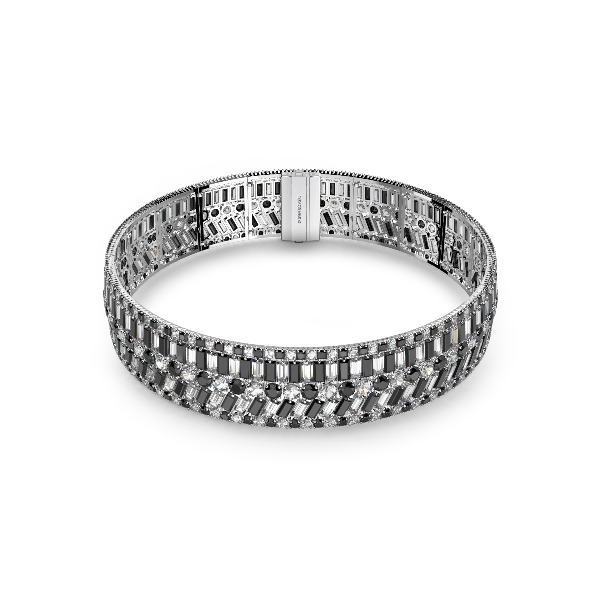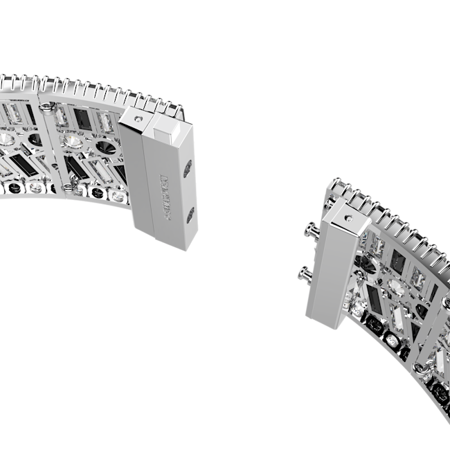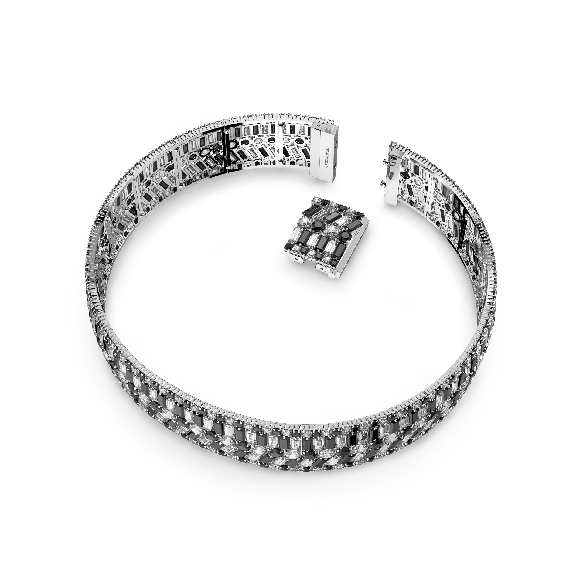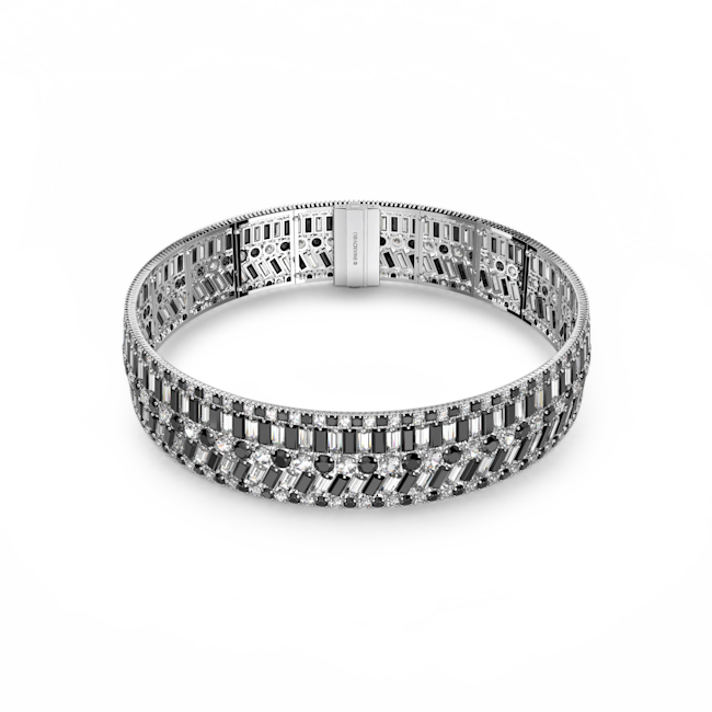 Hyperbola ailesine ait bu çarpıcı tasma kolye, matematiksel sihre sahip desenlerden ilham almaktadır. Şık, rodyum kaplama yerleştirme üzerine dizilen farklı ve modern kesimlerdeki siyah ve berrak taşlarla tasarlanmış bu parça, zarafetinizi tam anlamıyla yansıtmak için gizli kapama mekanizmasıyla tamamlandı. Kafaları çevirmek için aksesuarlarınız arasına katın.