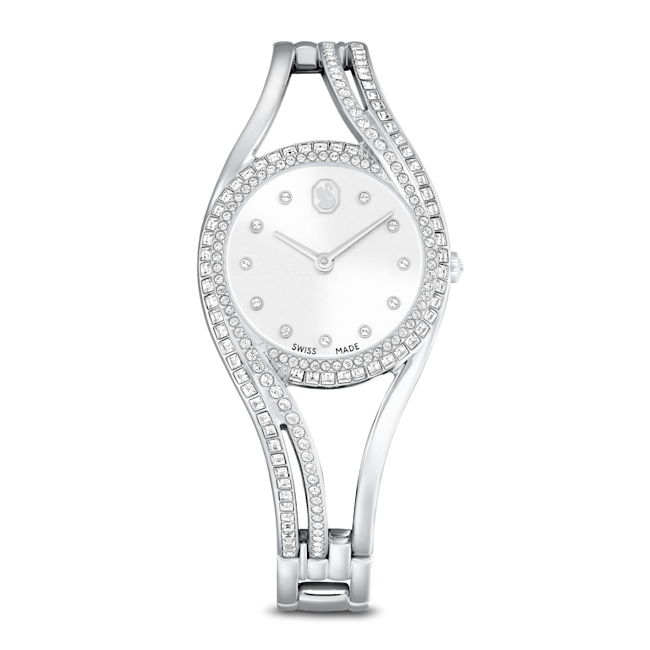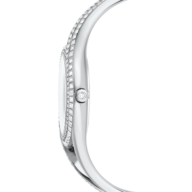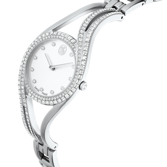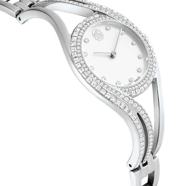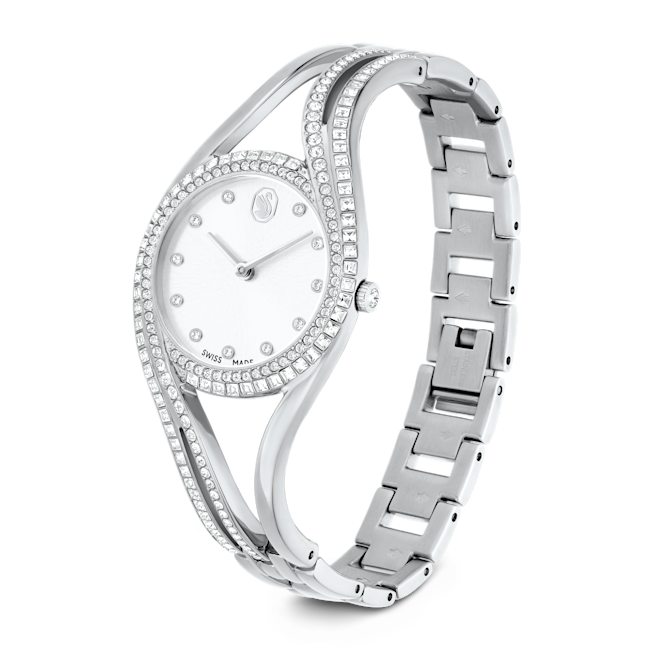 Zarif kıvrımları ve incelik hissiyle öne çıkan bu Hyperbola Bangle saat, mücevher ve saat arasındaki çizgiyi bulanıklaştırır. 28 mm paslanmaz çelik kasa, prenses ve yuvarlak kesimli 176 berrak kristalden oluşan birleşik bir çerçeve ve bileklik setine sahiptir. Güneş ışını kadranında ayrıca kristallerden yapılmış 11 saat işareti ve saat 12 yönünde bir Kuğu logosu bulunur. Güzel bir son dokunuş için kurma kolunun içine yerleştirilmiş tek bir kristal içeren bu İsviçre Yapımı saat, aynı zamanda 50 m su geçirmezlik sunar. Sanatı kusursuz bir savoir-faire ile birleştiren modern bir saat seçimidir.