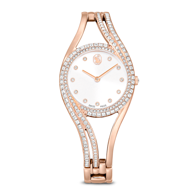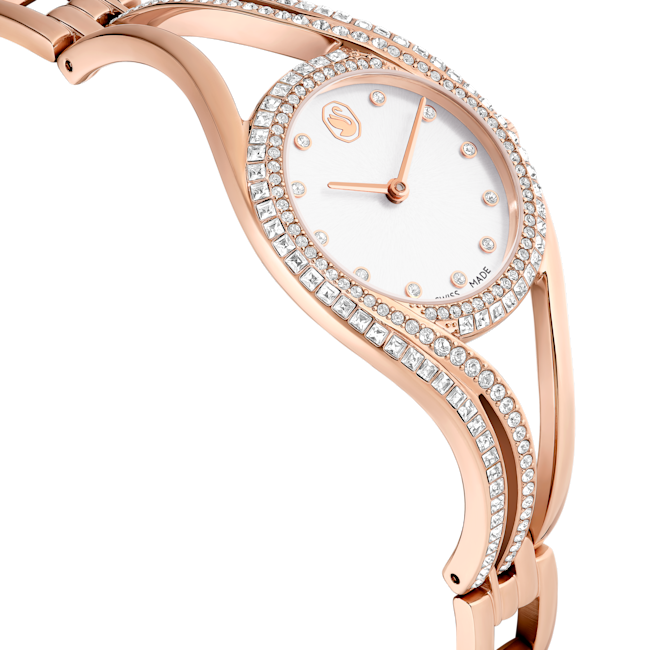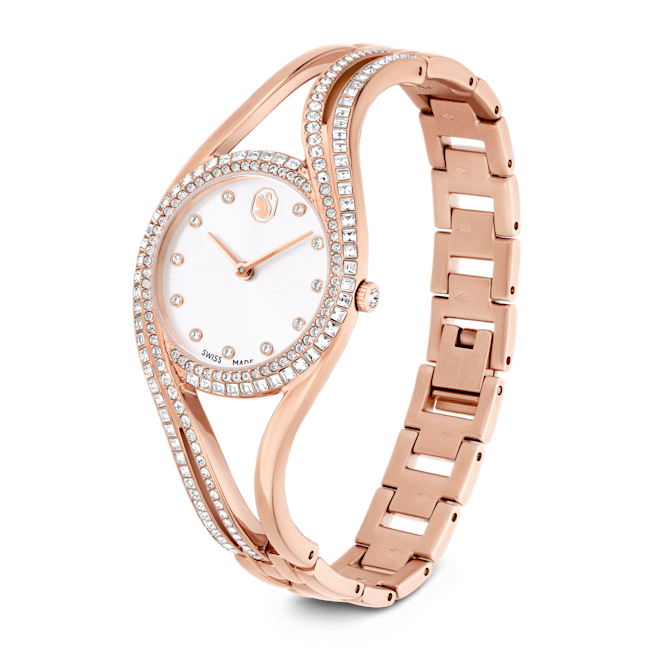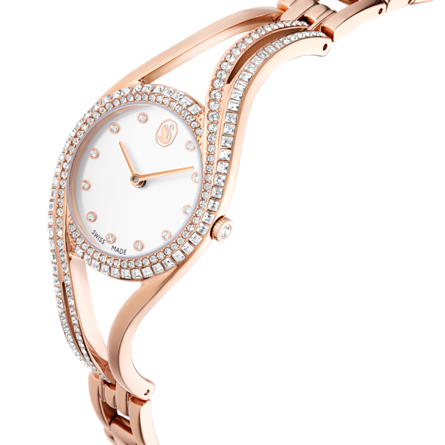 Zarif kıvrımları ve incelik hissiyle öne çıkan bu Hyperbola Bangle saat, mücevher ve saat arasındaki çizgiyi bulanıklaştırır. 28 mm paslanmaz çelik kasa pembe altın rengi kaplamadır ve prenses ve yuvarlak kesimli 176 berrak kristalden oluşan birleşik bir çerçeve ve bileklik setine sahiptir. Güneş ışını kadranında ayrıca kristallerden yapılmış 11 saat işareti ve saat 12 yönünde bir Kuğu logosu bulunur. Güzel bir son dokunuş için kurma kolunun içine yerleştirilmiş tek bir kristal içeren bu İsviçre Yapımı saat, aynı zamanda 50 m su geçirmezlik sunar. Sanatı kusursuz bir savoir-faire ile birleştiren modern bir saat seçimidir.
