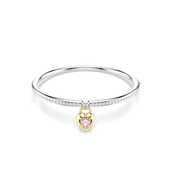 Romantizmin lüks ve çarpıcı bir ifadesi olan bu ince halka bileklik, berrak kristallerle süslenmiş ve merkezinde madalyon esintili bir kalbe yer veriyor. Romantik motifin bir yüzünde pembe Swarovski Zirkonya altın rengi kaplama ile, diğer yüzünde ise rodyum kaplama üzerinde berrak kristal pavé ile tamamlandı. Sevgi dolu görünümünü en üst düzeye çıkarmak için uyumlu yüzükle birlikte kullanın.