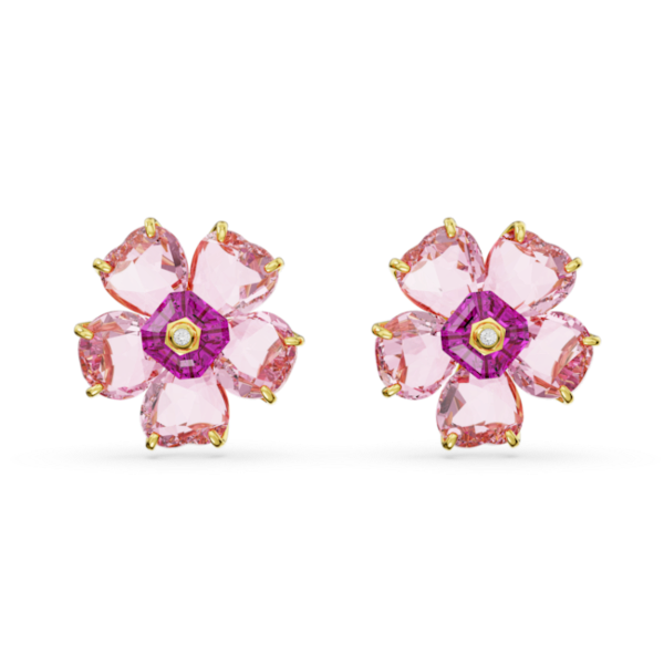 Çiçeklerin muhteşem güzelliğinden ilham alan bu iğneli küpeler, âdeta dalından koparılmayı bekliyor. Altın rengi kaplama üzerine yerleştirilmiş bu çekici model, koyu pembe tonlarında bir taşın etrafına çiçek yaprağı şeklinde dizilmiş pembe kristallerle tasarlandı. Doğanın harikalarını gözler önüne seren etkileyici bir tasarım.
