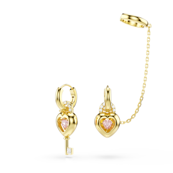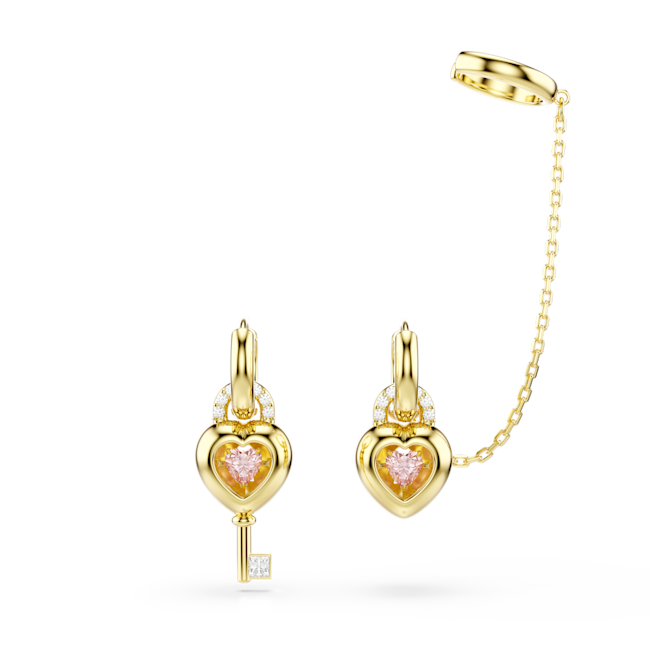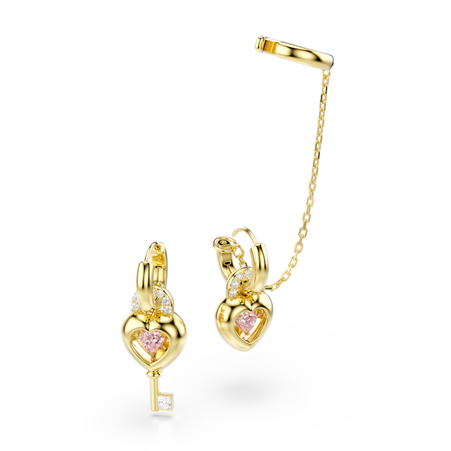 Idyllia Kelepçe küpeli damla küpe, Karışık kesimler, Anahtarlı kalp, Pembe, Altın rengi kaplama