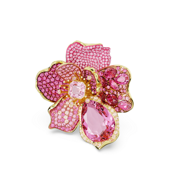 Her baktığınızda yeni detaylarını keşfedeceğiniz bu baş döndürücü Idyllia motif yüzük, Swarovski’nin değerli bilgi birikimini gözler önüne seren benzersiz bir parça. Altın rengi kaplama yüzük parmağınıza rahatça uyum sağlaması için iki adet yüzük halkasıyla tasarlandı ve her biri farklı boyut ve tonlardaki pembe kristallerle süslenmiş olağanüstü yapraklara sahip bir çiçeği gözler önüne seriyor. Görünümünüzle baş döndürücü bir etki yaratmanızı sağlar. Bu mücevher tüm ilgileri üzerinize çekmesi için tasarlandı.