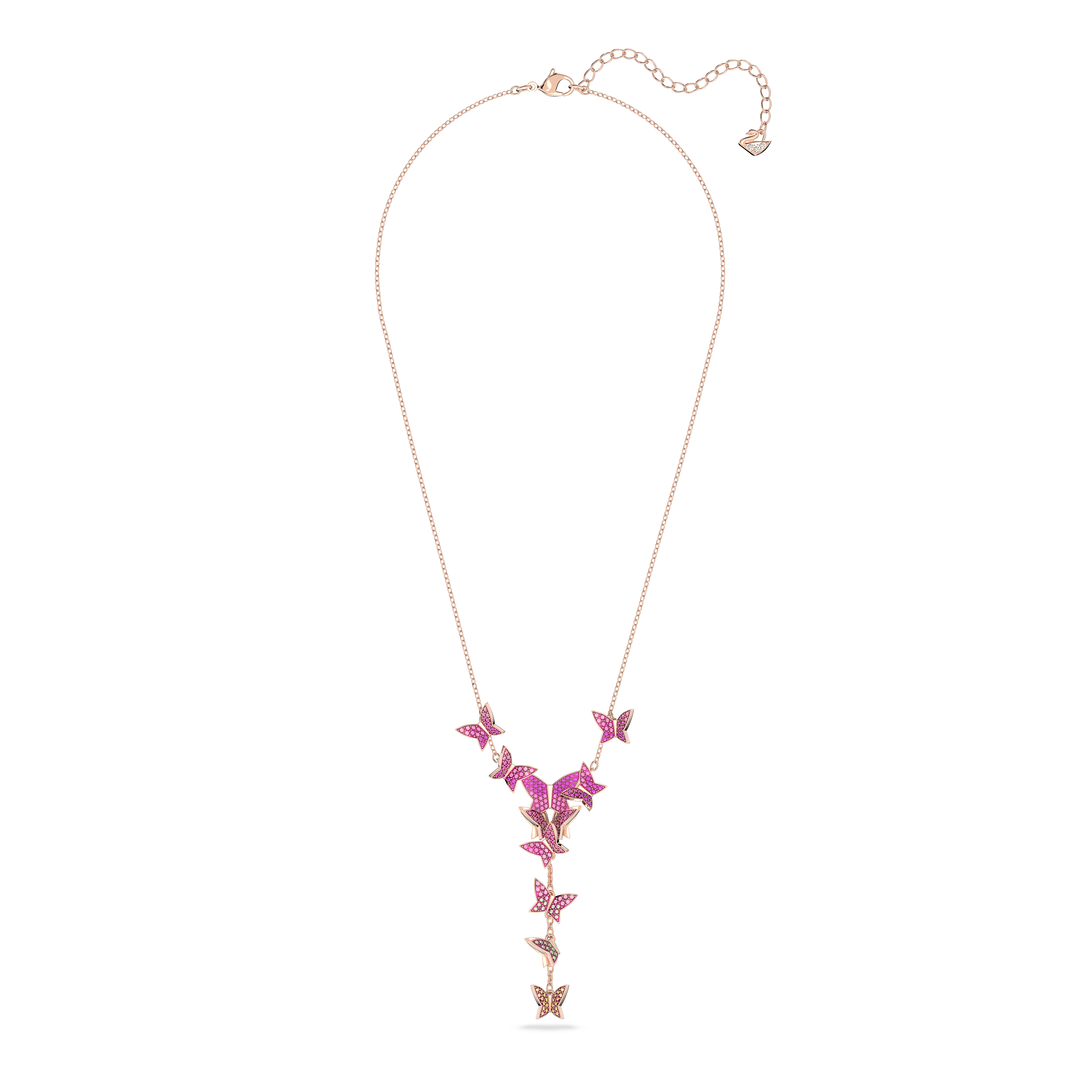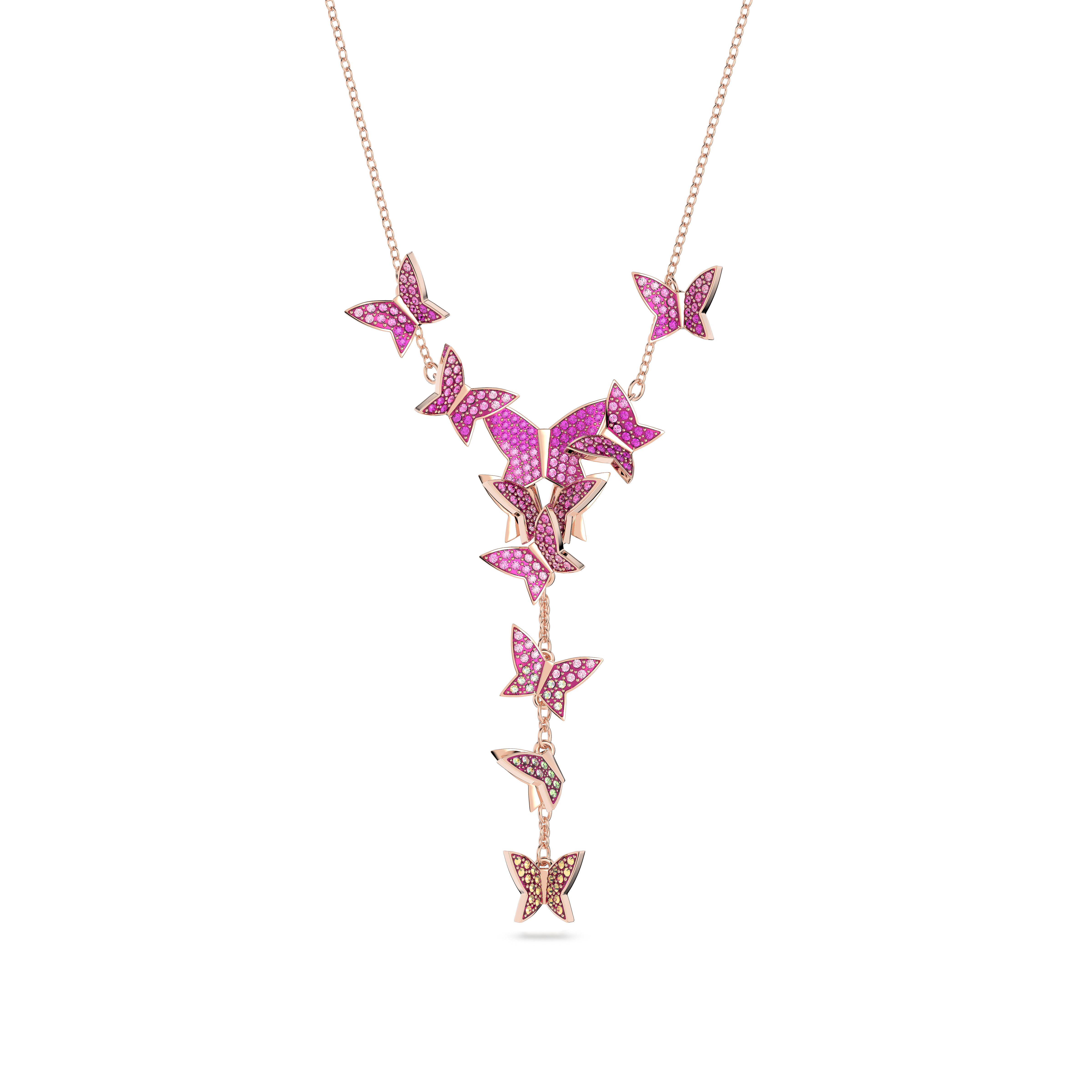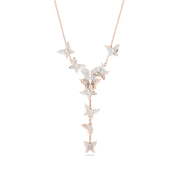 Bu Y şeklindeki kolye ile günlük şıklığınıza bir tutam zarafet katın. Işıltılı pembe pavé ile süslenmiş neşeli kelebekleri gözler önüne seren bu benzersiz parça, pembe altın renkli kaplamayla tasarlandı. Tasarımı sade beyaz bir tişört veya zarif akşam kıyafetleriyle birlikte kullanarak etkileyici bir izlenim bırakın.
