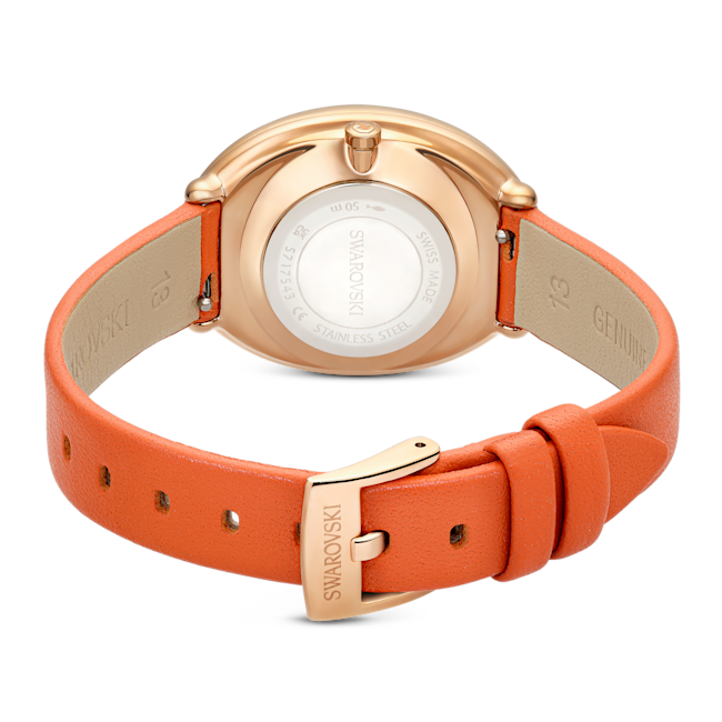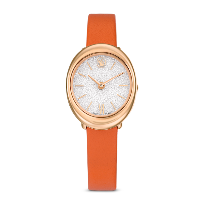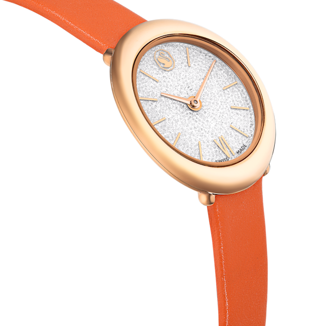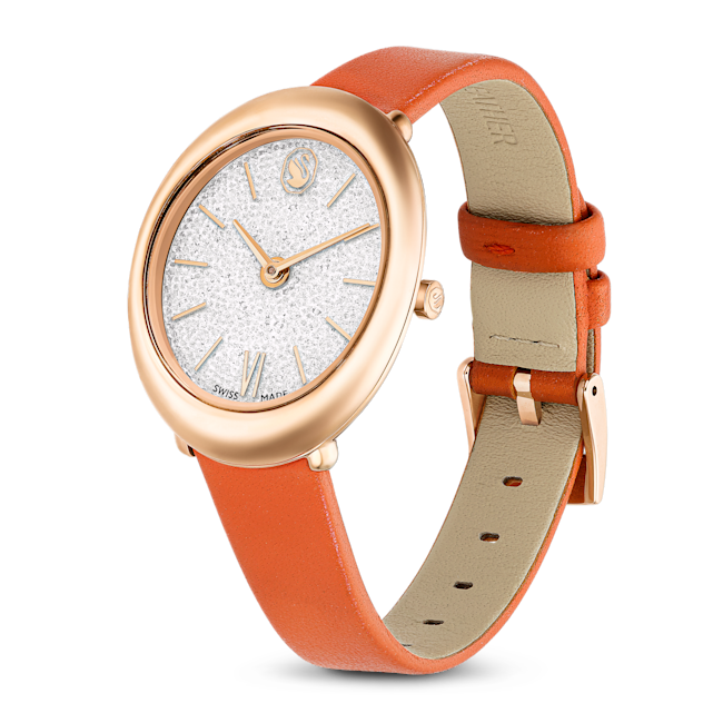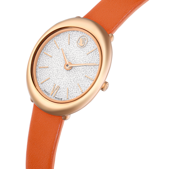 Imber Oval saat, ışıltılı kadranı ve zamansız eliptik şekliyle saatçiliğe modern bir yaklaşım getiriyor. 24 x 26,3 mm boyutlarındaki bu paslanmaz çelik model pembe altın tonunda kaplanmıştır ve Crystalline kadranında yaklaşık 1000 adet berrak kristal bulunuyor. İnce saat göstergeleri arasında, saat 6 yönünde tek bir Roma rakamı gösterilirken, Swarovski’nin ikonik kuğusu saat 12 yönünde yer alıyor. İsviçre yapımı saat, turuncu renkte şık bir deri kayış ile tamamlanıyor ve 50 metreye kadar su geçirmezlik özelliği sunuyor. Gündüzden geceye uzanan sofistike bir stil için tercihinizi bu saatten yana kullanın.