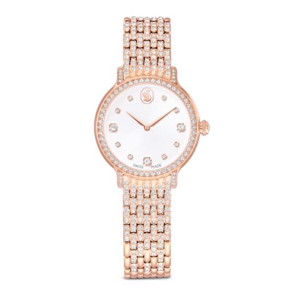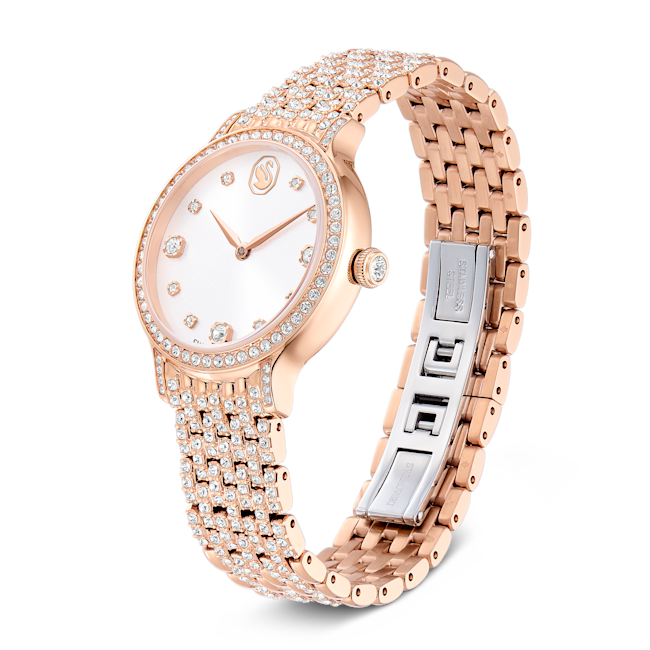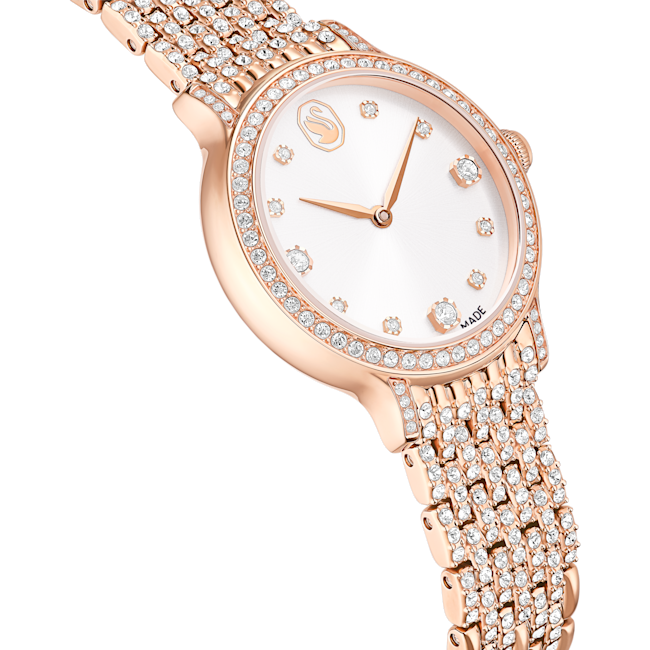 Bu 31 mm’lik saat, paslanmaz çelikten ve pembe altın rengi yüzeyin karışımı olup Imber takı ailesini tanımlayan metal ve kristallerin birleşiminden ilham alıyor. Pavé çerçeve 68 adet bireysel kristalle süslenirken, yedi bağlantılı bilekliği süslemek için 198 kristal daha kullanıldı. Güneş ışını kadranında, ışıltılı yüzeyi kristal gösterge işaretleriyle vurgulanırken, saat 12 konumunda sofistike bir Kuğu amblemi yer alıyor. İhtişam yayan bir seçim olan bu İsviçre Yapımı saat, 50 metreye kadar suya dayanıklıdır.