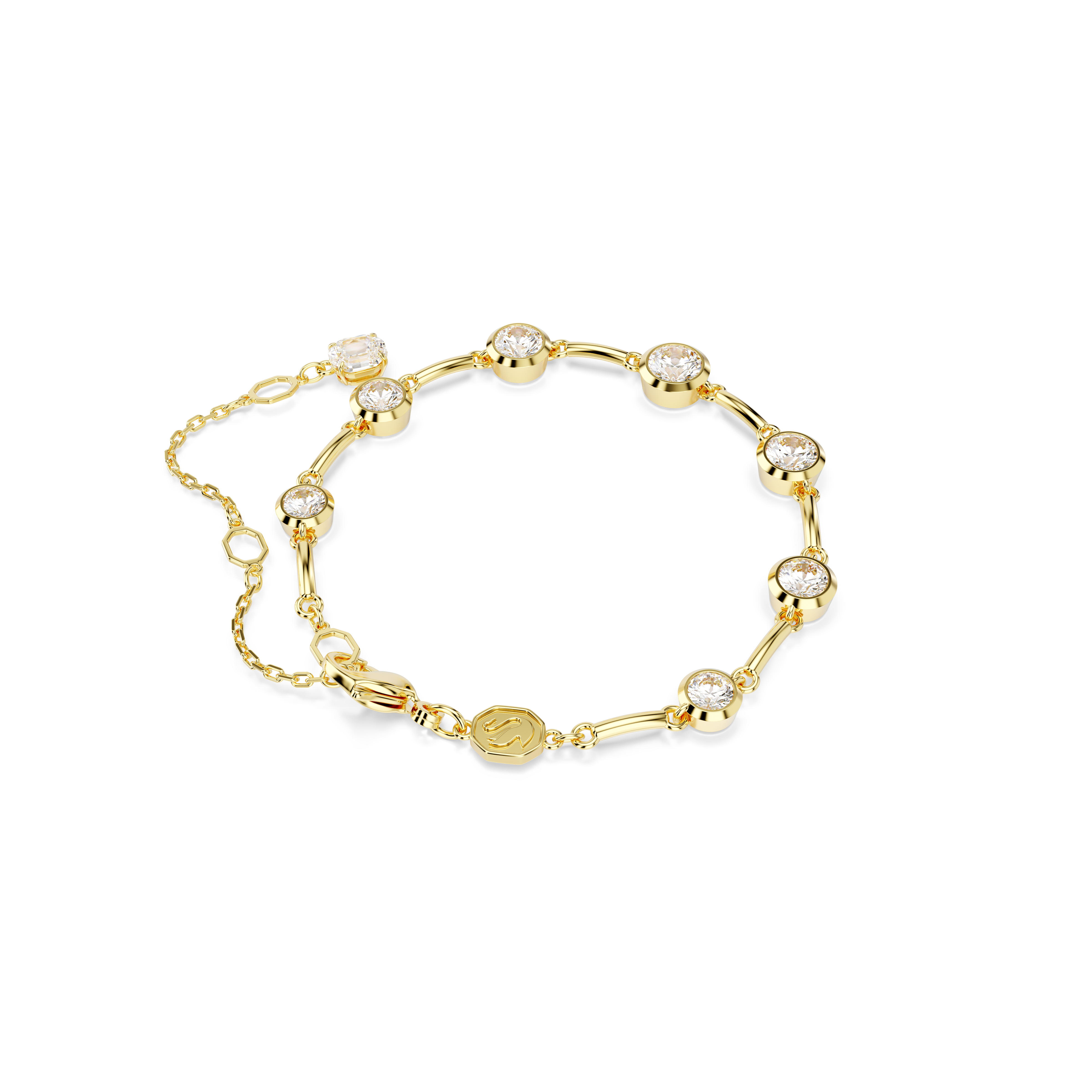 Imber ailesinin bir üyesi olan bu zarif bileklikte sadelik ön planda. Altın rengi kaplama tasarım, her biri modern bezel yerleştirmeyle hayat bulan yedi adet yuvarlak kesim Swarovski Zirkonya ile süslendi. Ayarlanabilir uyum için ıstakoz kapamaya, üç farklı boyutta konumlandırılan ve uzatma bileşeninin ucunda tekli bir Swarovski Zirkonya eşlik ediyor. Zarafet dolu görünümü maksimuma çıkarmak için bu bilekliği uyumlu bir Imber kolyeyle birlikte kullanın.