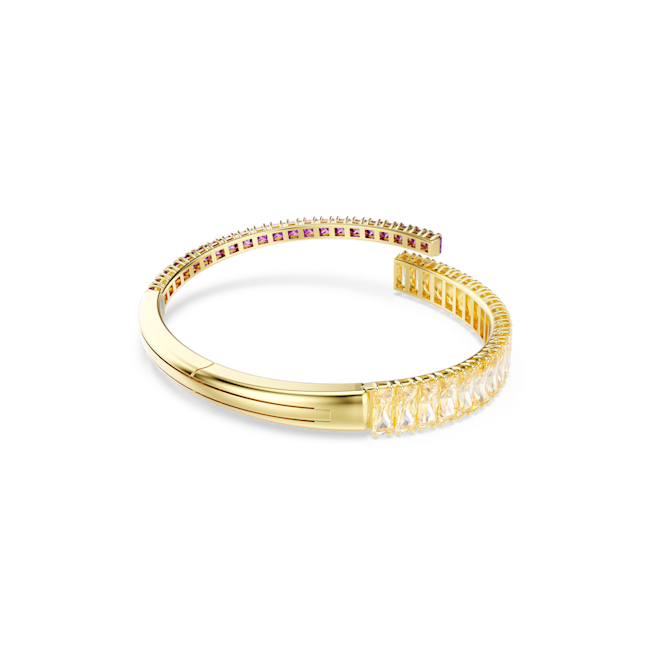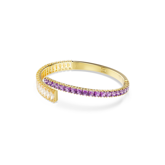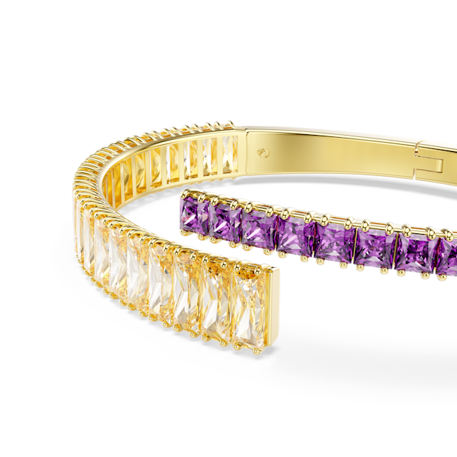Renkli, enerjik ve etkileyici bu Matrix halka bileklik, aksesuar kullanmanın neşeli bir yolunu sunuyor. Kolay açılmasını sağlayan bir yaylı menteşe mekanizmasına sahip üst üste binen bant, altın rengi kaplamalı olup kare ve baget kesim karamel ve mor Swarovski Zirkonya’ya sahiptir. Uyumlu yüzükle güzel bir şekilde eşleşen capcanlı bir seçim.