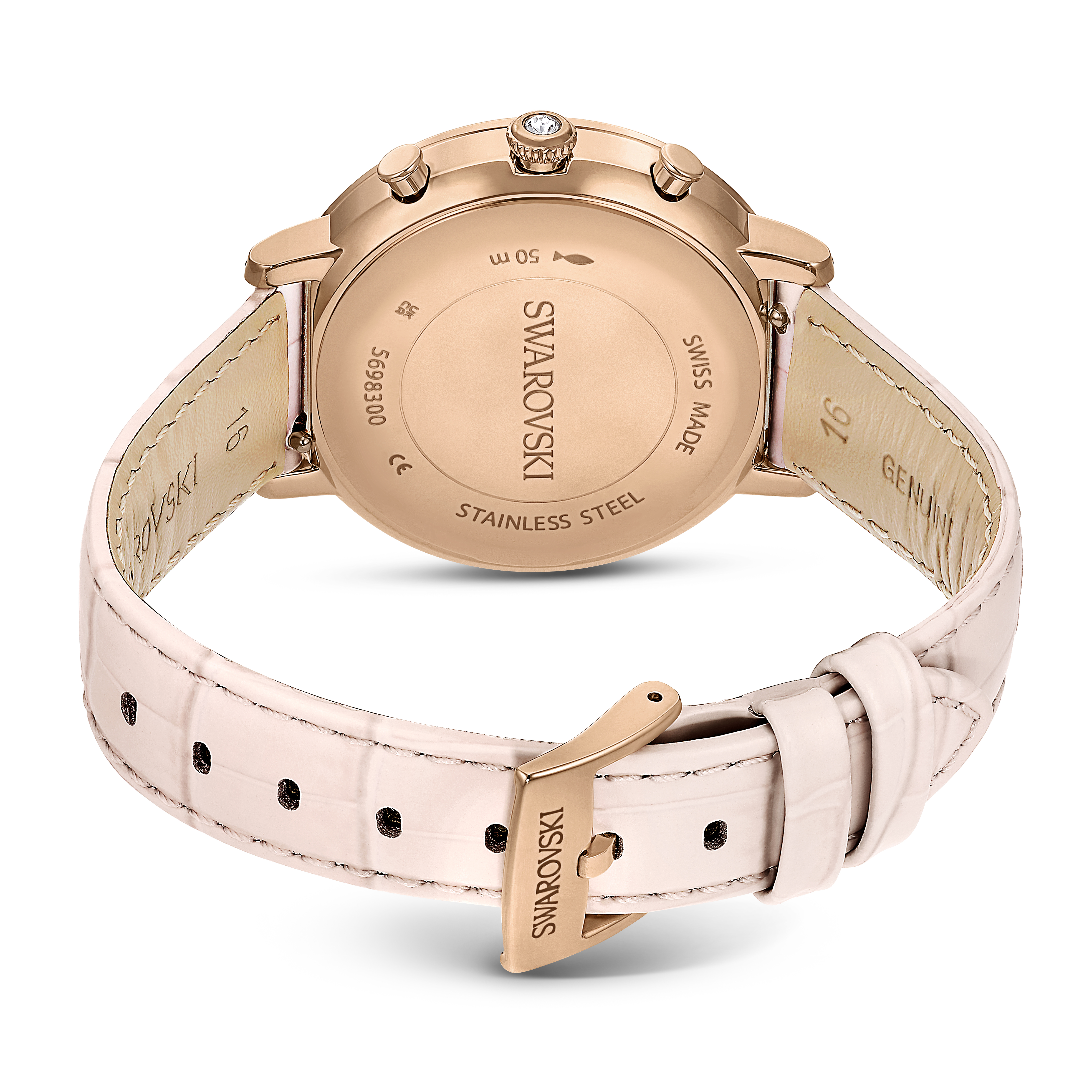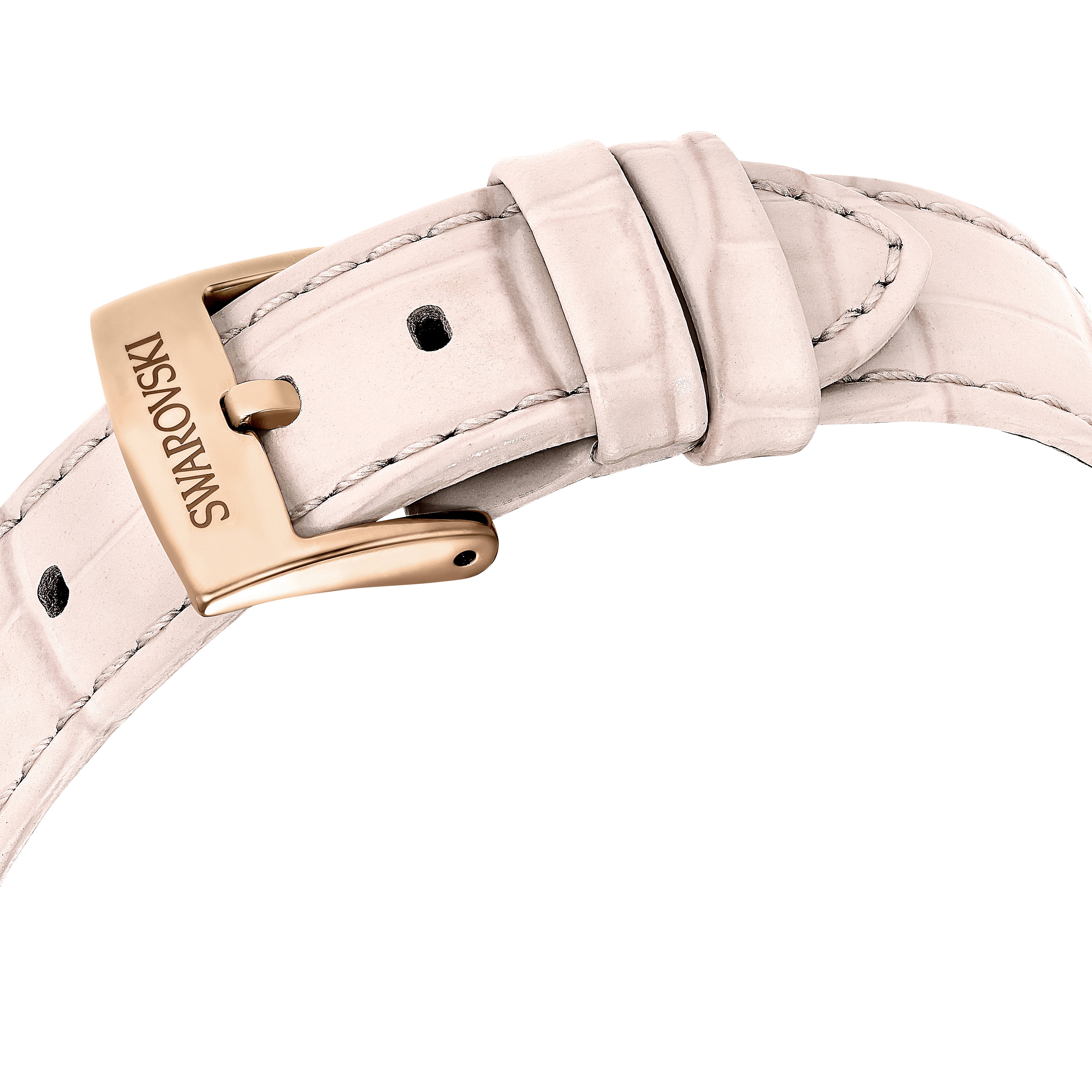 Swarovski’nin efsanevi Matrix Tennis takı formunu yansıtan bu kronograf saat, kristaller aracılığıyla kendine özgü zarif bir etki bırakıyor. 36 mm paslanmaz çelik tasarım, pembe altın rengi yüzeyle ve çerçeveyi süsleyen 48 adet berrak kristalden oluşan bir pavéyle tamamlanıyor. Pembe kadran, güzelliğini daha da artırmak için guilloché desenli yuvarlak kristal saat imleçleri ve seçkin bir kuğu logosuyla tamamlanıyor. Üç adet küçük kadran ise saniye, dakika ve saat için ayrı sayaçlar sunarak kronograf işlevlerini yerine getiriyor. Bileğinizde ise kabartmalı bir timsah deseni ve kolay takılıp çıkarılabilen bir sistemle tamamlanan pembe buzağı derisi kordon konforlu bir kullanım sağlar. 50 metreye kadar suya dayanıklı olan bu İsviçre yapımı saatin kurma kolunda tekli bir kristal yer alıyor. Kusursuz ve eksiksiz bir görünüm için Matrix Tennis ailesindeki takılarla birlikte takın.