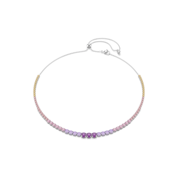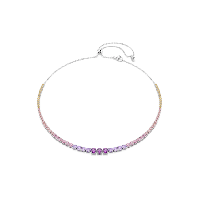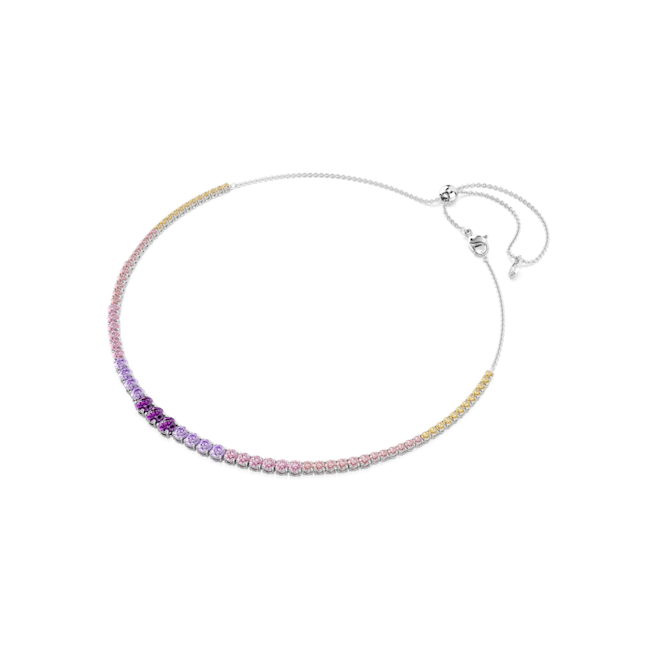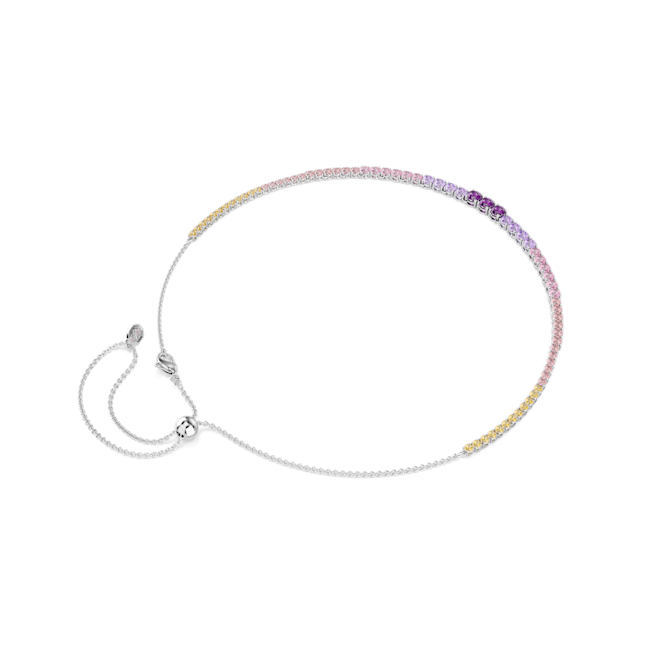Efsanevi Matrix Tennis kolyeye yeni bir boyut kazandıran bu rodyum kaplamalı tasarım, pastel renklerin ve boyutların dinamik bir geçişini sergiliyor. Yuvarlak kesim kristallerden oluşan ışıltılı strand, pembe, mor ve sarı tonlar arasında geçiş yaparak kendi çekici etkisini yaratıyor. Bu kolyeyi, kendinize uyacak şekilde ayarlayabilir ve görünümü en üst düzeye çıkarmak için uyumlu küpe veya bileklikle birlikte kullanılabilirsiniz.