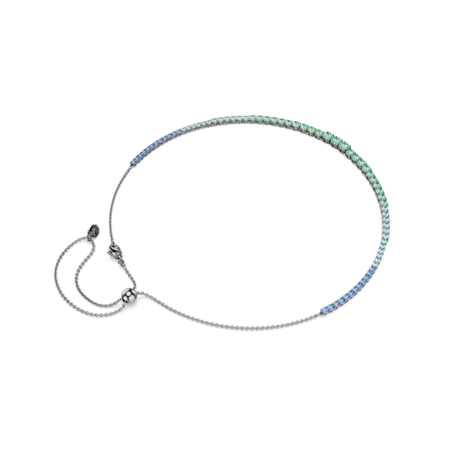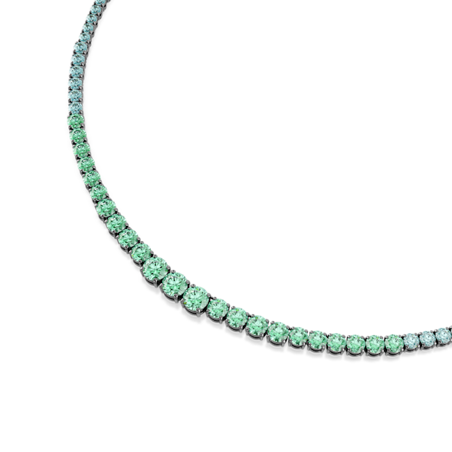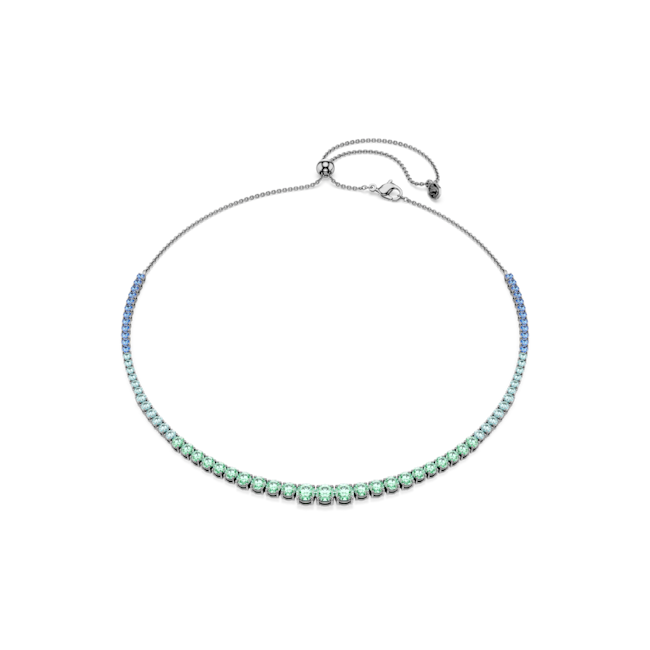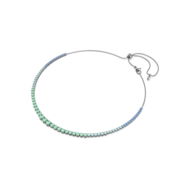 Efsanevi Matrix Tennis kolyeye yeni bir boyut kazandıran bu rutenyum kaplamalı tasarım, renklerin ve boyutların dinamik bir geçişini sergiliyor. Yuvarlak kesim kristallerden oluşan ışıltılı strand, yeşil ve mavi tonlar arasında geçiş yaparak kendi çekici etkisini yaratıyor. Bu kolyeyi, kendinize uyacak şekilde ayarlayabilir ve görünümü en üst düzeye çıkarmak için uyumlu küpe ile birlikte kullanılabilirsiniz.