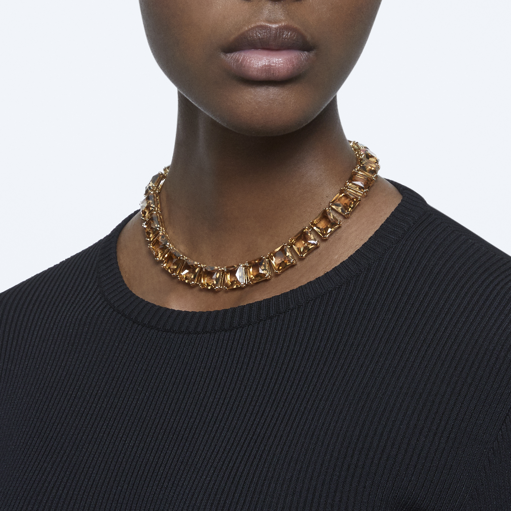 Bir dizi koyu sarı kare kesim kristalle oluşturulan ve uyumlu altın rengi kaplama yerleştirme ve gizli sürgüyle tamamlanan bu parça, prizmatik renkleri günlük repertuvarınıza katıyor. Ayarlanabilir uzunluğuyla sonsuz kullanım seçeneğine sahip bu parçayı Millenia ailesine ait kontrast yaratan mücevher tonlarındaki diğer parçalarla birlikte takın veya tek başına kullanarak cesur bir duruş sergileyin. Kreatif Direktör Giovanna Engelbert tarafından Collection II için tasarlanmış olan bu kolye, Millenia ailesinin bir üyesi. Nasıl kapanır ve açılır: yuvarlak batonu karşılık gelen en geniş zıt halkaya yerleştirin ve en alta kadar aşağı kaydırın. Yerleştirdikten sonra kapamayı sabitlemek için üstteki D halka güvenlik mandalını indirin. Açmak için D yüzük güvenlik mandalını kaldırın ve batonu çıkarmak için en geniş noktaya kadar kaydırın.