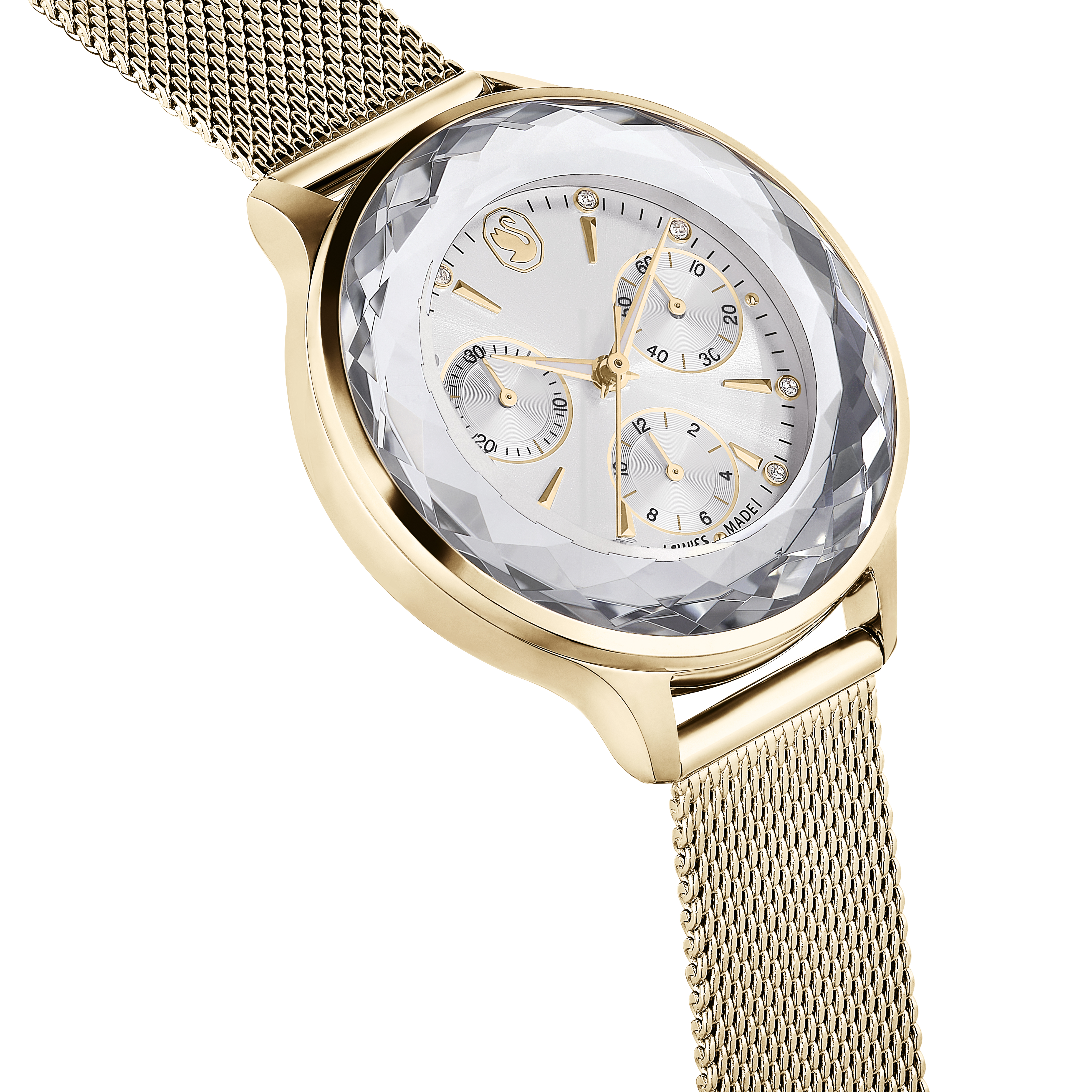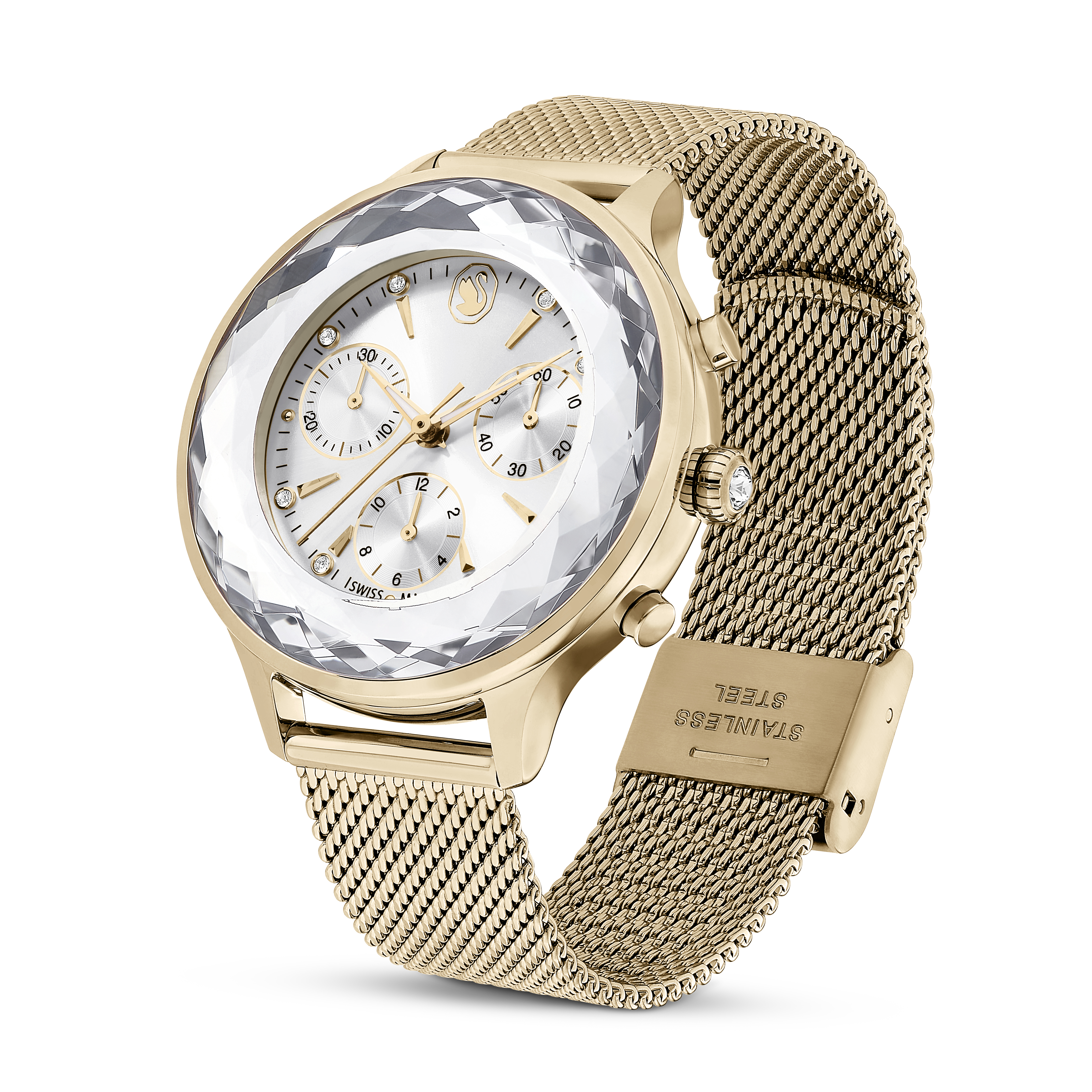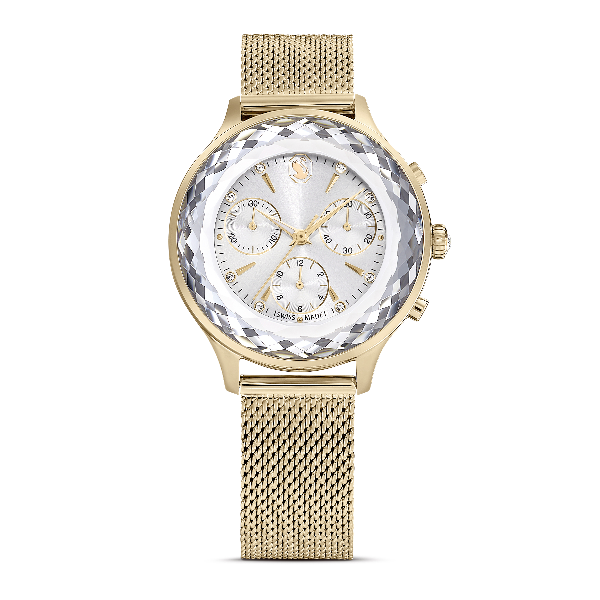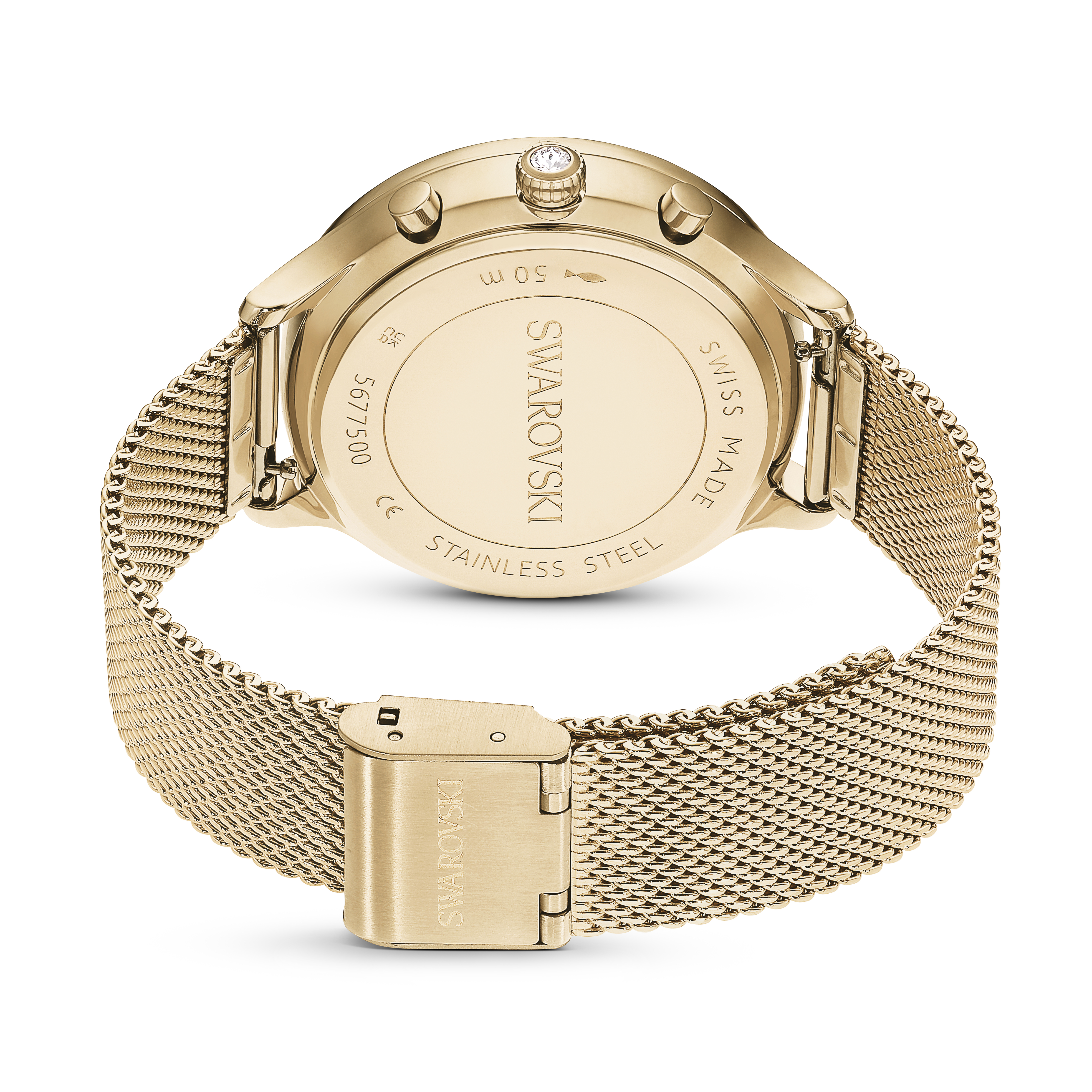 Sportif bir lüks tarzı temsil eden bu Nova Chrono saat, Swarovski’nin tasarım uzmanlığını vurgulamak için detaycı bir dokunuşla tasarlandı. 37 mm paslanmaz çelik kasa şampanya altın rengi bir yüzeyle, kusursuz bir şekilde entegre edilen oldukça güzel façetalı bir kristal çerçeveyle ve safir saat camıyla tamamlandı. Bu tasarım; kuğu logosu, kristal gösterge işaretleri ve dakika, saniye ve saat sayacıyla tamamlanan üç adet küçük kadranla süslenen ışıltılı güneş ışını kadranı sarıyor. Bu modern saat, bileğinize kolayca takılıp çıkarabileceğiniz Milano tarzı bilekliğin üzerinde geliyor. Şampanya altın rengi akrep ve yelkovan ekstra ışıltı için Luminova ile kaplandı. Kurma koluna tekli bir kristal yerleştirilen İsviçre yapımı saat 50 m’ye kadar suya dayanıklı olmasının yanı sıra hem iş hayatınız hem de özel hayatınızda kullanabileceğiniz çok yönlü bir seçimdir.