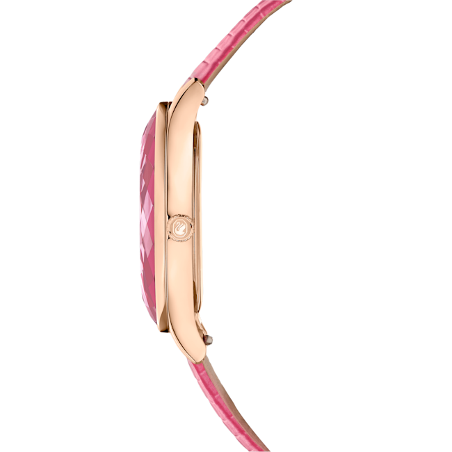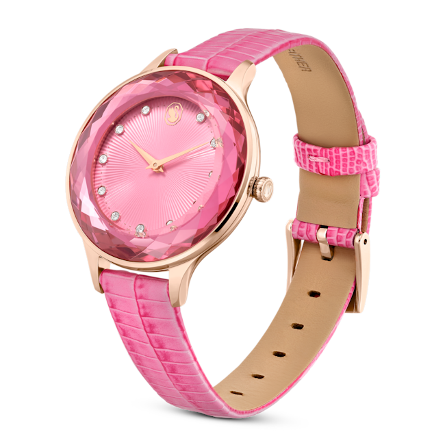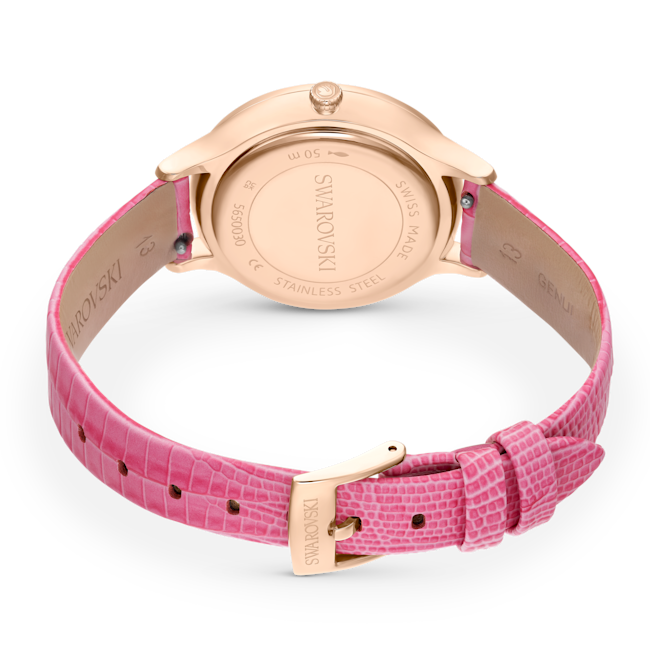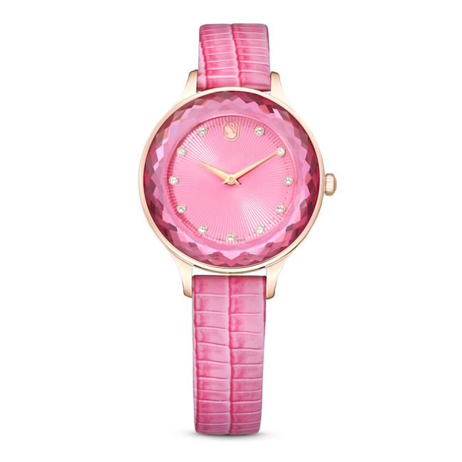 Bu eğlenceli 33 mm’lik saat, ruhunuzun en eğlenceli yanını yansıtmanıza olanak veren parlak bir renk dokunuşuna sahip. Pembe altın rengi yüzey ve pembe renk paleti bir araya getirilirken, ince detaylara sahip çerçeve ve yüzey 72 adet façetasını sergileyen tek bir safir parçasından oluşmuş kristalden tasarlandı. Pembe guilloche kadran, kristal gösterge işaretleri ve saat 12 konumunda bulunan asil bir kuğu tasvirini gözler önüne seriyor. İsviçre üretimi saat 50 metreye kadar suya dayanıklı olmasının yanı sıra kertenkele desenli İtalyan dana derisi kordonla birlikte gelmektedir. Etkileyici bir tarz oluşturmak için bu canlı saati baş döndürücü bir aksesuar olarak kullanın.