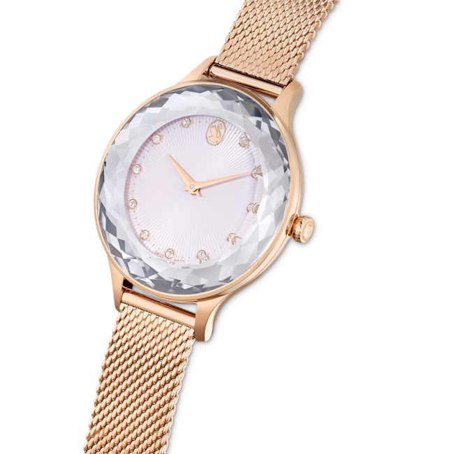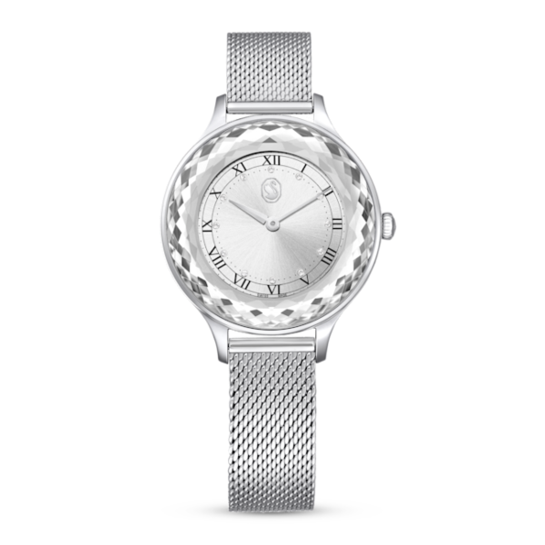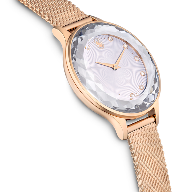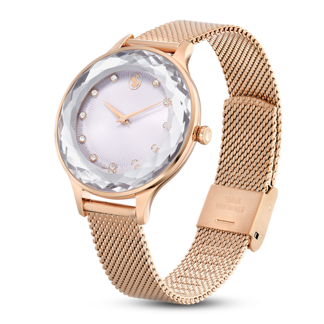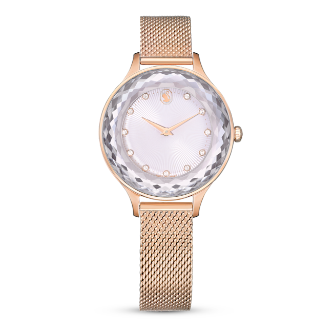 Anında zamansız bir görünüm kazandıran bu 33 mm’lik saat gümüş rengi kadranı, pembe altın rengi ile tamamlanmış bir kasa ve Milanese bileklikle taçlandırıldı. Bu çekici tasarım, 72 adet façetaya sahip tek bir safir kristal parçasından oluşan ince detaylarla saat çerçevesi ve yüzeyini ilgi odağı hâline getiriyor. Kadran, daha da çarpıcı bir etki yaratması için guilloche deseni ile üretildi ve kristal gösterge işaretlerinin yanı sıra saat 12 konumunda bulunan asil bir kuğuya yer veriyor. Bu benzersiz İsviçre üretimi saat 50 metreye kadar suya dayanıklı olmasının yanı sıra hem gündüz hem de gece kullanılabilecek lüks bir görünüm sunuyor.
