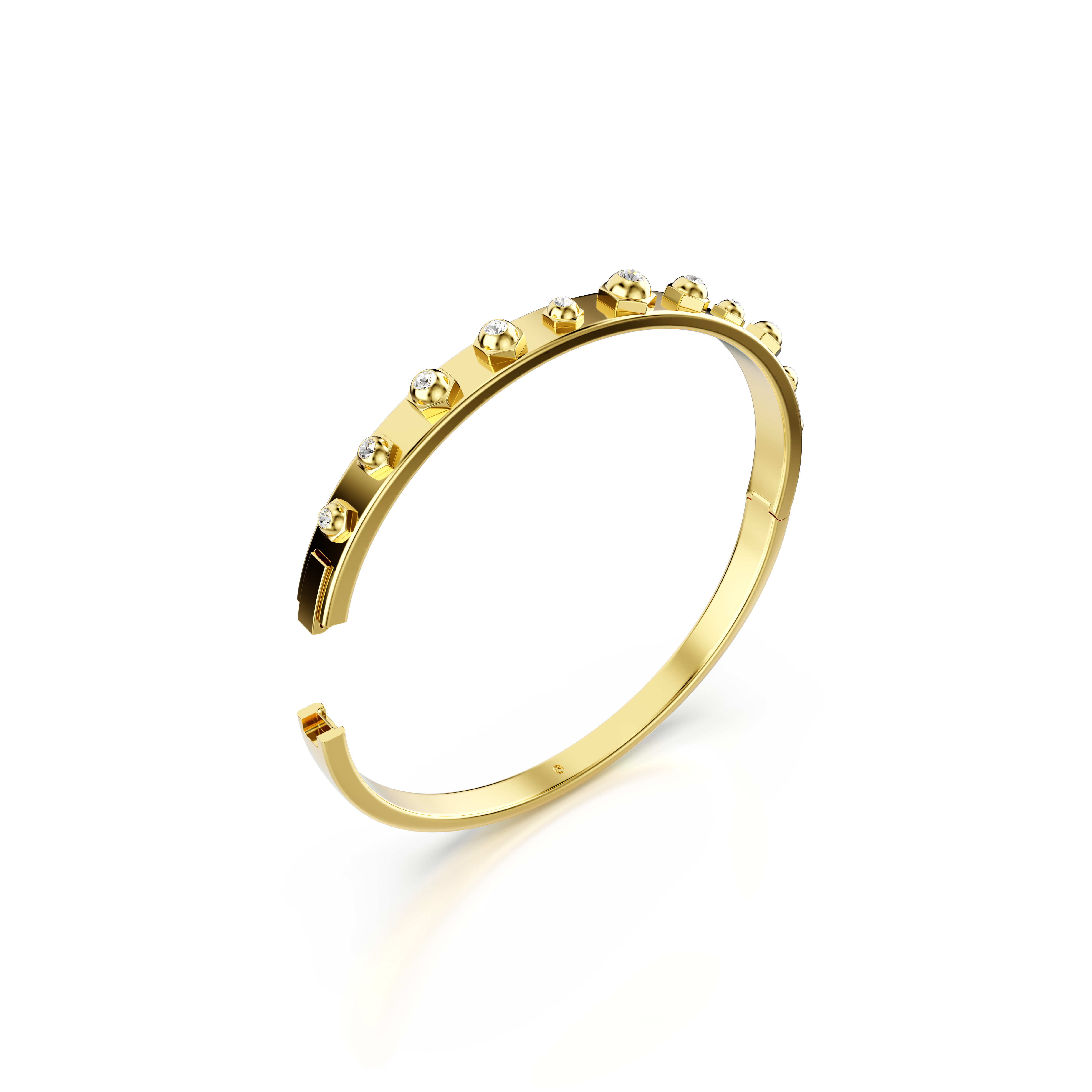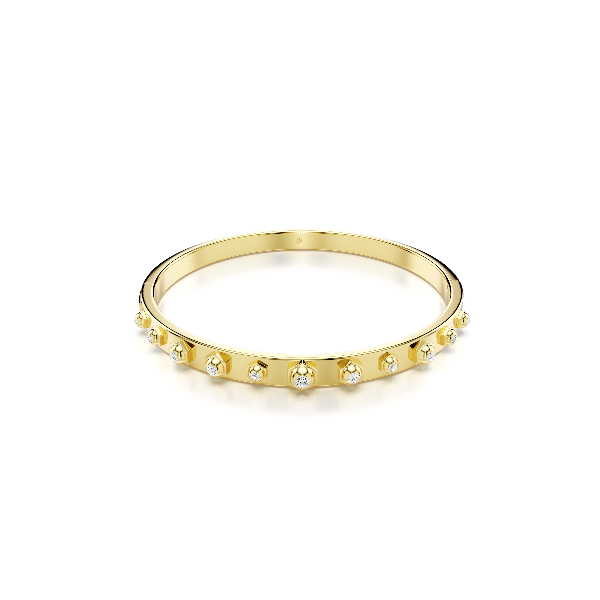 Bu Numina halka bileklik, ışıltılı güzelliği endüstriyel bir tarzla birleştiriyor. Altın rengi kaplamayla tasarlanan metalik parça, farklı boyutlarda berrak yuvarlak kristallerden oluşan bir süslemeye yer veriyor. Sizi gündüzden geceye taşıyacak olan cesur ve kendine özgü bir tasarım.