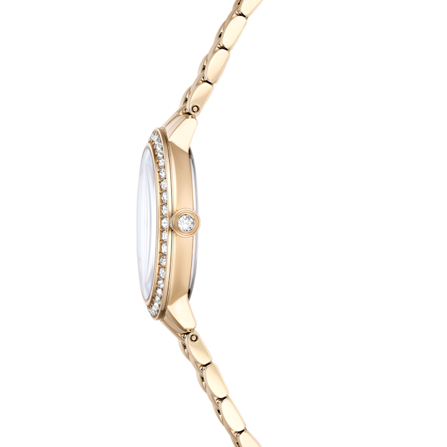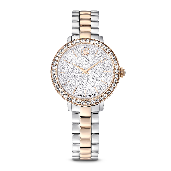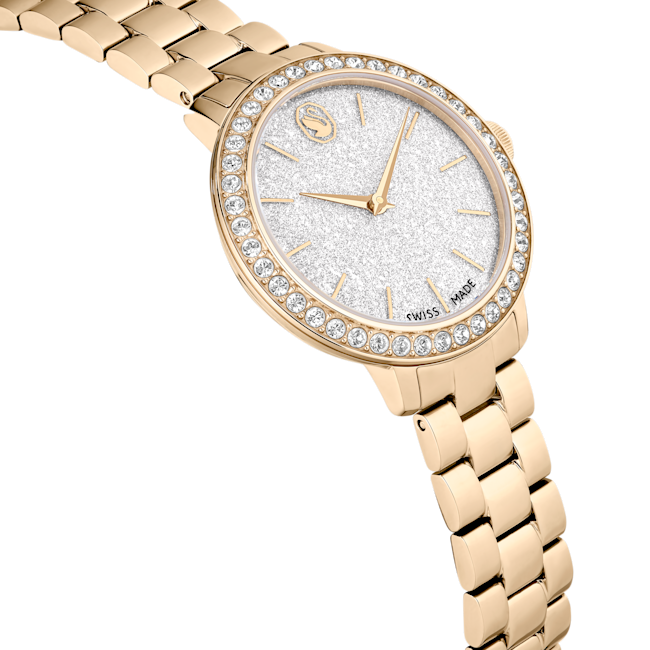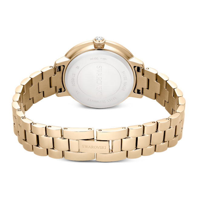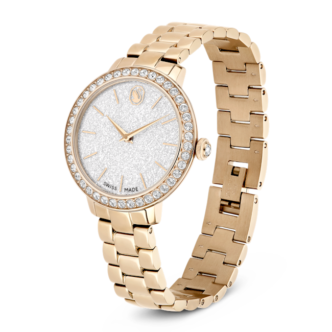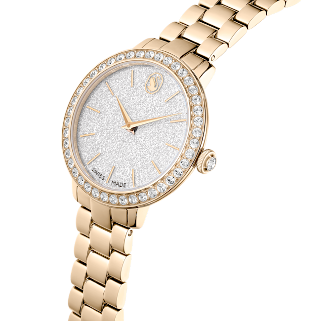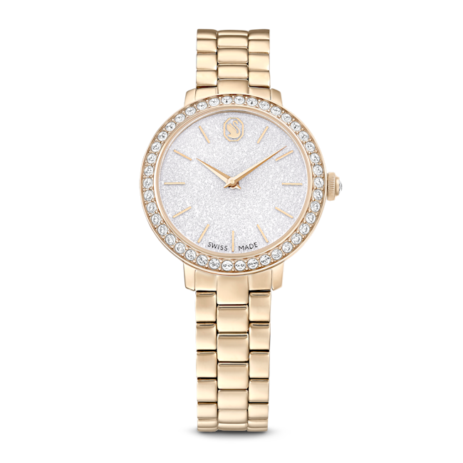 Swarovski’nin Matrix takılarından ilham alan bu 30 mm boyutundaki saat, aynı çağdaş ve dışavurumcu tarz anlayışını yansıtıyor. Şampanya-altın rengi paslanmaz çelik tasarım, 42 kristal set pavé çerçeveye sahiptir. Güzel yuvarlak kadran ışıltılı bir etkiye sahip olup ince saat imleri ve kolları ile saat 12 konumunda kuğu logosu içerir. Taç kısmında yer alan ek bir kristal setle tamamlanan bu saat, bileğinizde zarif bir şekilde kayan üç halkalı bilekliği ile dikkat çekiyor. İsviçre yapımı saat, 50 metreye kadar suya dayanıklıdır ve her gün için mükemmel bir eşlikçidir.