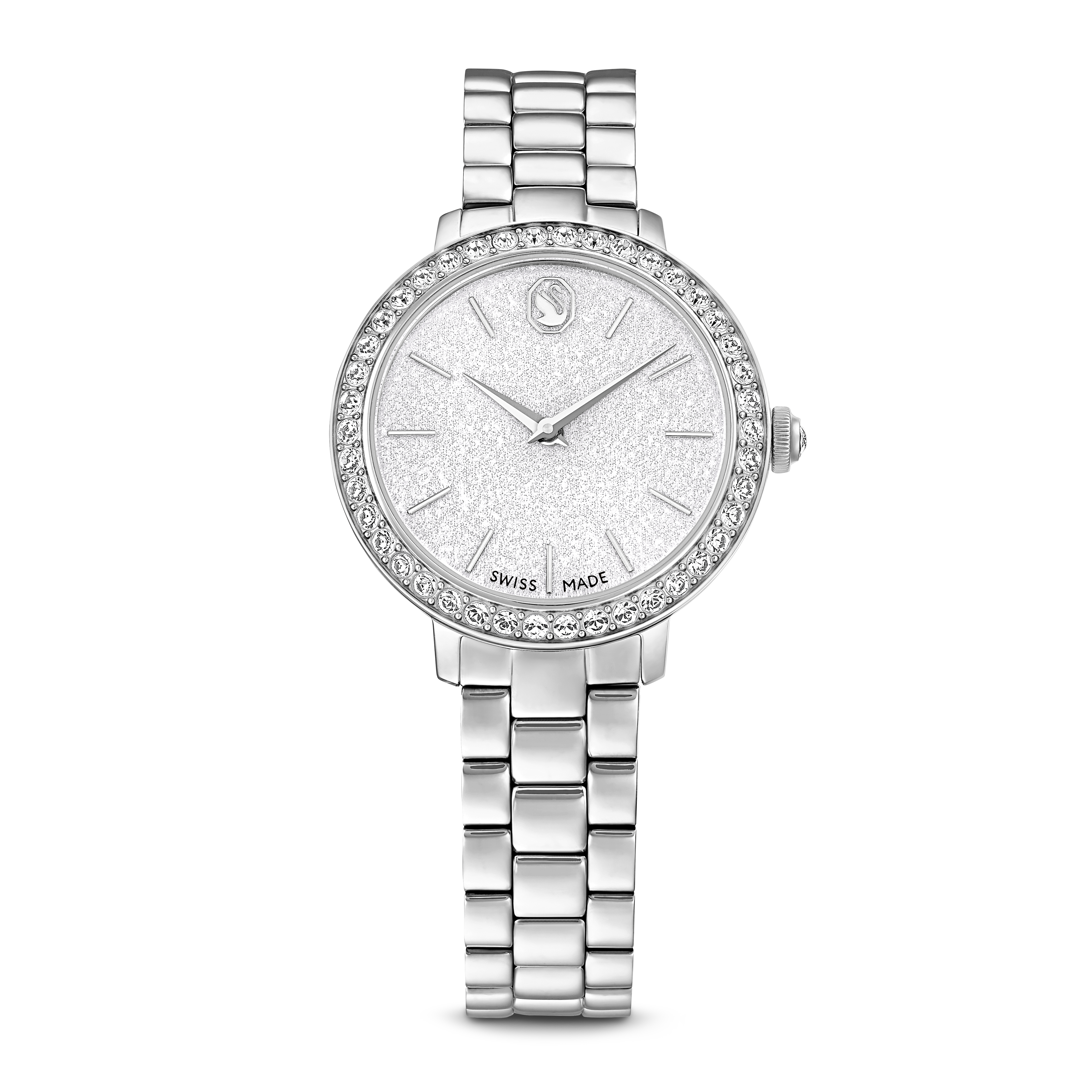 Swarovski’nin Matrix takılarından ilham alan bu 30 mm boyutundaki saat, aynı çağdaş ve dışavurumcu stili yansıtıyor. Paslanmaz çelik tasarım, 42 kristal set pavé çerçeveye sahipken, güzel yuvarlak kadran ışıltılı bir etkiyle tamamlanıyor ve ince saat imleri ve kolların yanı sıra saat 12 konumunda kuğu logosu bulunuyor. Kurma koluna ek olarak set kristal bulunan bu saat, bileğinizde zarif bir şekilde kayan üç halkalı bilekliğiyle dikkat çekiyor. İsviçre yapımı saat, 50 metreye kadar suya dayanıklıdır ve her gün için mükemmel bir eşlikçidir.