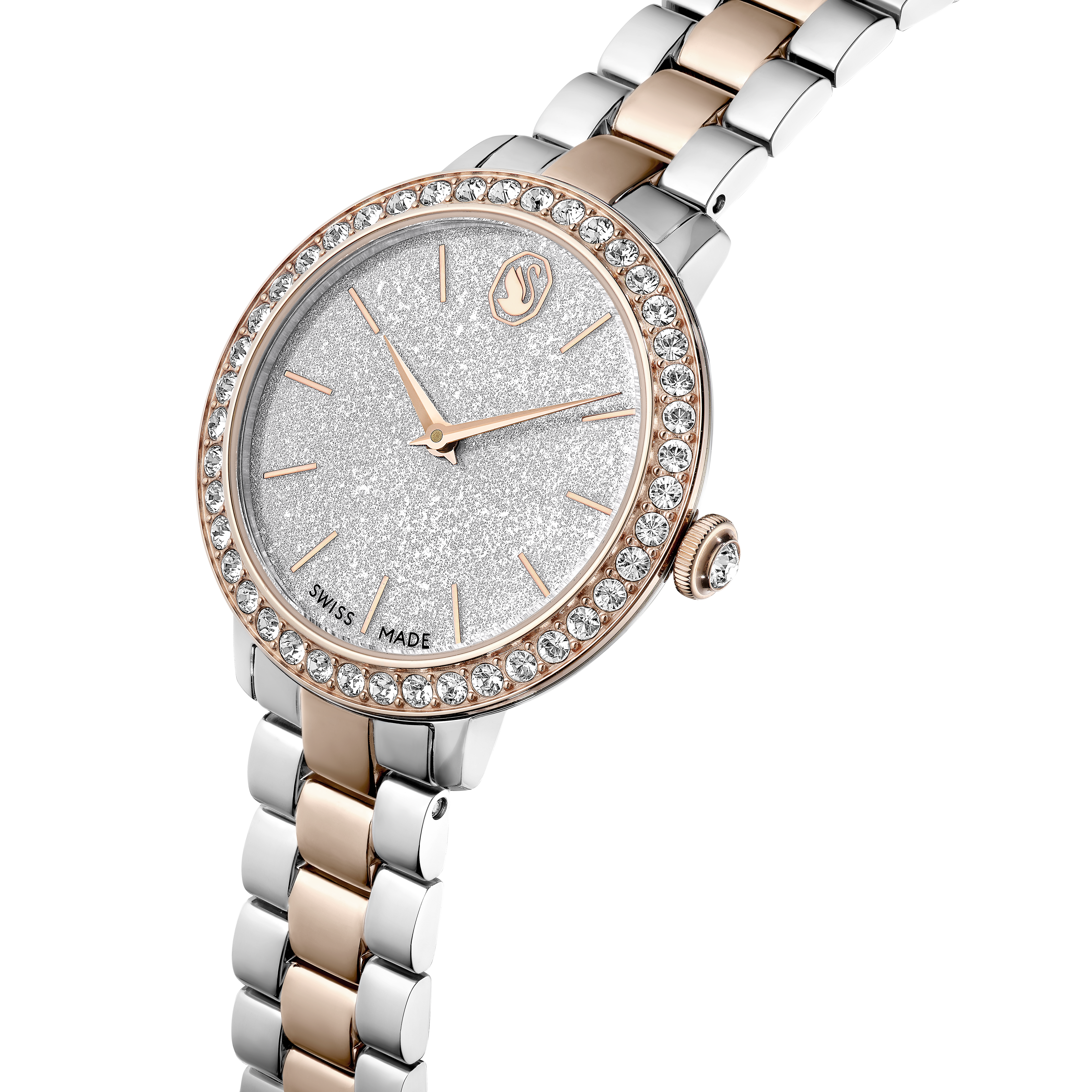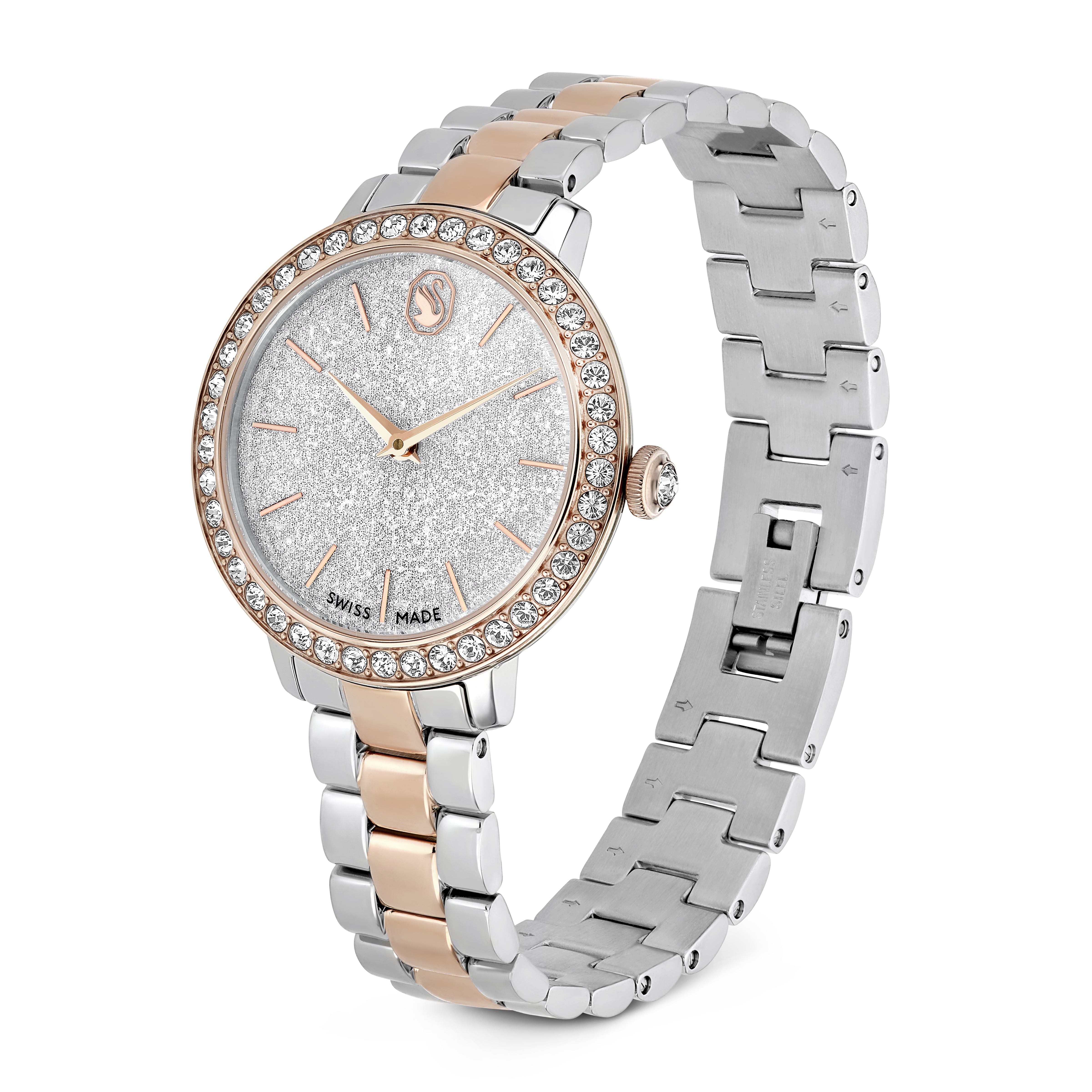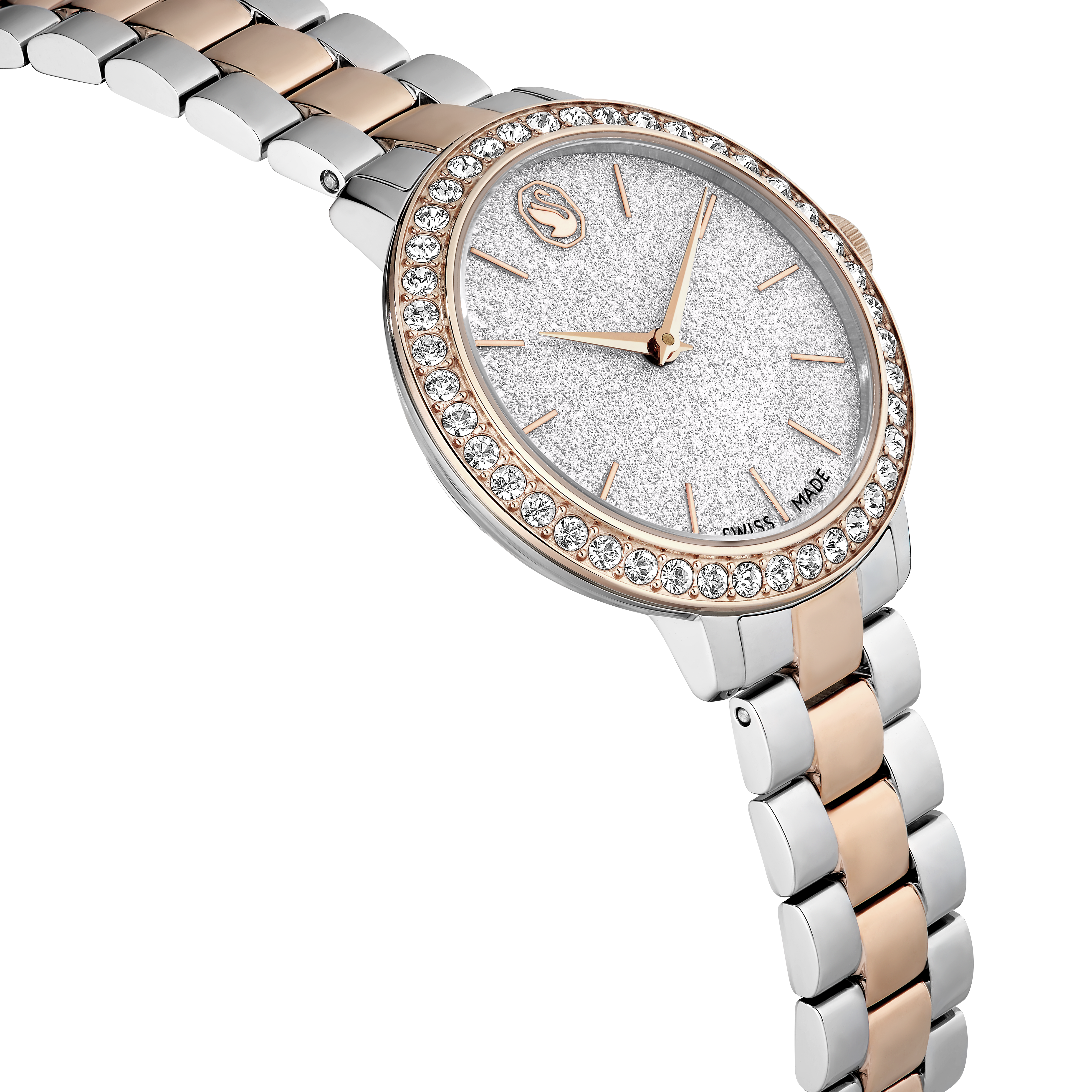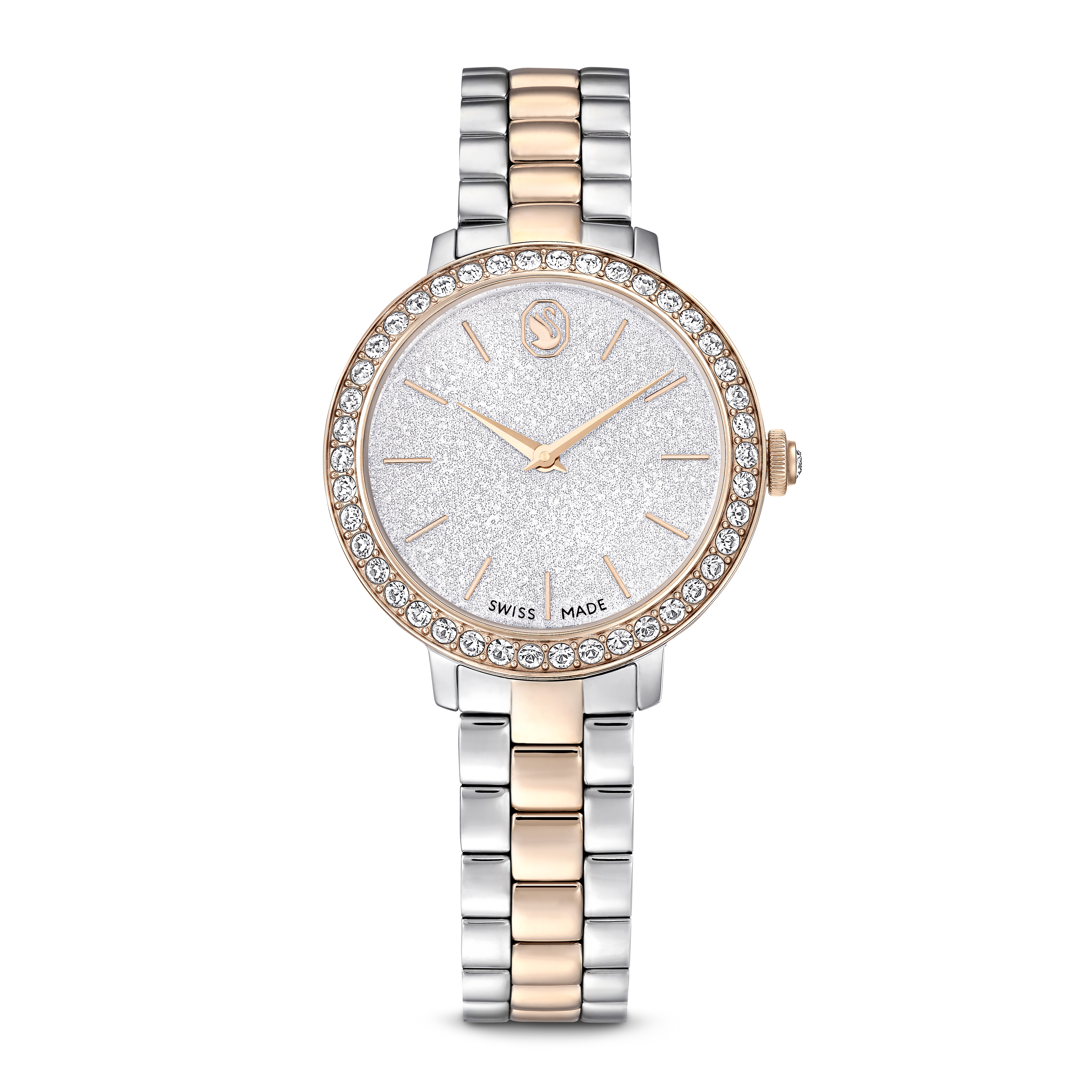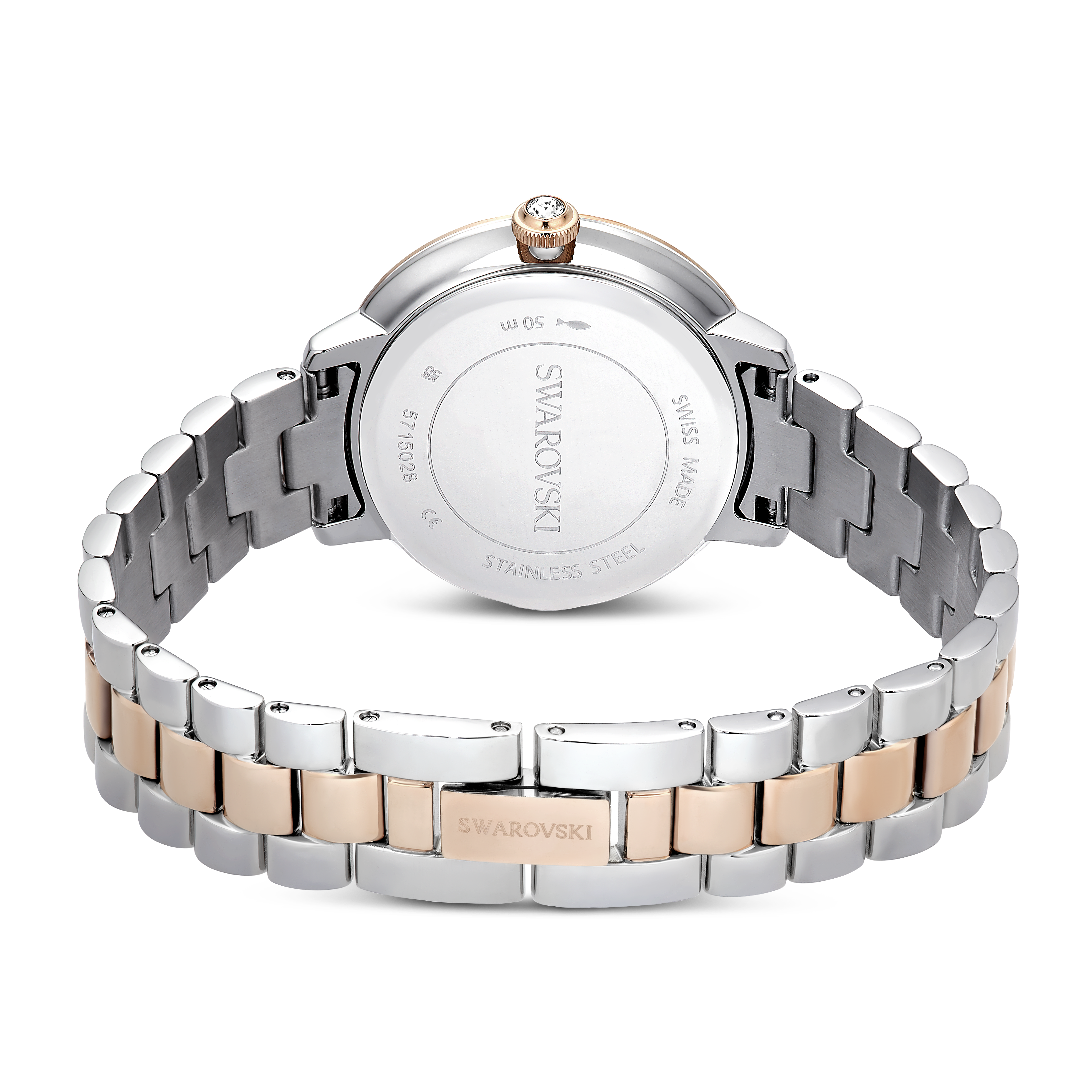 Swarovski’nin Matrix takılarından ilham alan bu 30 mm saat, aynı çağdaş ve dışa vuran tarz anlayışını yansıtıyor. Paslanmaz çelik ve pembe altın rengi kaplama tasarımlı saat, 42 kristal set pavé bir çerçeveye sahiptir. Güzel yuvarlak kadran, ışıltılı bir etkiye sahip olup ince saat imleri ve kolları ile saat 12 konumunda yer alan kuğu logosuyla tamamlanıyor. Kurma koluna ek olarak set kristal bulunan bu saat, bileğinizde zarif bir şekilde kayan üç halkalı bilekliğiyle de dikkat çekiyor. İsviçre yapımı saat, 50 metreye kadar suya dayanıklıdır ve her gün için mükemmel bir eşlikçidir.