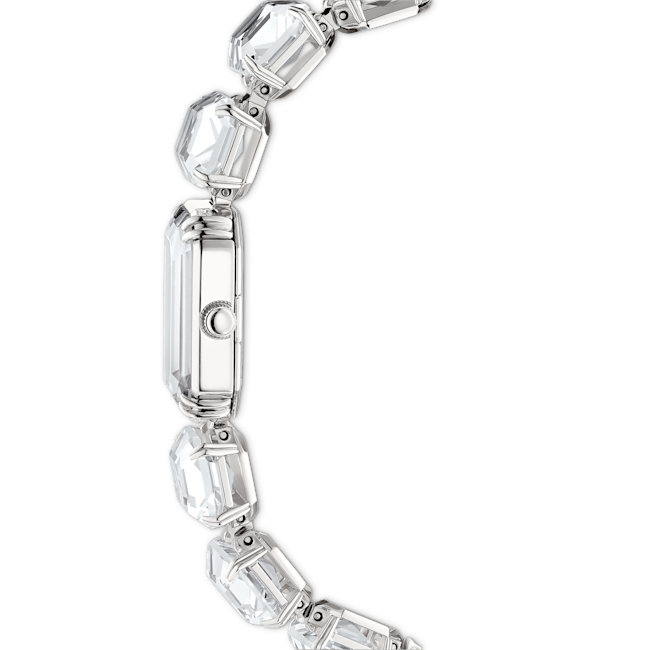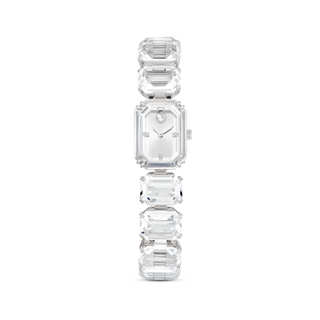 Millenia ailesinden ilham alan bu göz alıcı bileklik saat, günlük görünümünüze ışıltı katacak. Uzmanlıkla işlenmiş berrak sekizgen kesimli kristallerden oluşan bir sıra ile tasarlanan bu saat, gümüş rengi kadranı, kristalize çerçevesi ve paslanmaz çelik kaplamasıyla dikkat çekiyor. 50 metreye kadar suya dayanıklı olan bu zarif saat, tek başına veya diğer takılarla birlikte kullanılabilir.