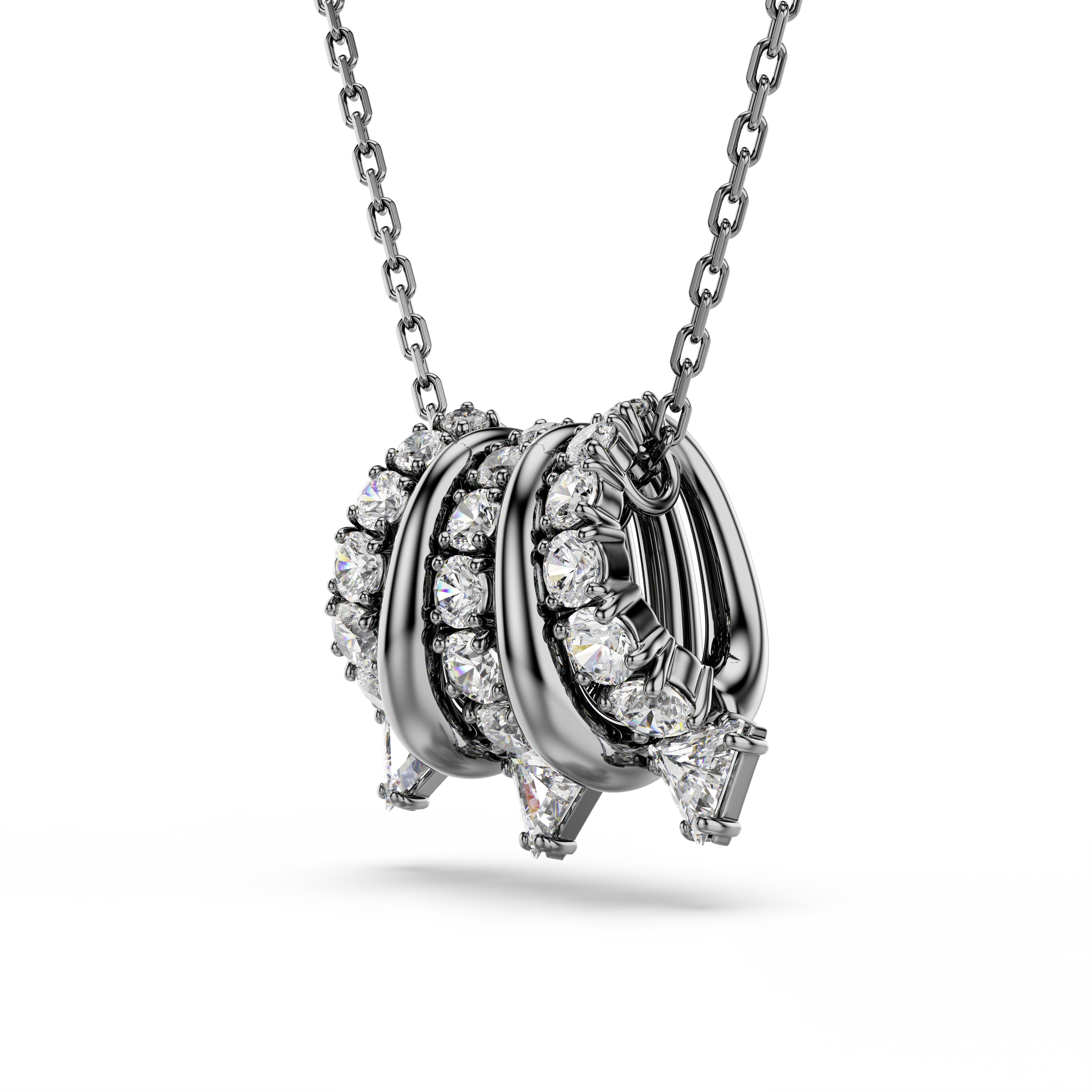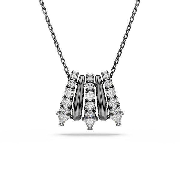 Bu günlük kullanım için çarpıcı ve alternatif bir görünüme sahiptir. Bu rutenyum kaplama kolye, metal spiraller ve berrak Swarovski Zirkonya içeren beş ayrı halkadan oluşan zarif bir zincire asılıdır. Dikenli uçlar çağdaş bir görünüm katar ve aynı etkileyici seriden parıldayan kelepçe küpeler ile mükemmel uyum sağlar.