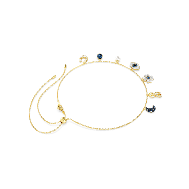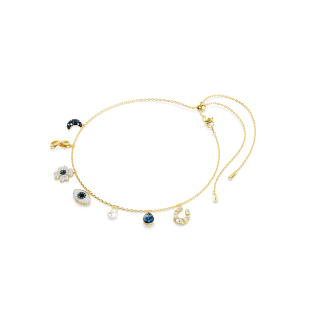 Symbolica Gerdanlık, Kristal inci, Ay, sonsuzluk, yonca, nazarlık ve at nalı, Mavi, Altın rengi kaplama