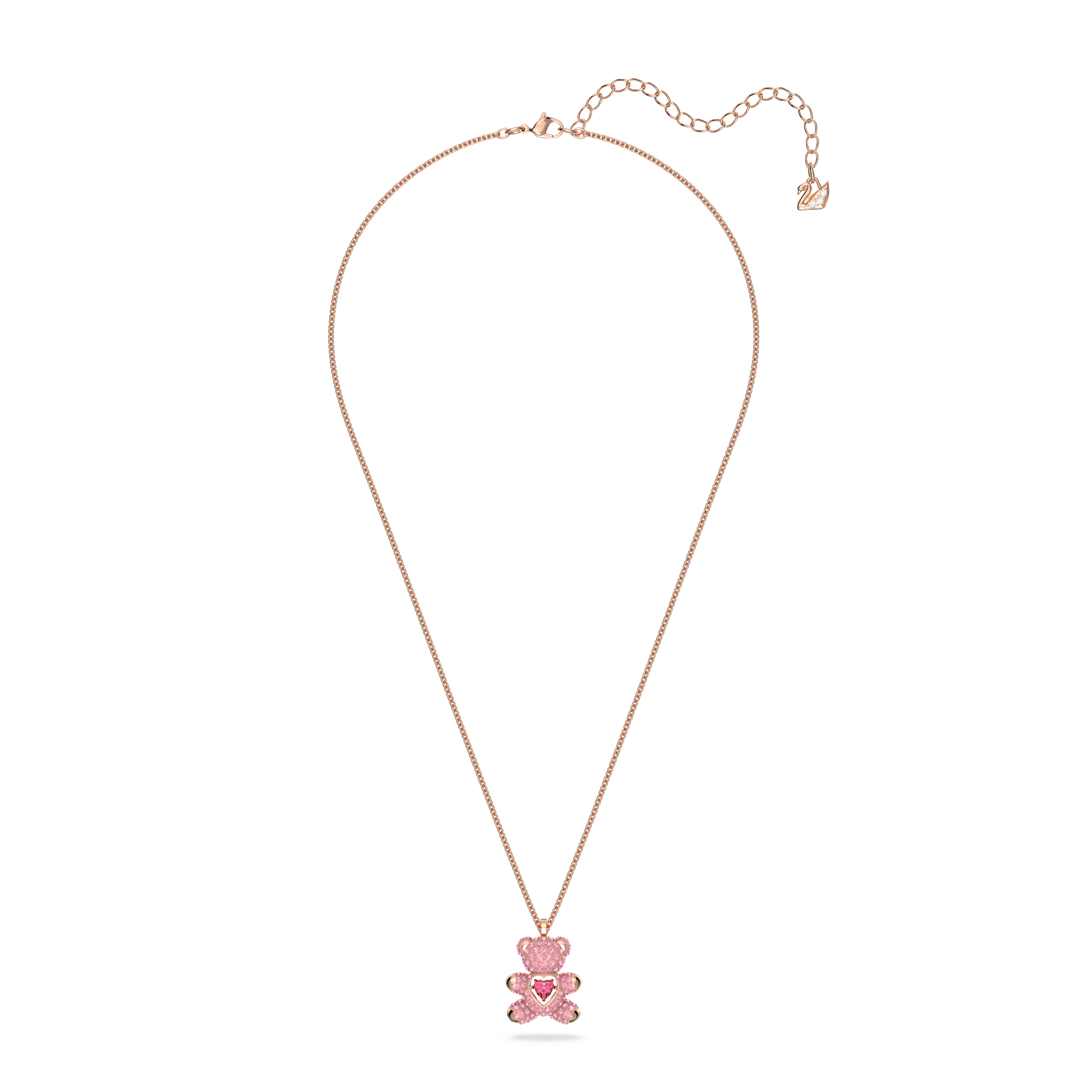 Bu oyuncu kolye ucu ile yüzünüze gülümsemelere ilham verin. Bu üç boyutlu ayıcık, açık pembe kristal Pointiage® ile çevrelendi ve yonca şeklindeki canlı pembe “dans eden” taşı elinde tutuyor. Pembe altın rengi kaplama zincirle tamamlanan bu benzersiz tasarım, şans ve sevgiyi bir araya getiriyor.