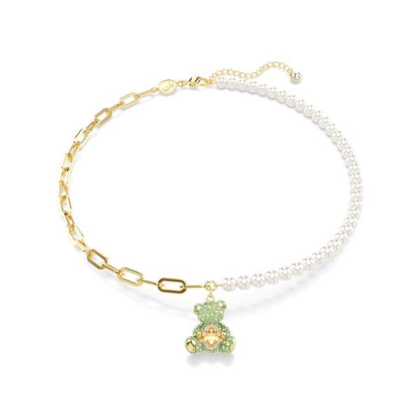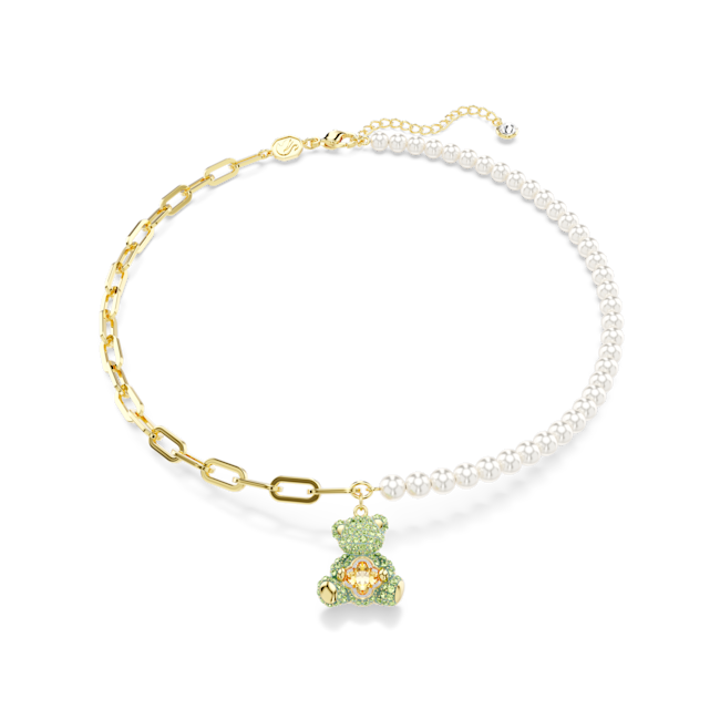 İçinizi sıcacık yapacak bu sevimli oyuncak ayı kolye ucu ile sevdiklerinizin yüzüne bir tebessüm kondurun. Kalpleri ısıtan tasarım, Swarovski Kristal İnciler'den oluşan bir kolye ile kullanılırken yeşil kristallerle süslenmiş oyuncak ayı motifi altın rengi kaplama bir zincir ile tamamlanıyor. Parçanın ortasındaki oyuncak ayı, ışığı sürekli yakalamayı başaran, hareketli sarı renkli bir Swarovski Zirkonya taş tutuyor. Seti tamamlamak için parçayı uyumlu bileklik ile birlikte takın.