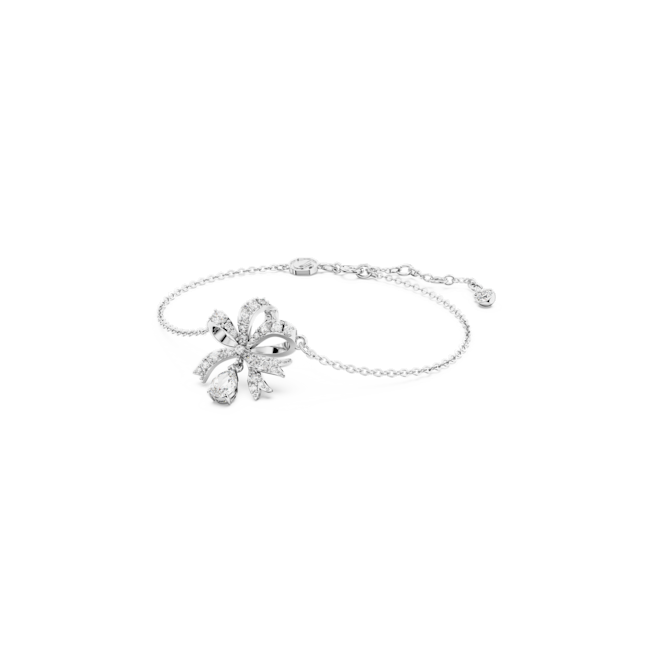 Bu Hyperbola bileklik, en küçük detaylarıyla bile büyük bir etki yaratıyor. Göz alıcı bir şekilde biçimlendirilmiş parça, fiyonklardan ilham alan şeklini rodyum kaplama ile gözler önüne sermesinin yanı sıra chattonage tekniğiyle dizilen berrak taşlarla taçlandırıldı. Armut şeklindeki tekli taş görünüme parlak bir son dokunuş katıyor. Bu mücevher parçasını ahenkli bir görünüm yaratmak için uyumlu bir küpeyle kullanın veya samimi bir hediye olarak verin.